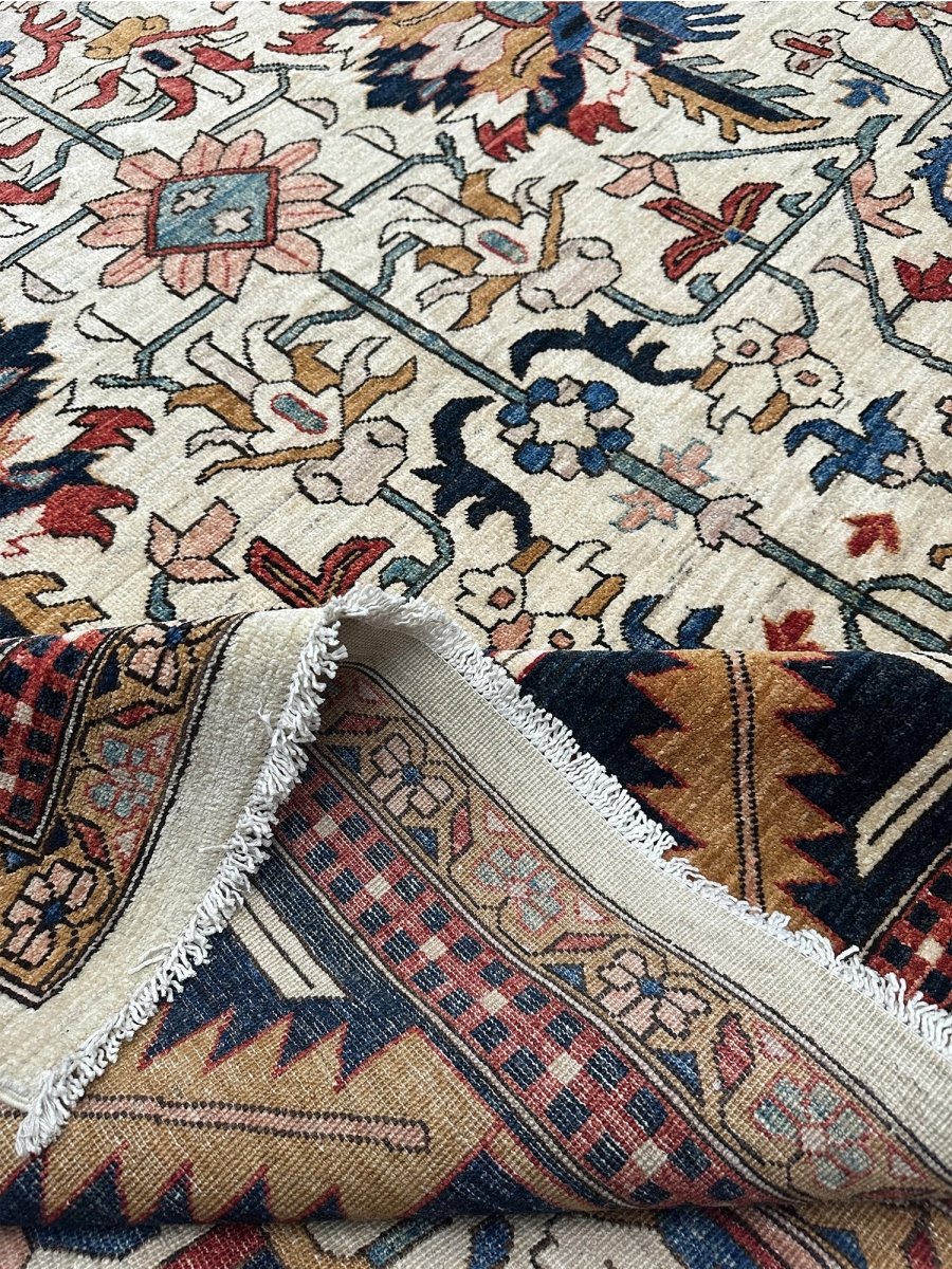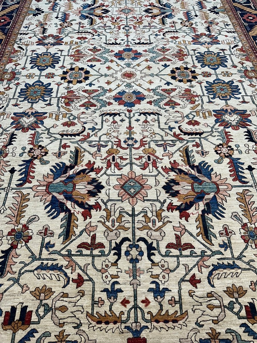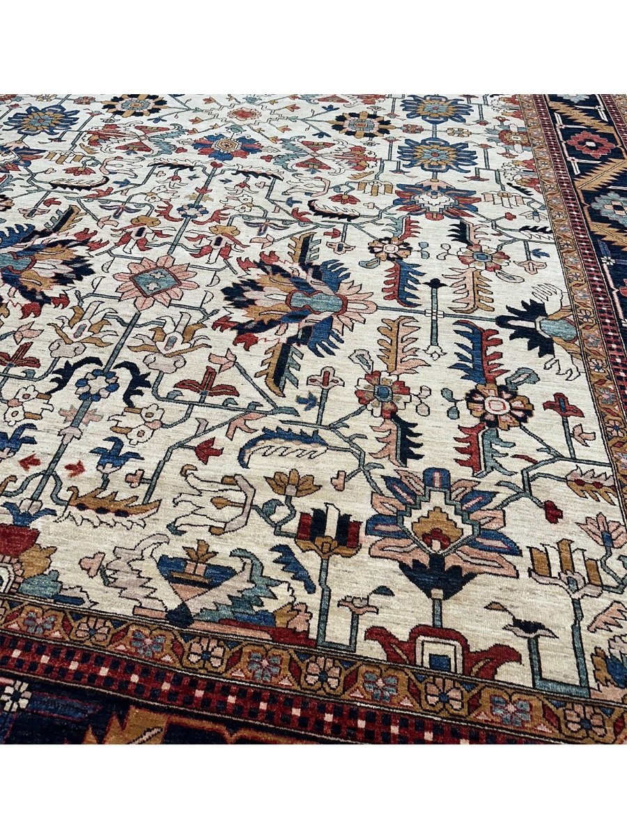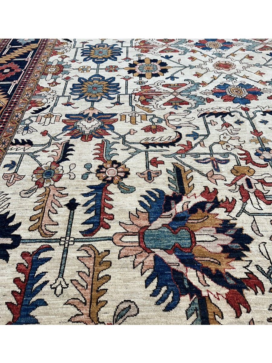 Immerse your space in the magnificent grandeur of this 12x18 Persian Serapi Style rug. This awe-inspiring piece, hand-knotted by skilled artisans in Pakistan, captures the esteemed aesthetics of classic Serapi designs. The rug features an intricate geometric pattern, a hallmark of traditional artistry, beautifully rendered in a rich color palette including classic blue, red, green, and cream, set against an elegant field. Its vast size makes it a truly commanding presence crafted from durable wool, this rug promises both enduring beauty and luxurious comfort, destined to be a cherished heirloom for generations to come. Shop now to avail the benefit of quick delivery to your doorstep.