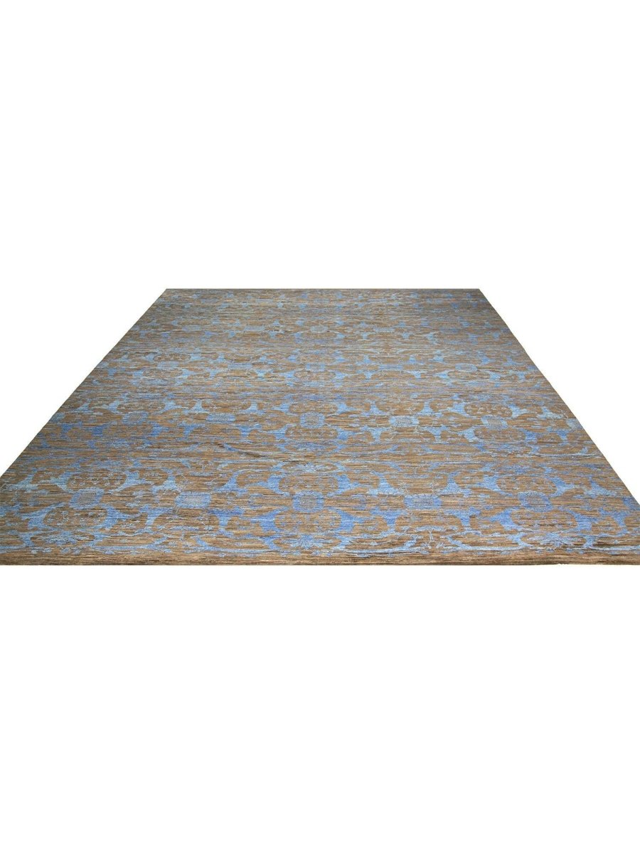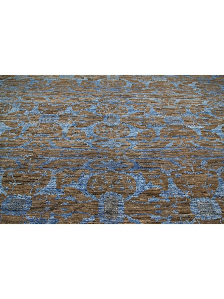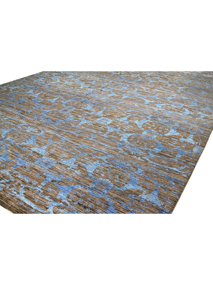 Immerse your space in the serene elegance of this magnificent 12x18 Transitional Oushak Area Rug. Hand-knotted by skilled artisans in India from premium wool, this new rug offers a soft underfoot feel coupled with exceptional durability. The captivating geometric pattern, rendered in soothing tones of light blue, brown, and beige, creates a harmonious and inviting visual appeal that effortlessly enhances any room. Its expansive size makes it an ideal addition for grand living rooms, providing comfort and elegance to spacious dining areas, or bringing a serene ambiance to a large bedroom. This versatile rug seamlessly integrates into various decor styles, adding a touch of refined artistry to your home. This hand-knotted rug is a true testament to the skilled artistry of Indian weaving, promising to be a cherished element that elevates the aesthetic and comfort of your home.