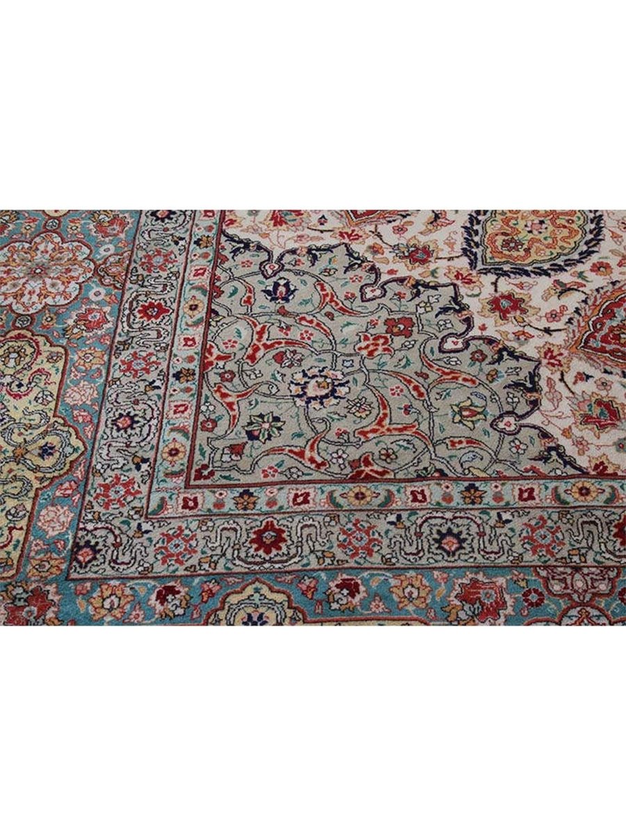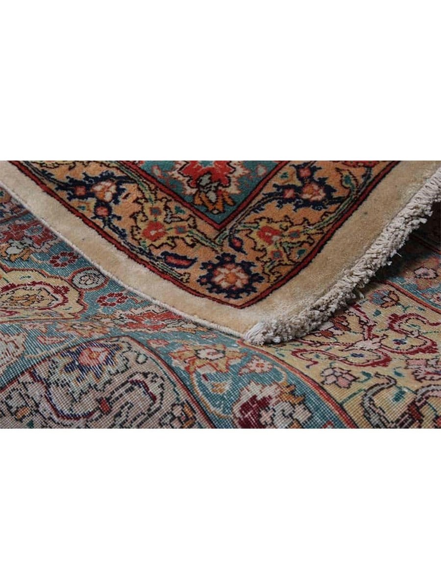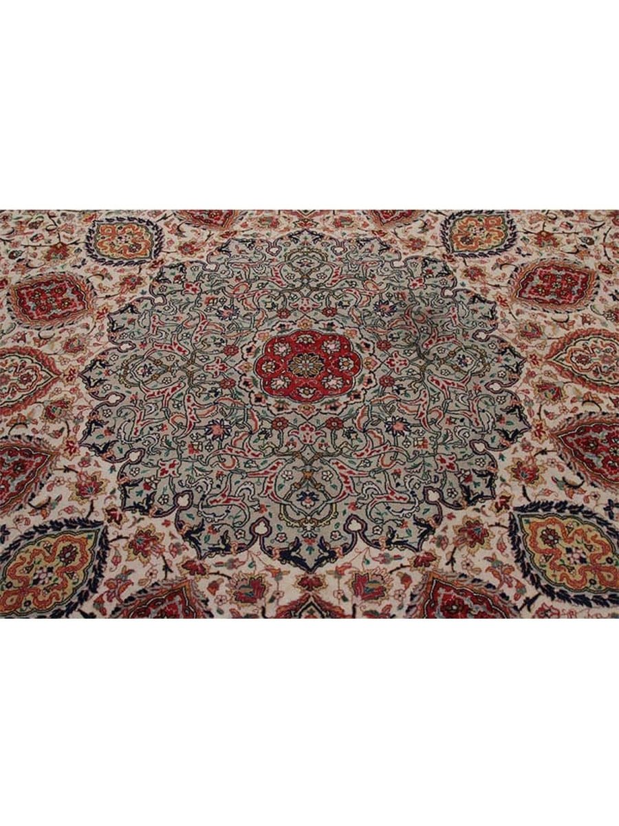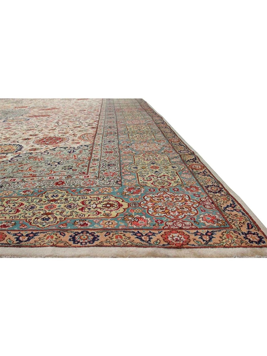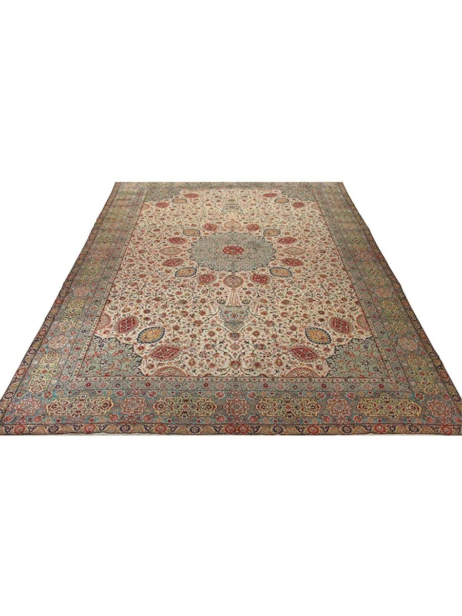 Experience elegance with this magnificent 12x19 Old Persian Tabriz rug. Hand-knotted in Persia from fine wool, it features a breathtaking central medallion and elaborate floral designs. The pattern unfolds across a serene ivory field, adorned with shades of red, soft pink, light blue, green, and beige accents. This large size is perfect for grand living rooms or formal dining halls, transforming any area. The meticulous craftsmanship ensures both beauty and durability. This stunning piece is a genuine antique, bringing timeless artistry and warmth to your space for generations to come.