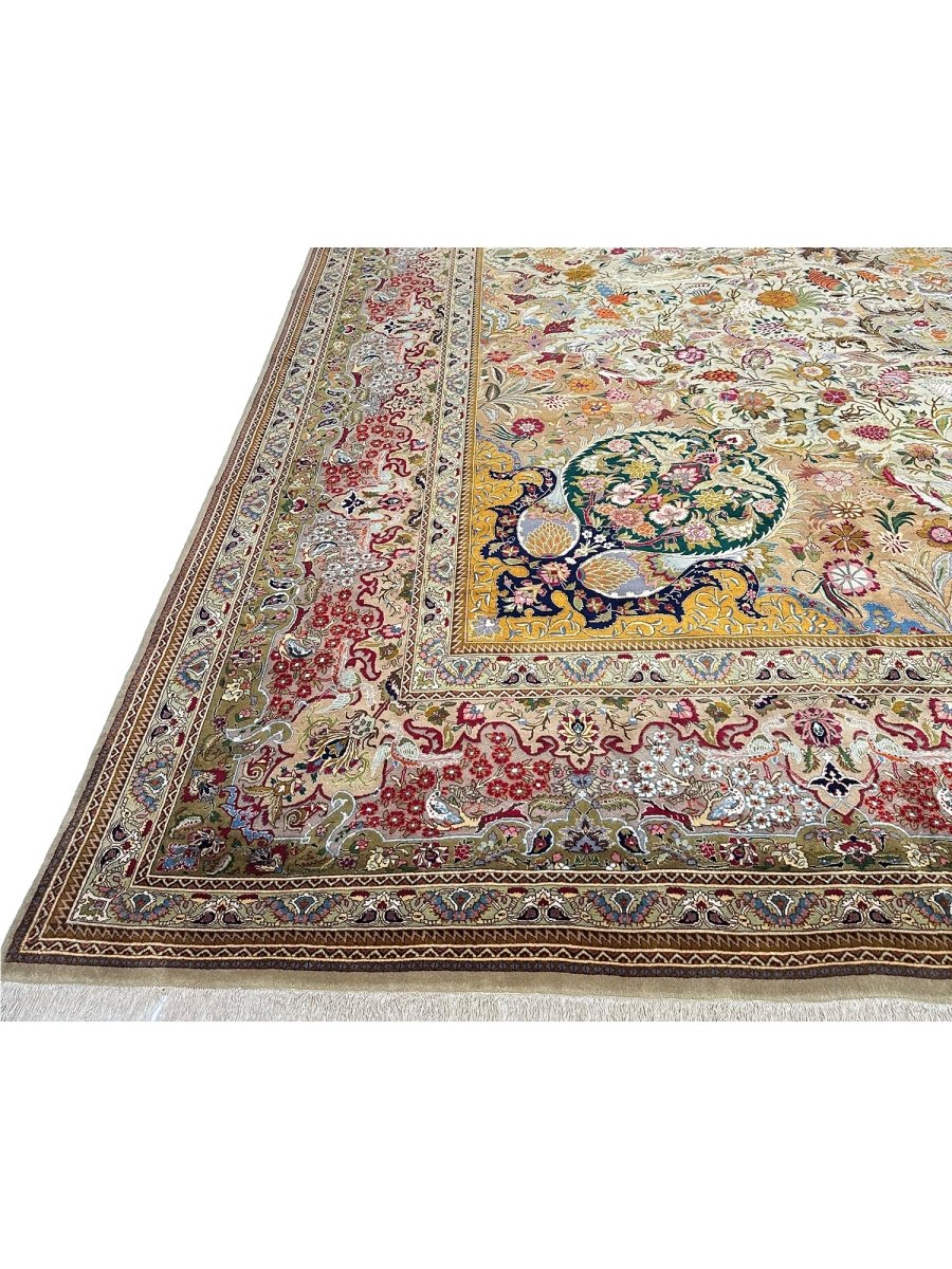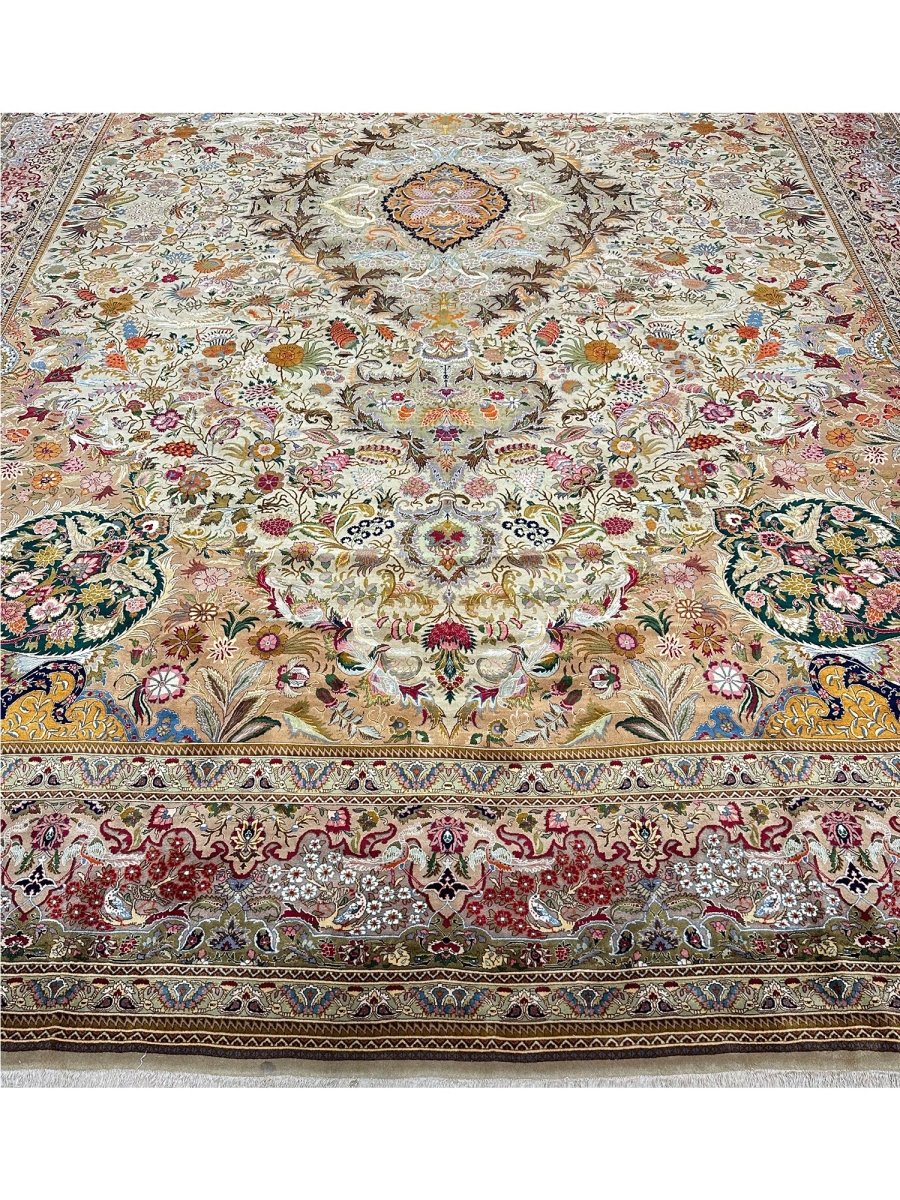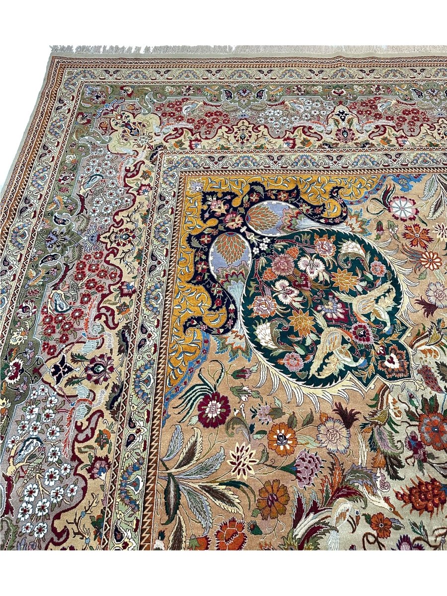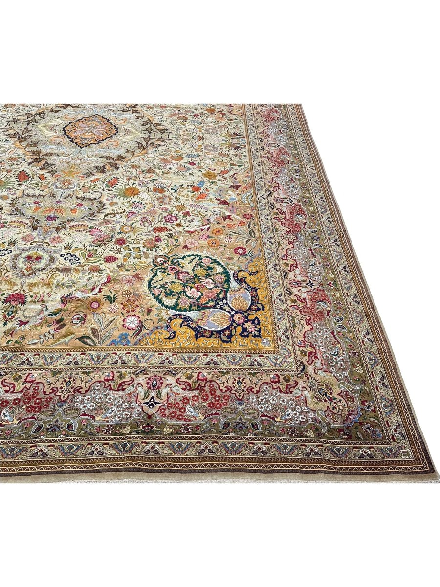 Step into elegance with this magnificent 13' x 20' Old Persian Tabriz rug. Hand-knotted in Persia from fine wool, it showcases an exquisite central medallion pattern. The design unfolds with intricate floral motifs across a captivating gold field and rich borders, detailed in red, blue, green, and orange. This substantial size is perfect for anchoring extremely large spaces, such as grand living rooms or ballrooms, adding timeless beauty and luxurious comfort. The meticulous craftsmanship ensures lasting quality. Bringing this rug into your home adds a piece of art and history, a true testament to Persian weaving tradition. Enjoy its enduring charm.
