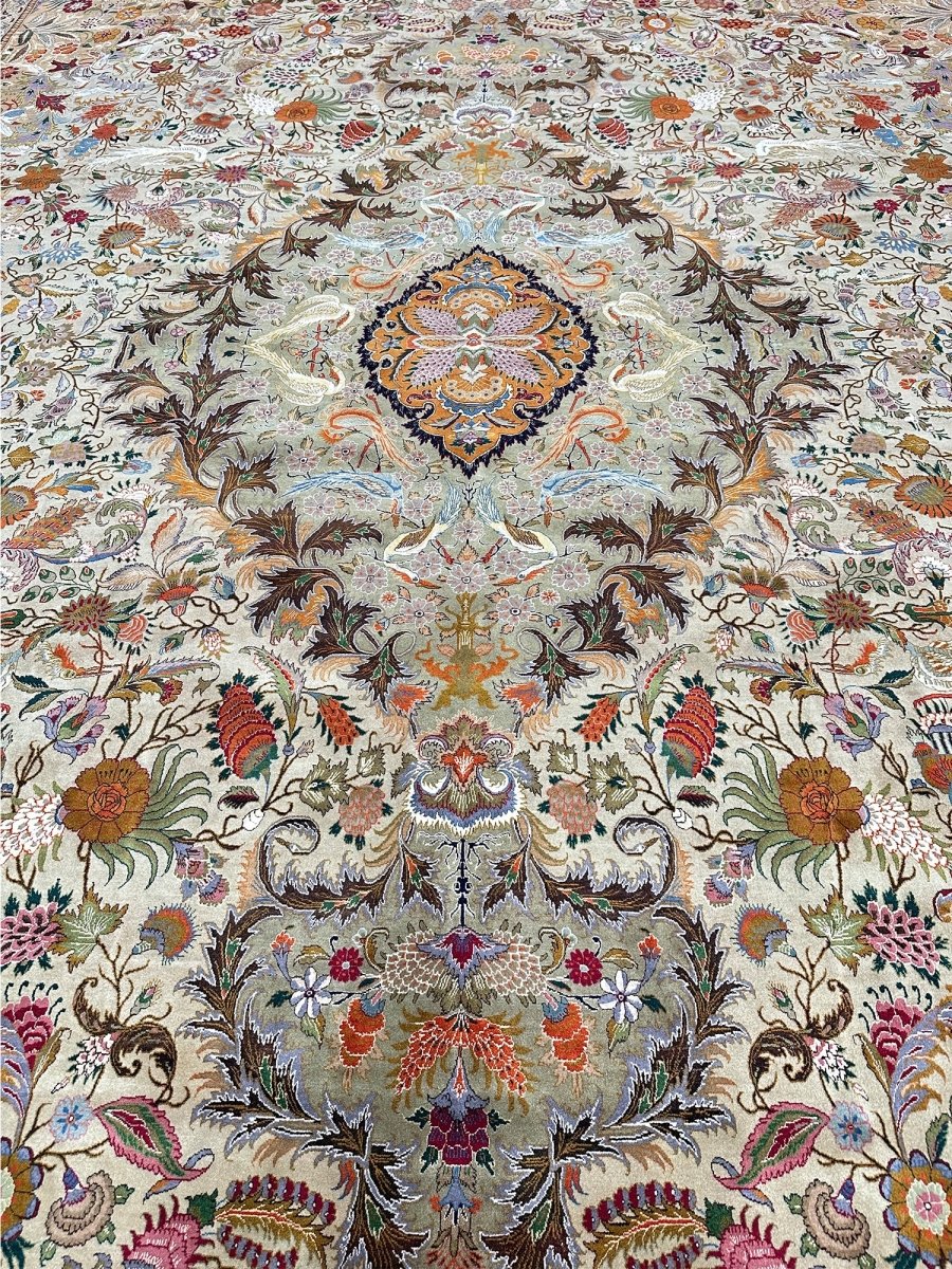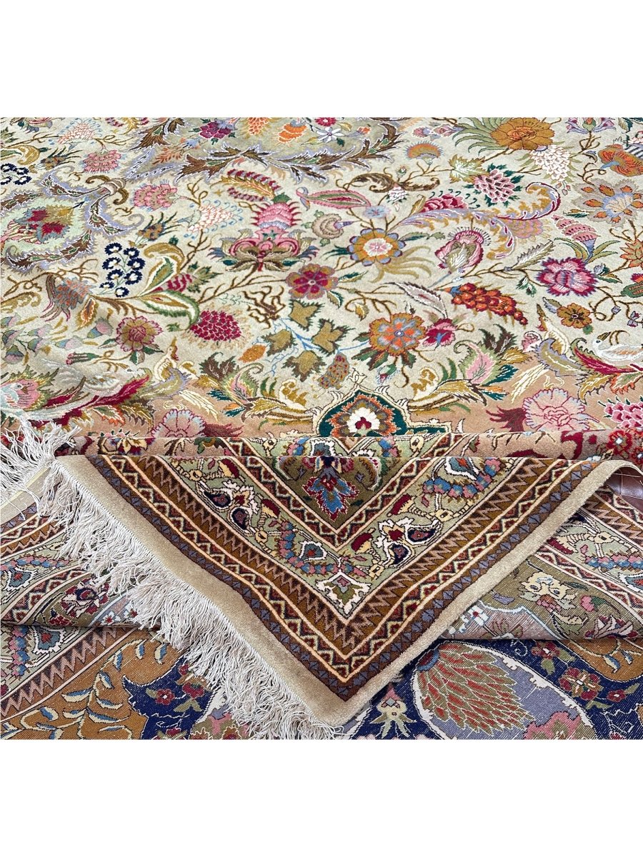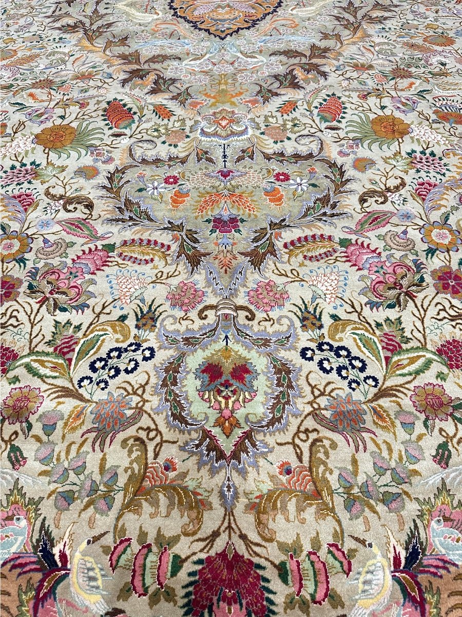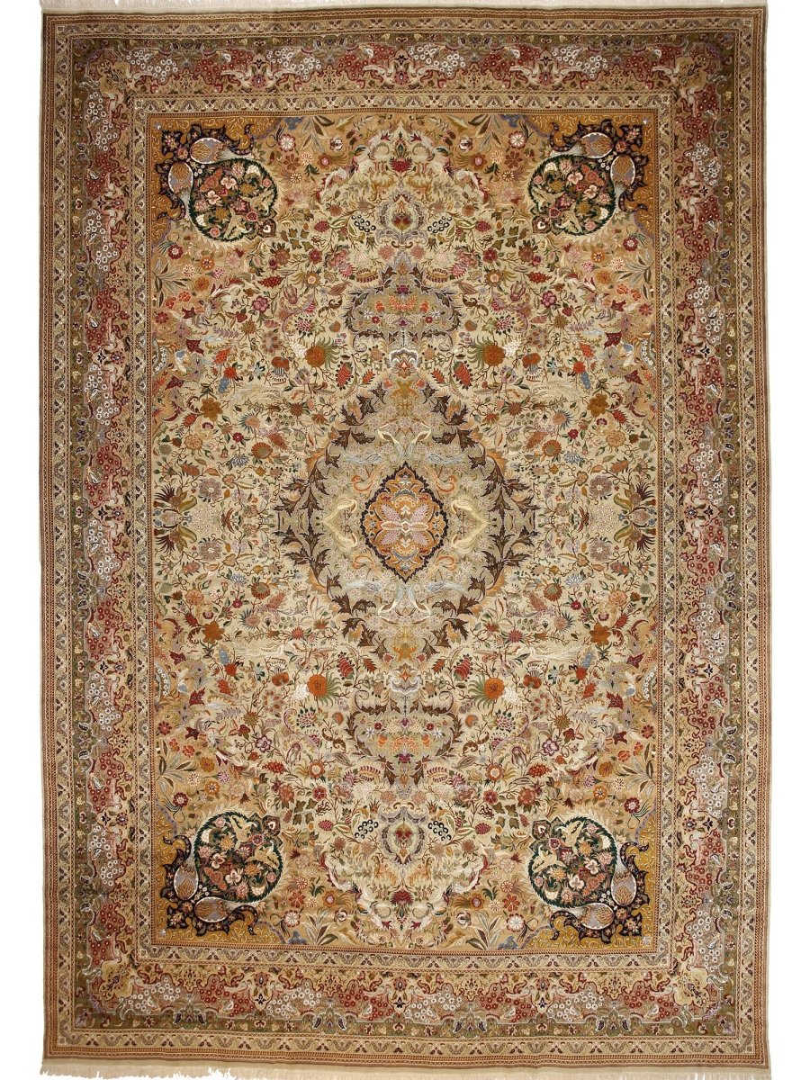 Step into elegance with this magnificent 13' x 20' Old Persian Tabriz rug. Hand-knotted in Persia from fine wool, it showcases an exquisite central medallion pattern. The design unfolds with intricate floral motifs across a captivating gold field and rich borders, detailed in red, blue, green, and orange. This substantial size is perfect for anchoring extremely large spaces, such as grand living rooms or ballrooms, adding timeless beauty and luxurious comfort. The meticulous craftsmanship ensures lasting quality. Bringing this rug into your home adds a piece of art and history, a true testament to Persian weaving tradition. Enjoy its enduring charm.