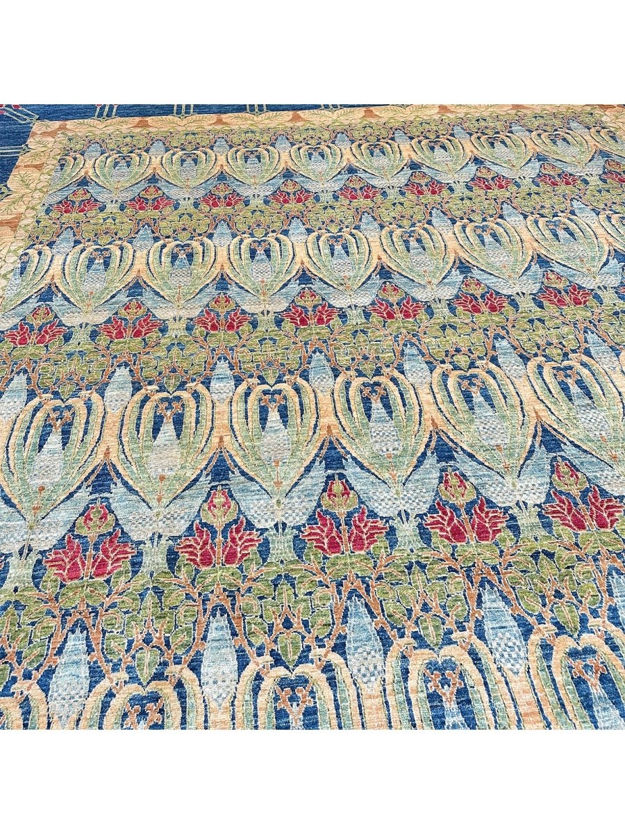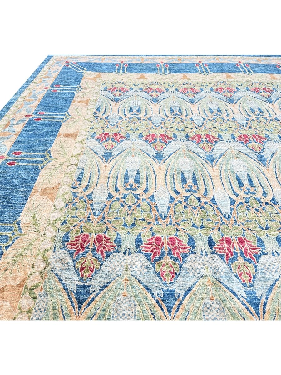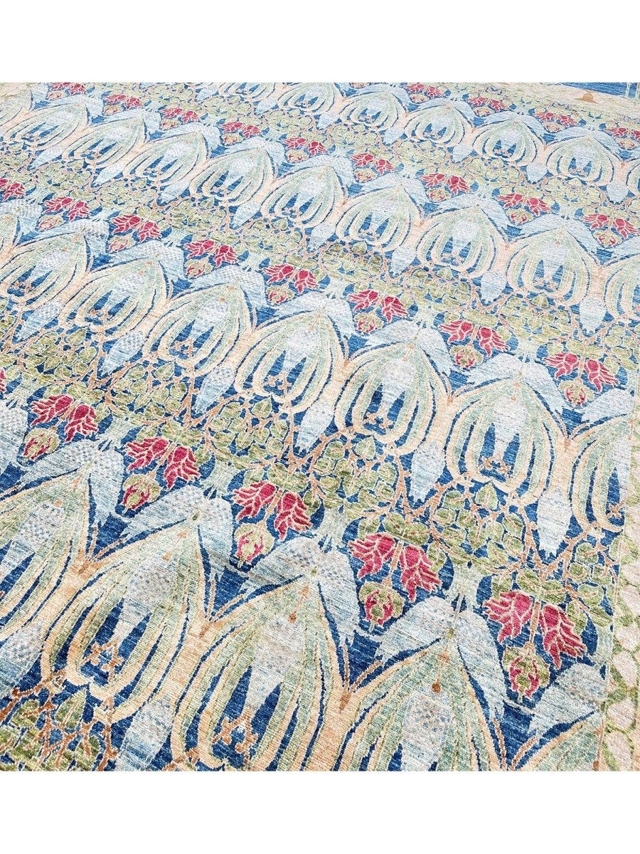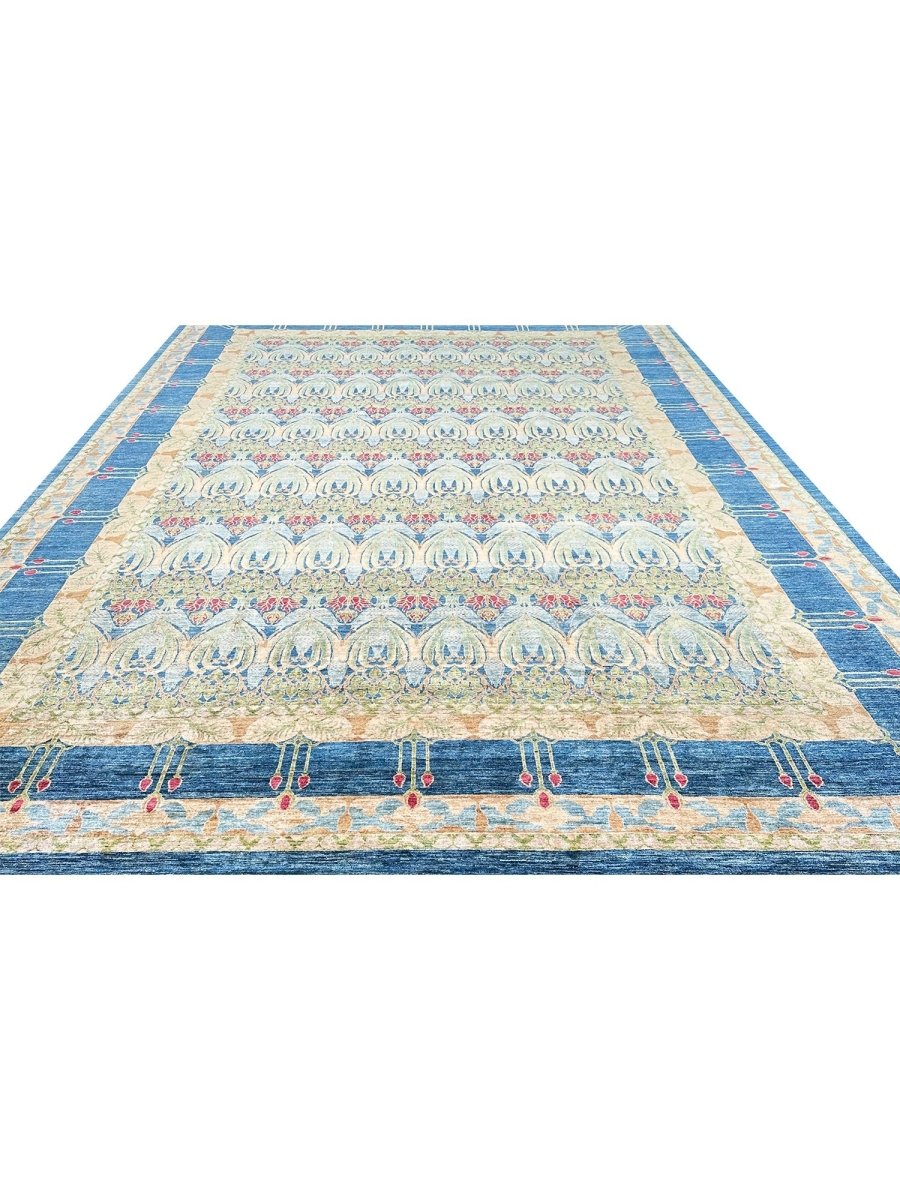 Enhance your large living room, dining room, and spacious bedrooms with the distinctive charm of this 14x20 Arts and Crafts area rug. Hand-knotted in Pakistan from premium wool, this rug showcases a beautiful all-over geometric pattern with repeating motifs. The captivating color palette of deep blue, light blue, beige, light green, and red adds a touch of subtle elegance to any space. Crafted for durability and style, this Arts and Crafts rug will be a cherished addition to your home. Its soft texture and intricate detailing make it a cozy yet refined choice for high-traffic areas. Shop now and get free delivery to your doorstep in the United States. Experience timeless design and comfort in one elegant piece.