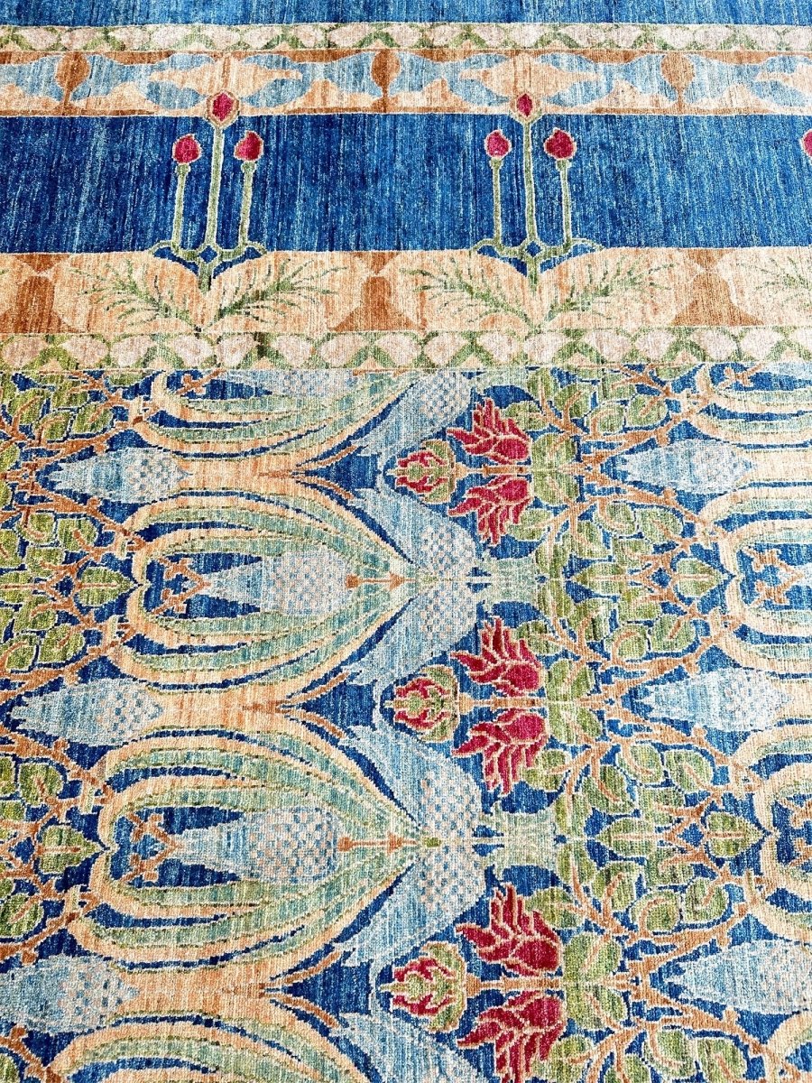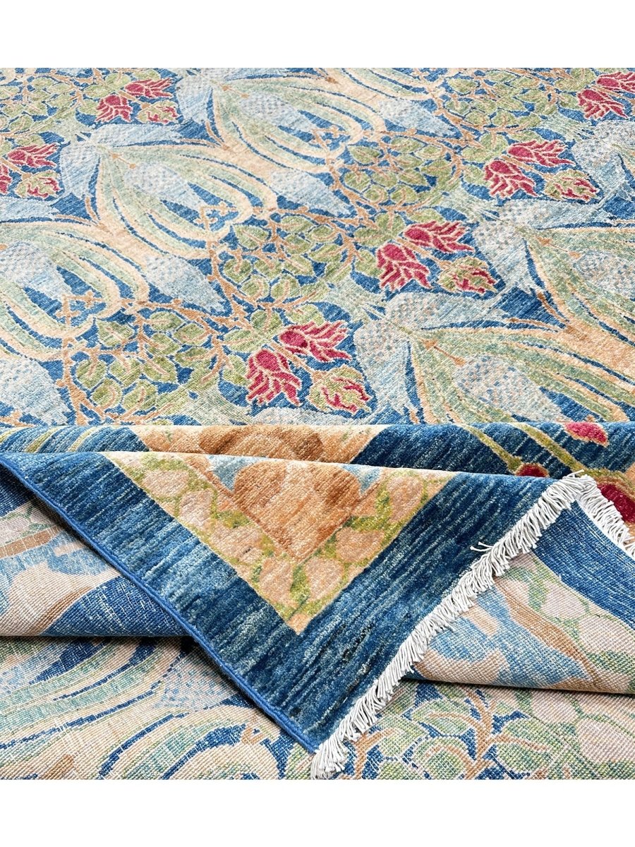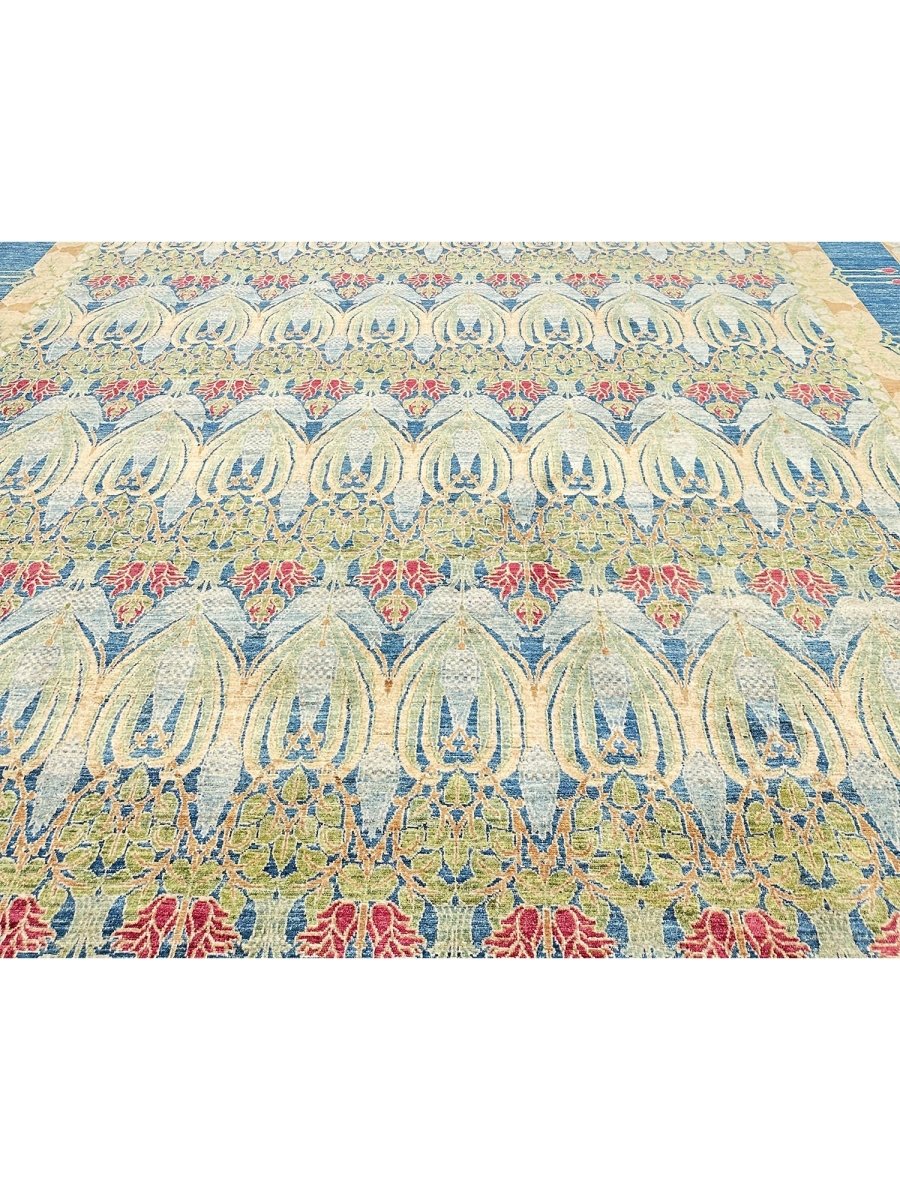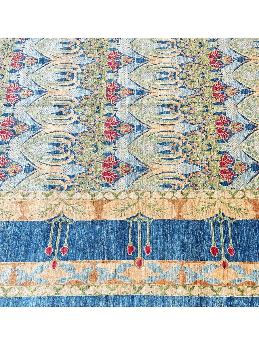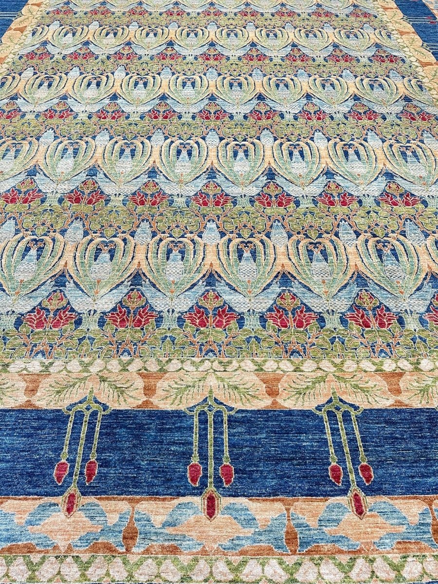 Enhance your large living room, dining room, and spacious bedrooms with the distinctive charm of this 14x20 Arts and Crafts area rug. Hand-knotted in Pakistan from premium wool, this rug showcases a beautiful all-over geometric pattern with repeating motifs. The captivating color palette of deep blue, light blue, beige, light green, and red adds a touch of subtle elegance to any space. Crafted for durability and style, this Arts and Crafts rug will be a cherished addition to your home. Its soft texture and intricate detailing make it a cozy yet refined choice for high-traffic areas. Shop now and get free delivery to your doorstep in the United States. Experience timeless design and comfort in one elegant piece.