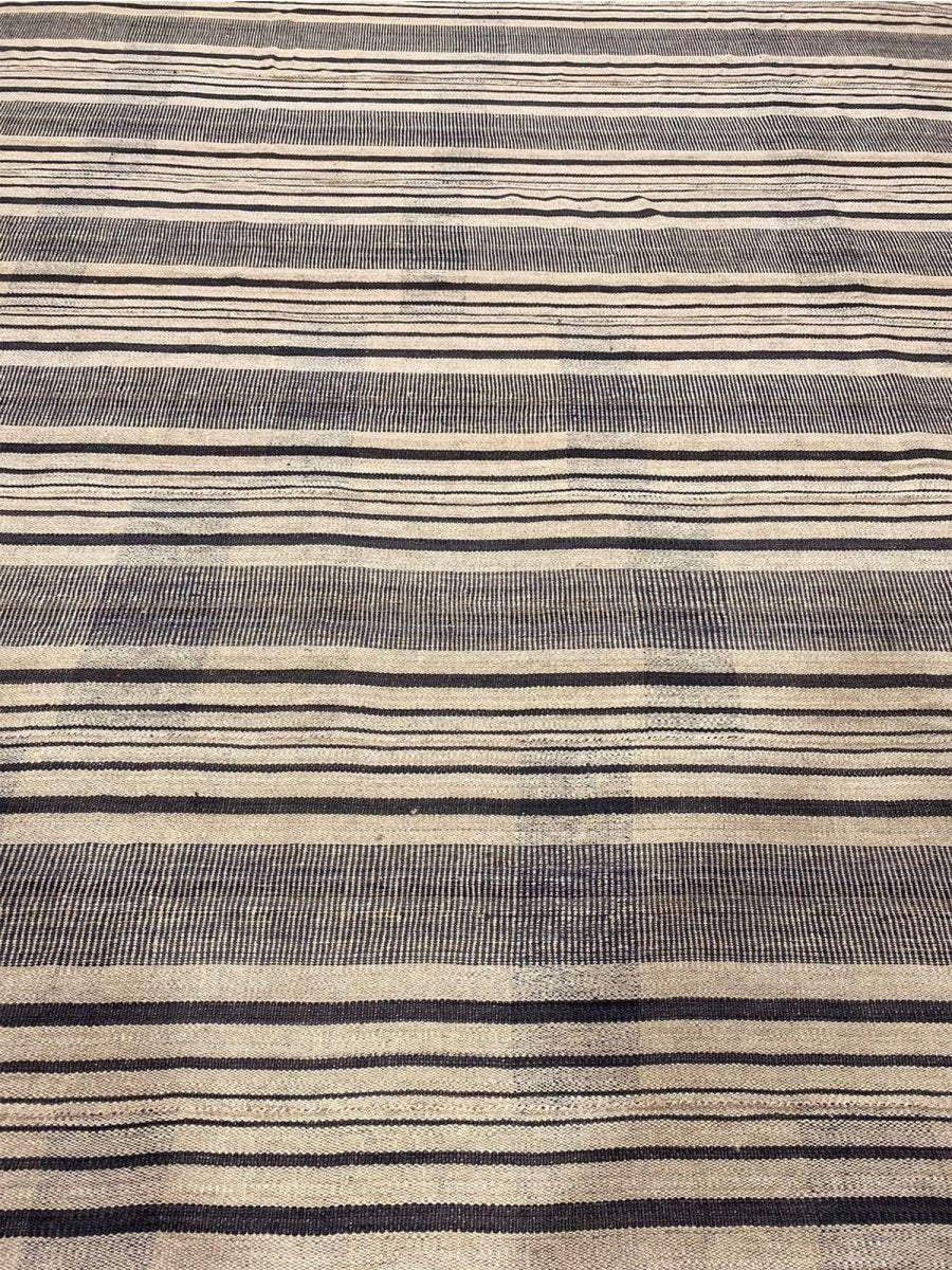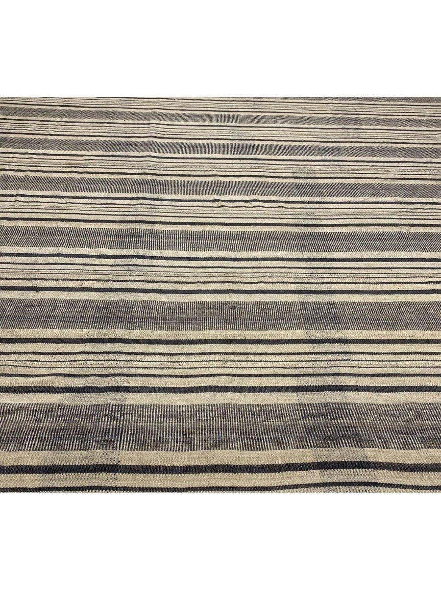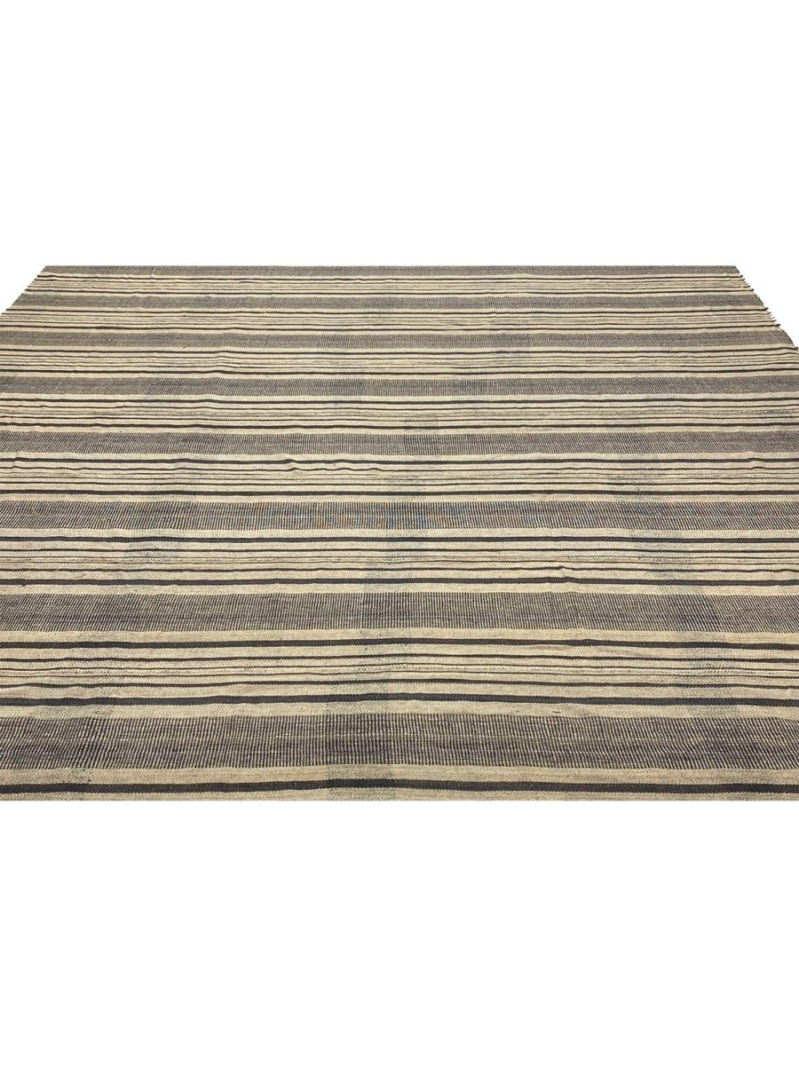 This 13x13 Old Persian Kilim Rug is a stunning example of classic Persian craftsmanship, hand-knotted with precision and care. Its sophisticated beige and black striped design brings elegance to any space. Its neutral tones make it a versatile choice, complementing sleek minimalist interiors and classic, rustic aesthetics.
