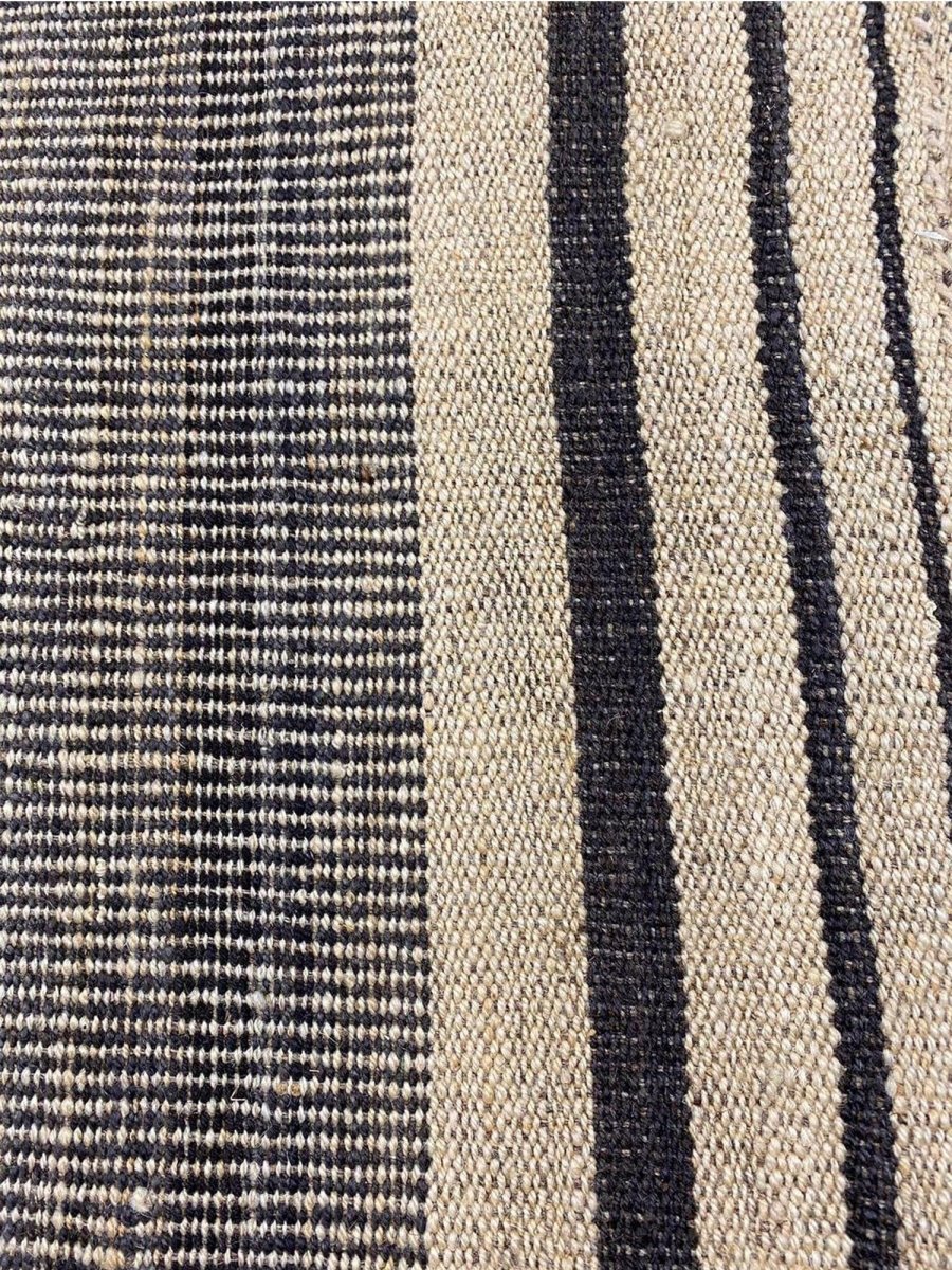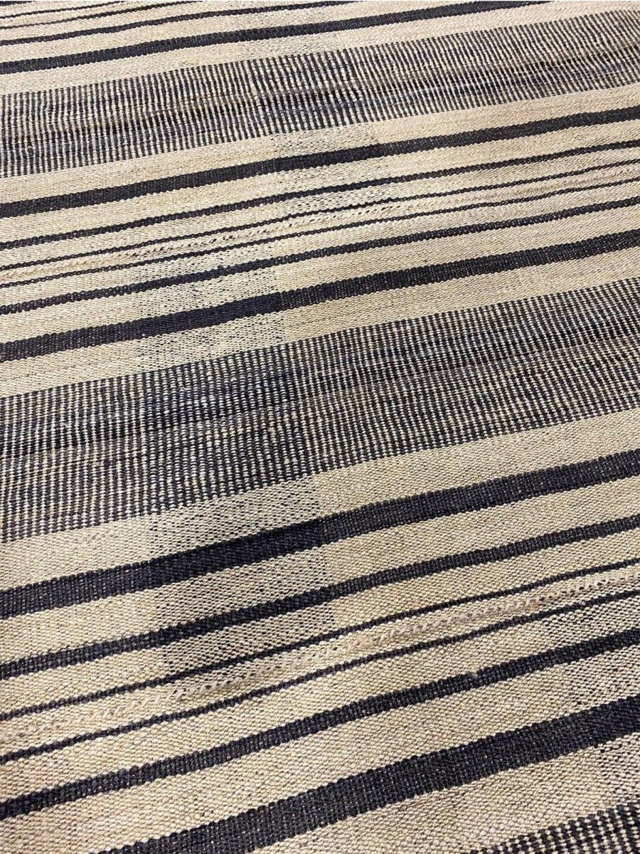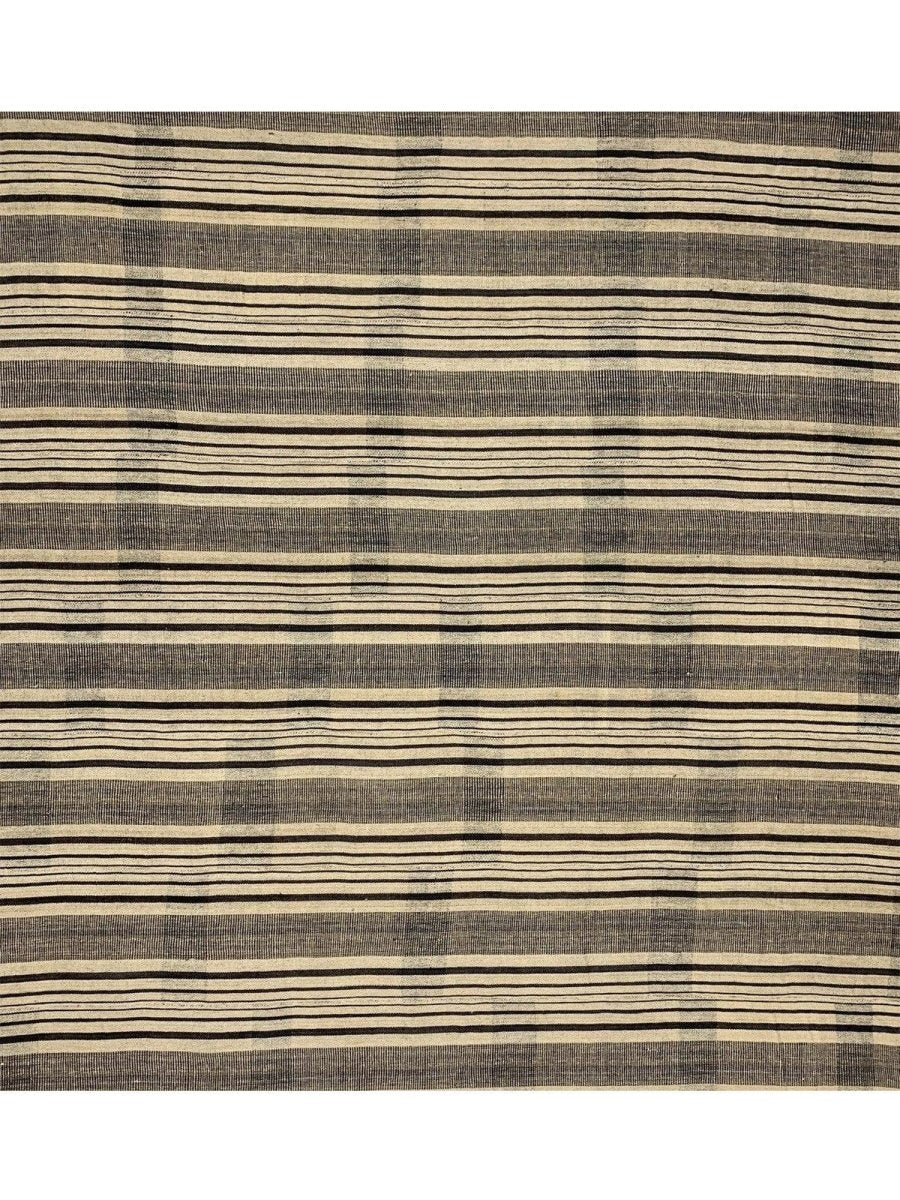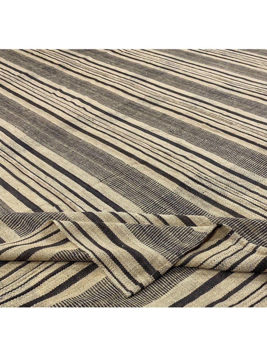 This 13x13 Old Persian Kilim Rug is a stunning example of classic Persian craftsmanship, hand-knotted with precision and care. Its sophisticated beige and black striped design brings elegance to any space. Its neutral tones make it a versatile choice, complementing sleek minimalist interiors and classic, rustic aesthetics.