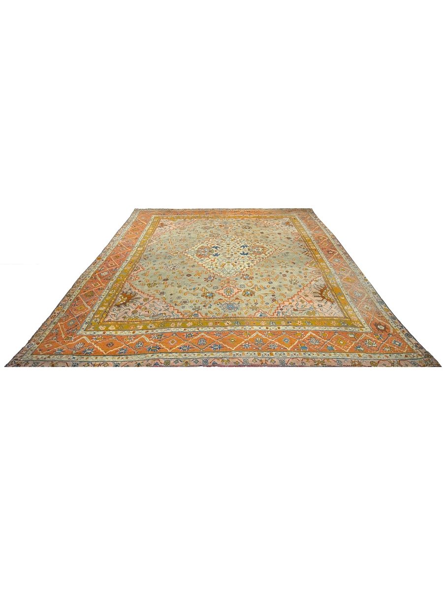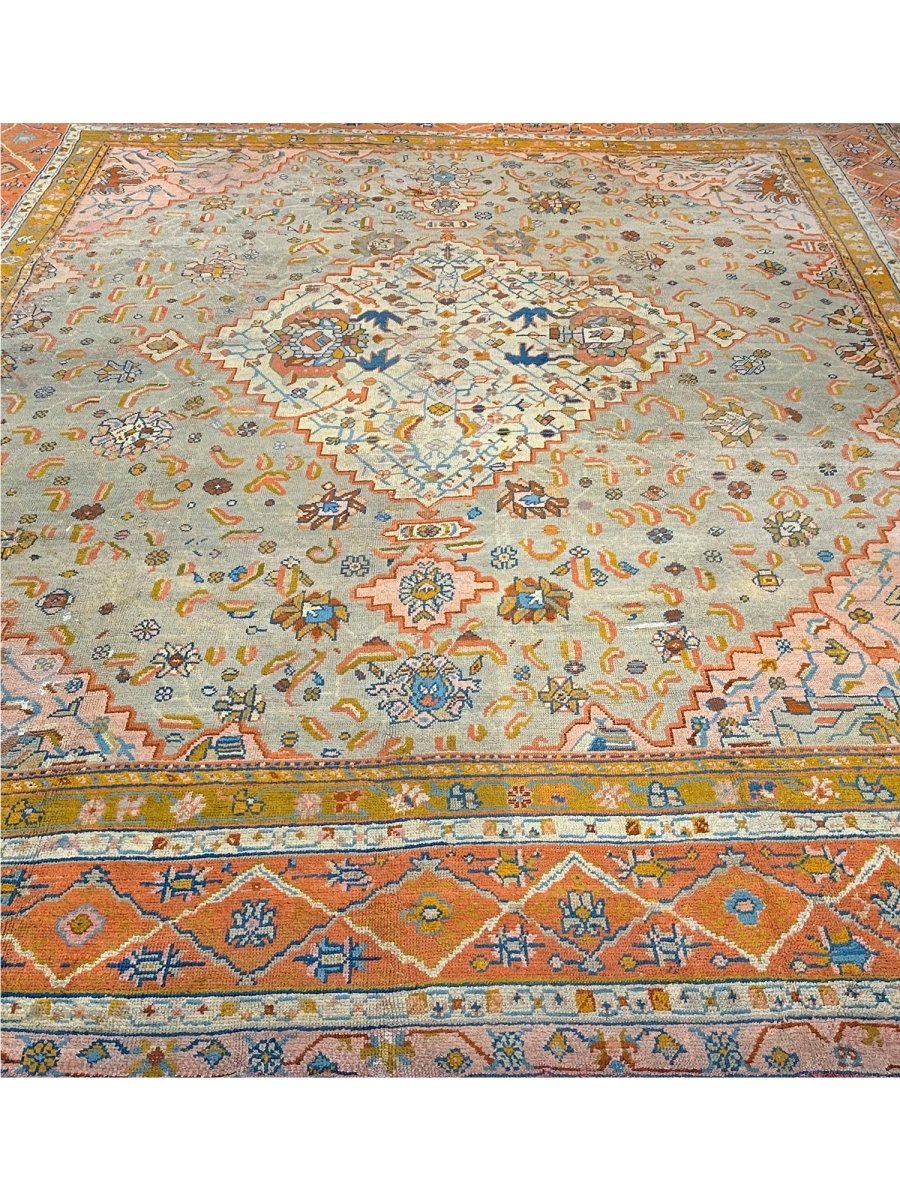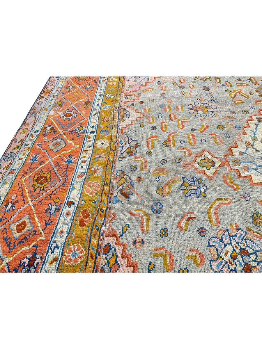 Experience the epitome of elegance and heritage with this breathtaking 16x18 Antique Turkish Oushak area rug. Hand-knotted in Turkey using classic techniques. The intricate pattern, featuring delicate motifs and subtle geometric shapes, creates a visually striking effect that's sure to impress. The beautiful, light brown base in the center of the rug provides a warm and inviting focal point, while the orange-colored border adds a touch of vibrancy and energy. As an antique piece, it has a unique story to tell and a level of craftsmanship that is hard to find. Whether placed in a large living room or a dining room, this rug is sure to become a stunning focal point that ties the entire space together.