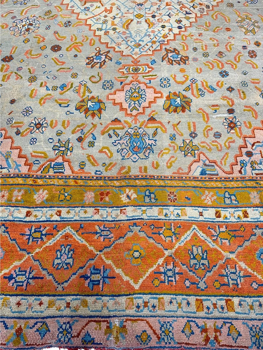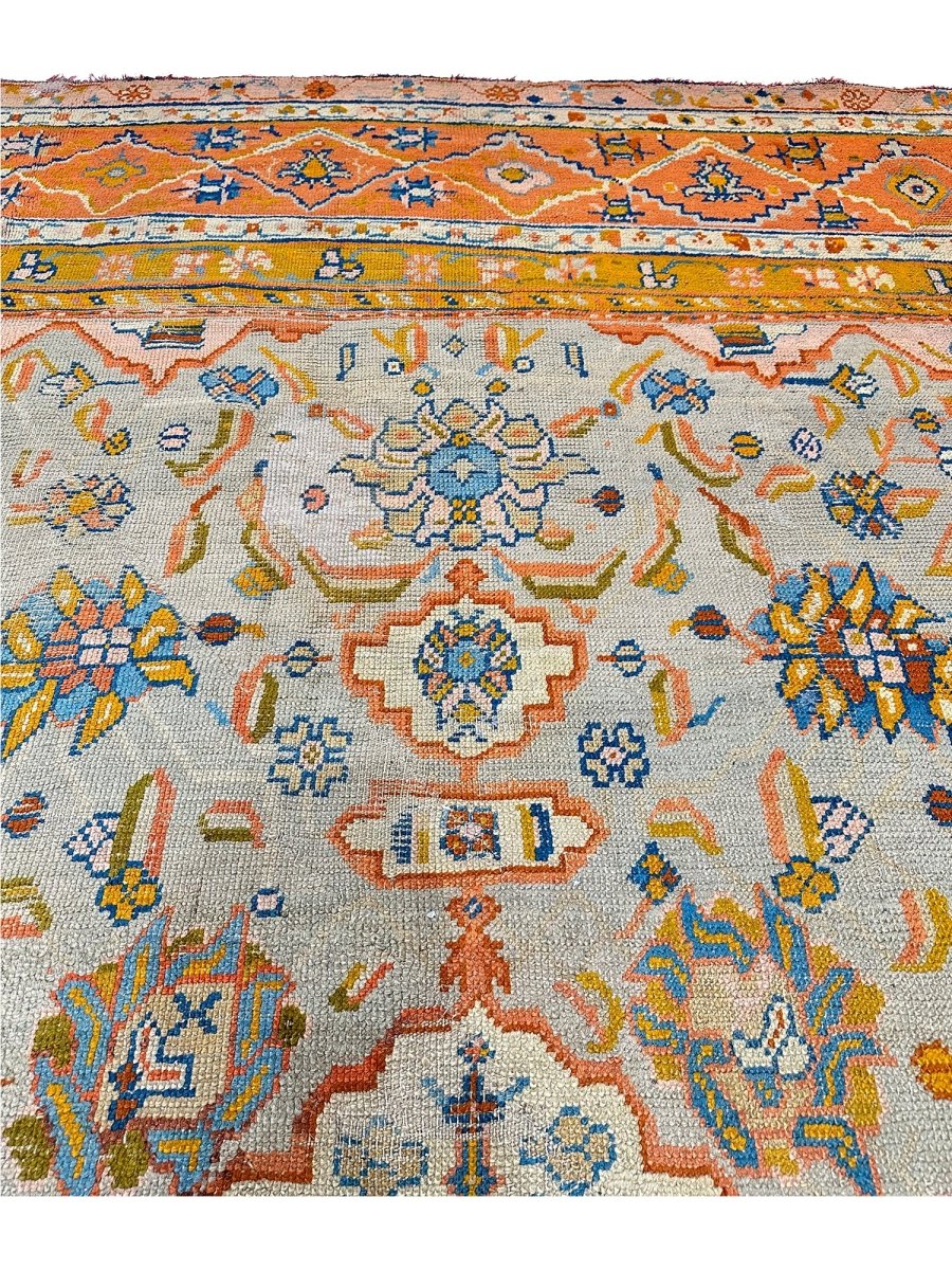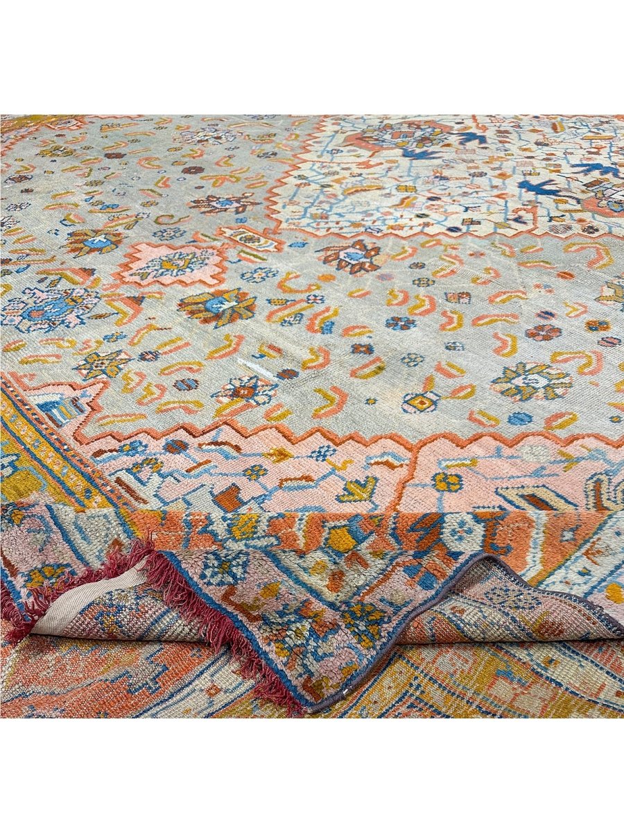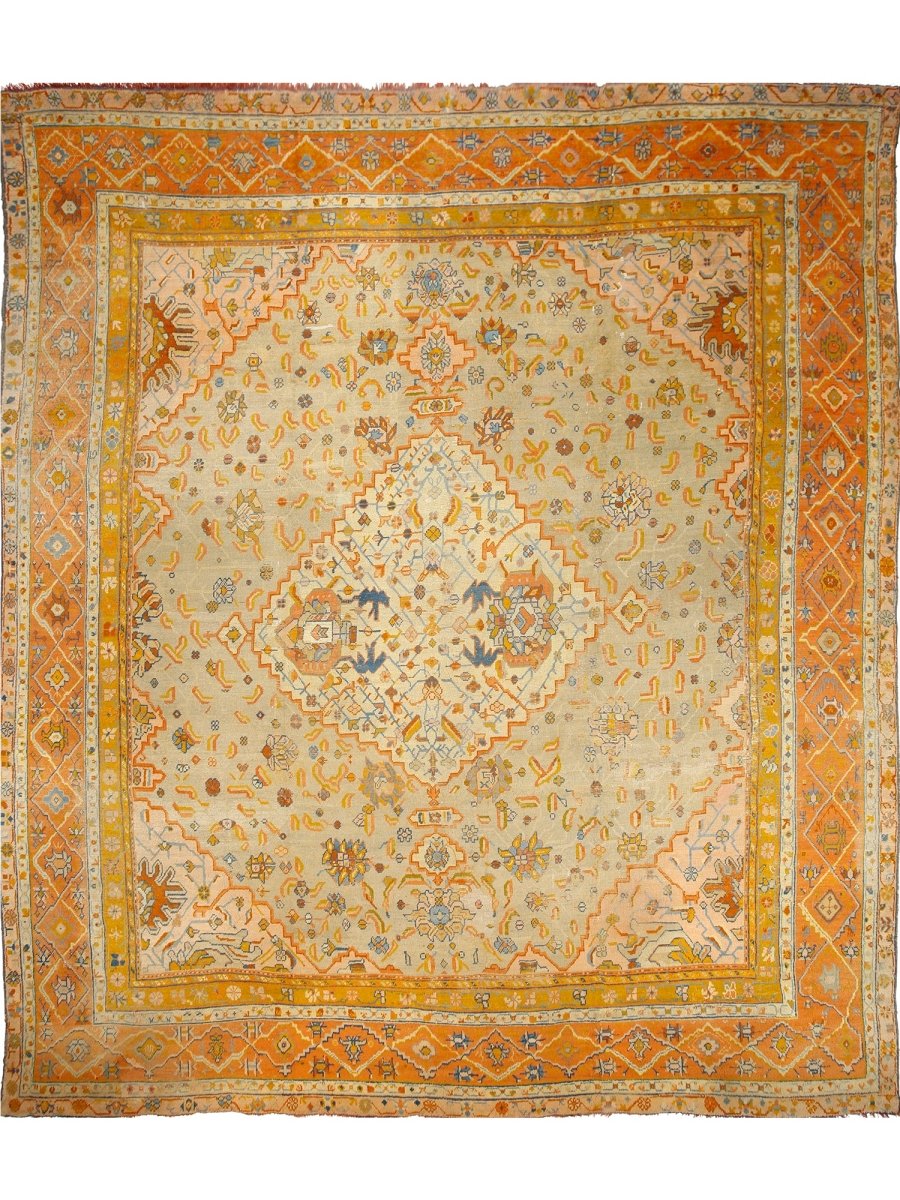 Experience the epitome of elegance and heritage with this breathtaking 16x18 Antique Turkish Oushak area rug. Hand-knotted in Turkey using classic techniques. The intricate pattern, featuring delicate motifs and subtle geometric shapes, creates a visually striking effect that's sure to impress. The beautiful, light brown base in the center of the rug provides a warm and inviting focal point, while the orange-colored border adds a touch of vibrancy and energy. As an antique piece, it has a unique story to tell and a level of craftsmanship that is hard to find. Whether placed in a large living room or a dining room, this rug is sure to become a stunning focal point that ties the entire space together.