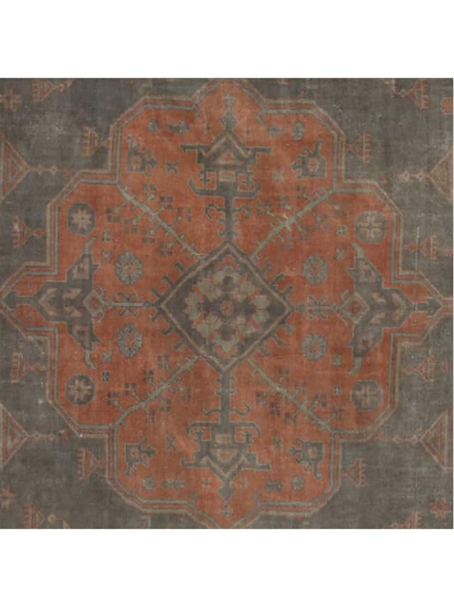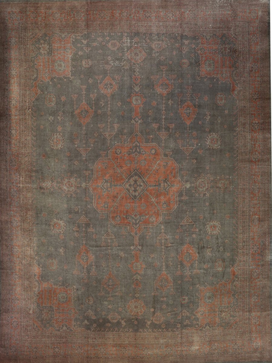 This exceptional 17x20 Antique Turkish Oushak area rug adds a profound touch of sophistication and timeless elegance to your home. The design prominently features a grand central medallion, surrounded by an intricate geometric pattern of delicate motifs, creating a visually striking effect that will impress. Its unique color palette, a harmonious blend of muted gray, warm orange, and balancing beige, infuses the rug with personality and character, making it an authentic one-of-a-kind piece.