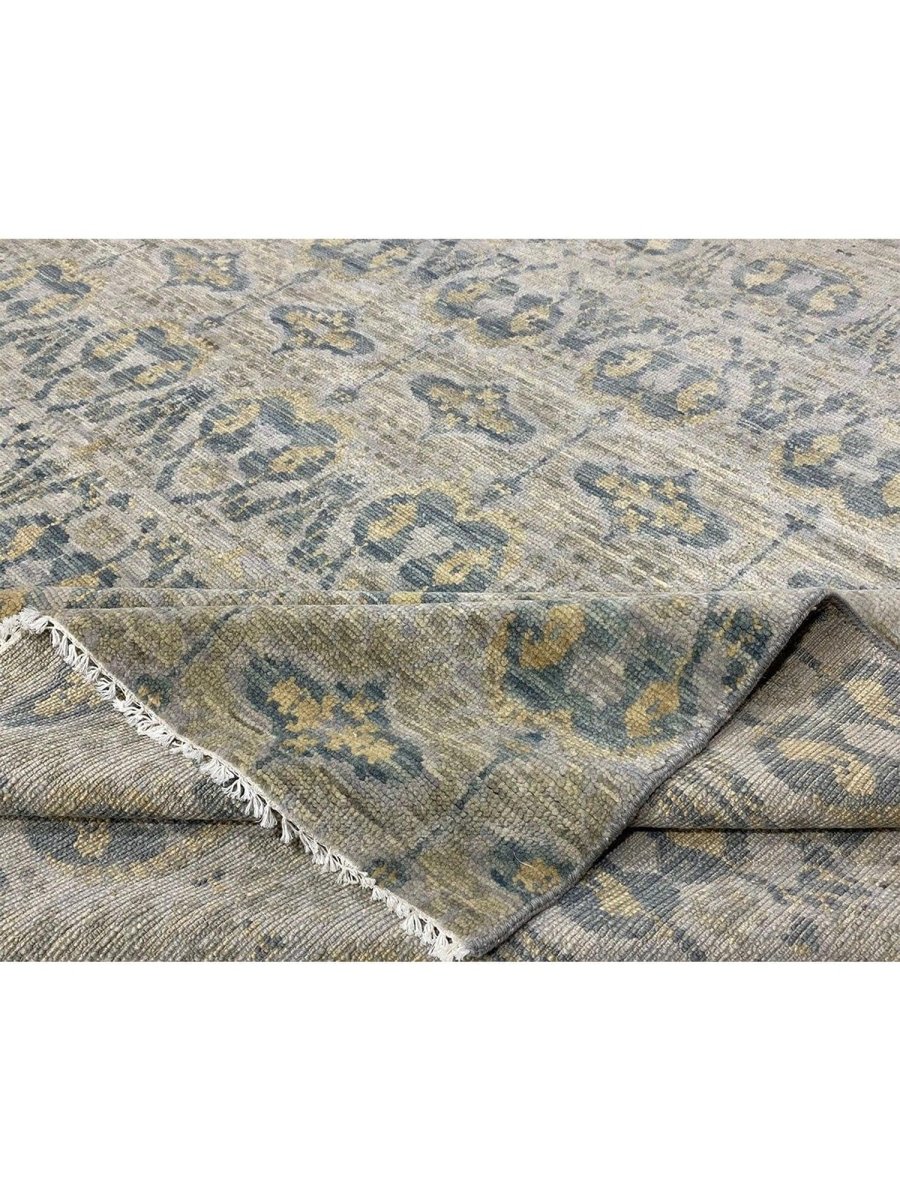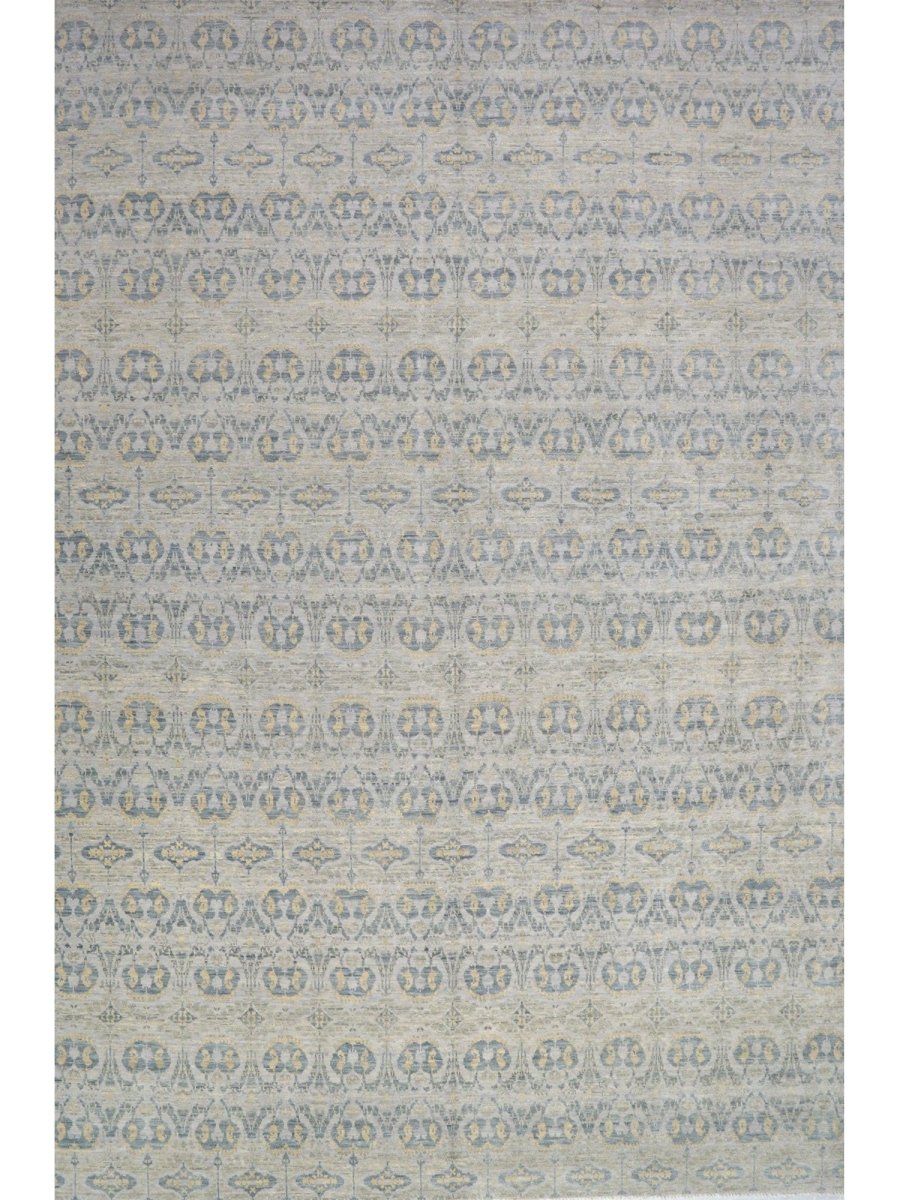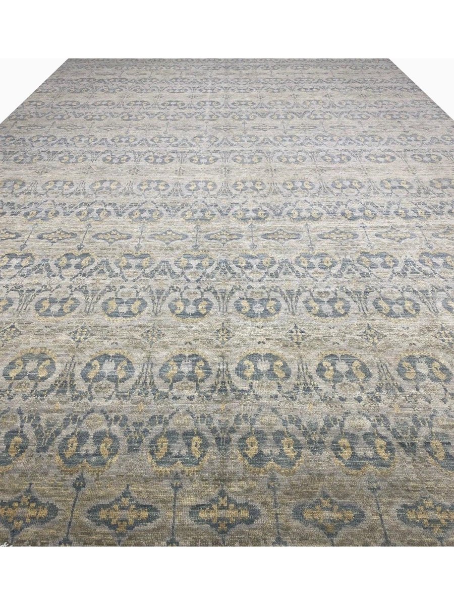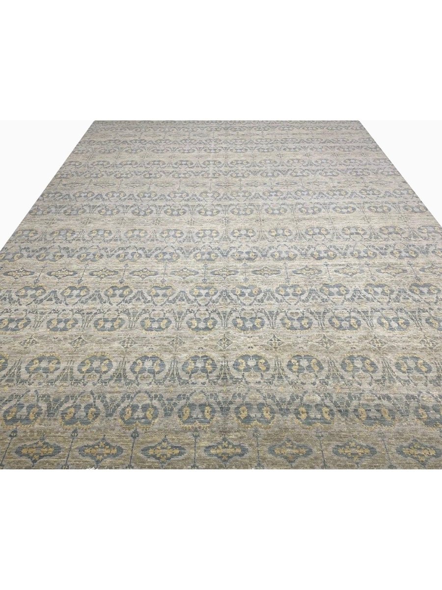 Introduce an expansive and refined aesthetic to your grand living space with this exquisite hand-knotted 12x18 Transitional area rug, meticulously crafted in India. This generously sized rug features a subtle geometric pattern composed of delicate interlocking motifs and linear elements that create a sophisticated visual texture across a soft, light gray field. The design is complemented by muted blue and hints of faint beige within the pattern, adding depth and a harmonious balance of color. The overall effect is serene elegance, enhancing the ambiance of any room without overwhelming it. Crafted entirely from high-quality wool, this rug provides a dense and durable pile, ensuring both comforting softness underfoot and resilient performance in areas with significant foot traffic.