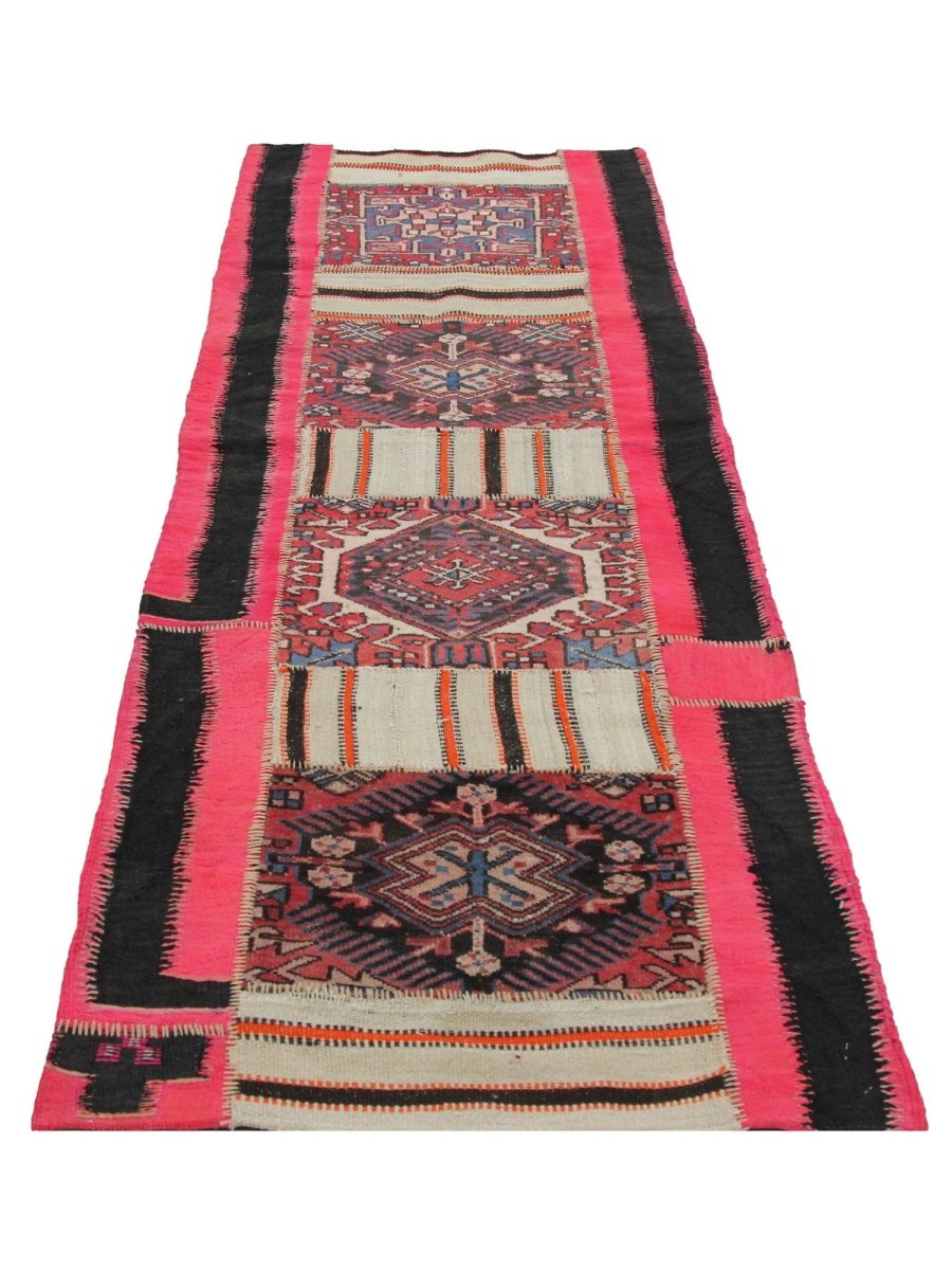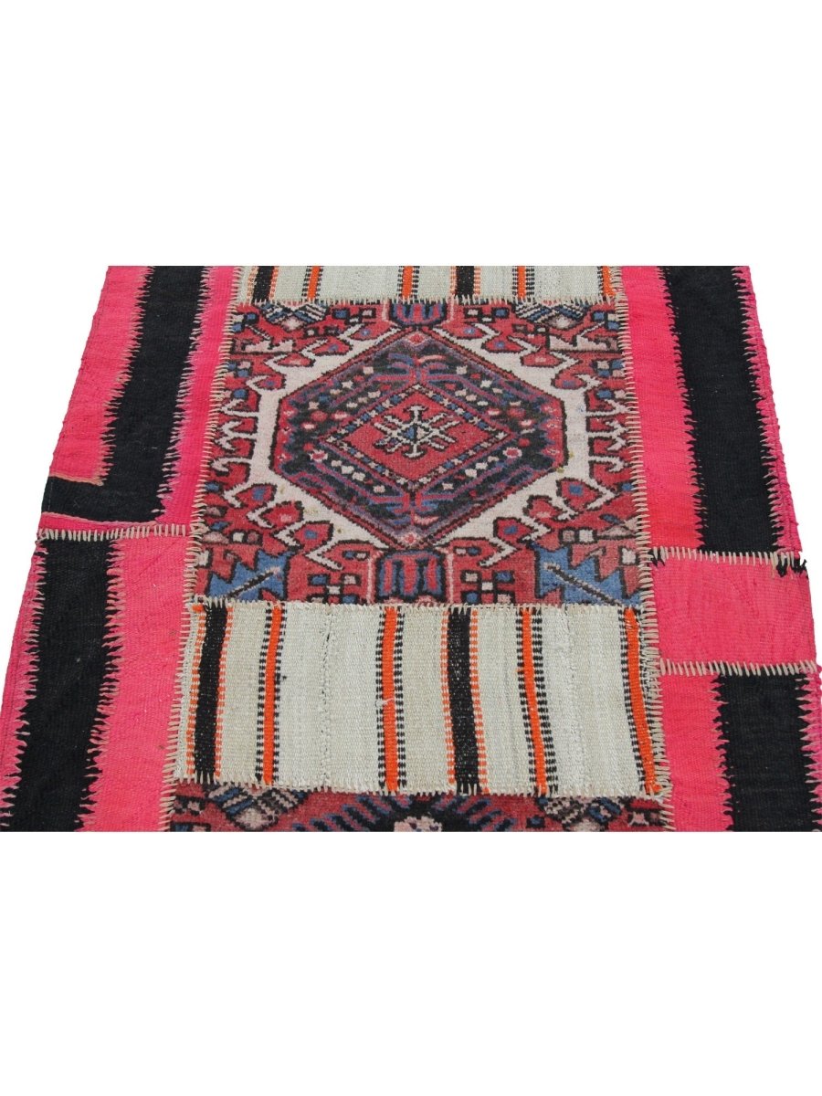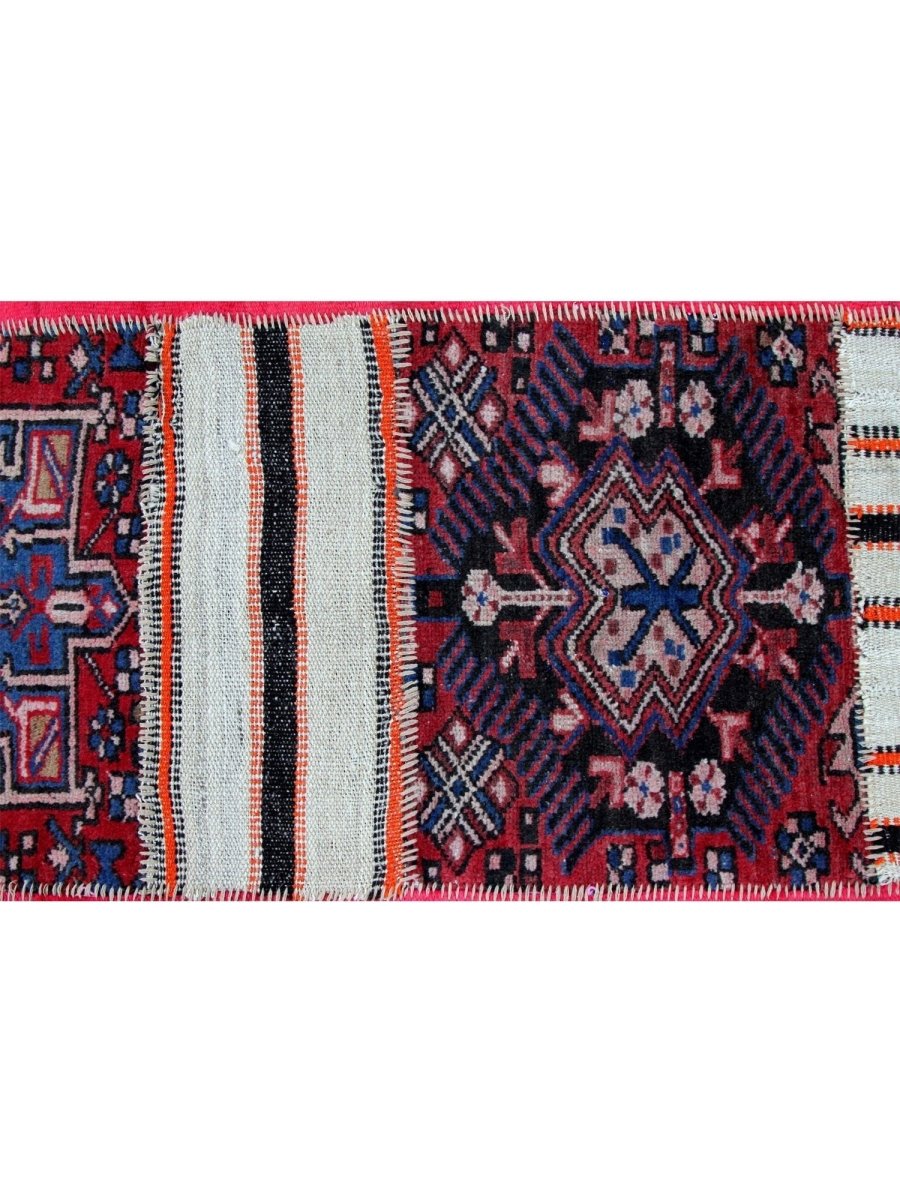 This 3x9 Persian patchwork runner features a vibrant mix of rich red, deep blue, earthy brown, black, and warm beige tones. With geometric motifs, a central medallion, and detailed woven sections, it highlights the artistry of Persian weaving. The hand-stitched seams bring together the patchwork, adding to its handcrafted appeal. A perfect blend of functionality and artistry, this runner makes a striking statement piece for hallways, staircases, or long entryways. Its durable construction ensures long-lasting beauty, while the unique design adds character and elegance to any space. Each step across this runner tells a story stitched in time, merging culture with bold design.