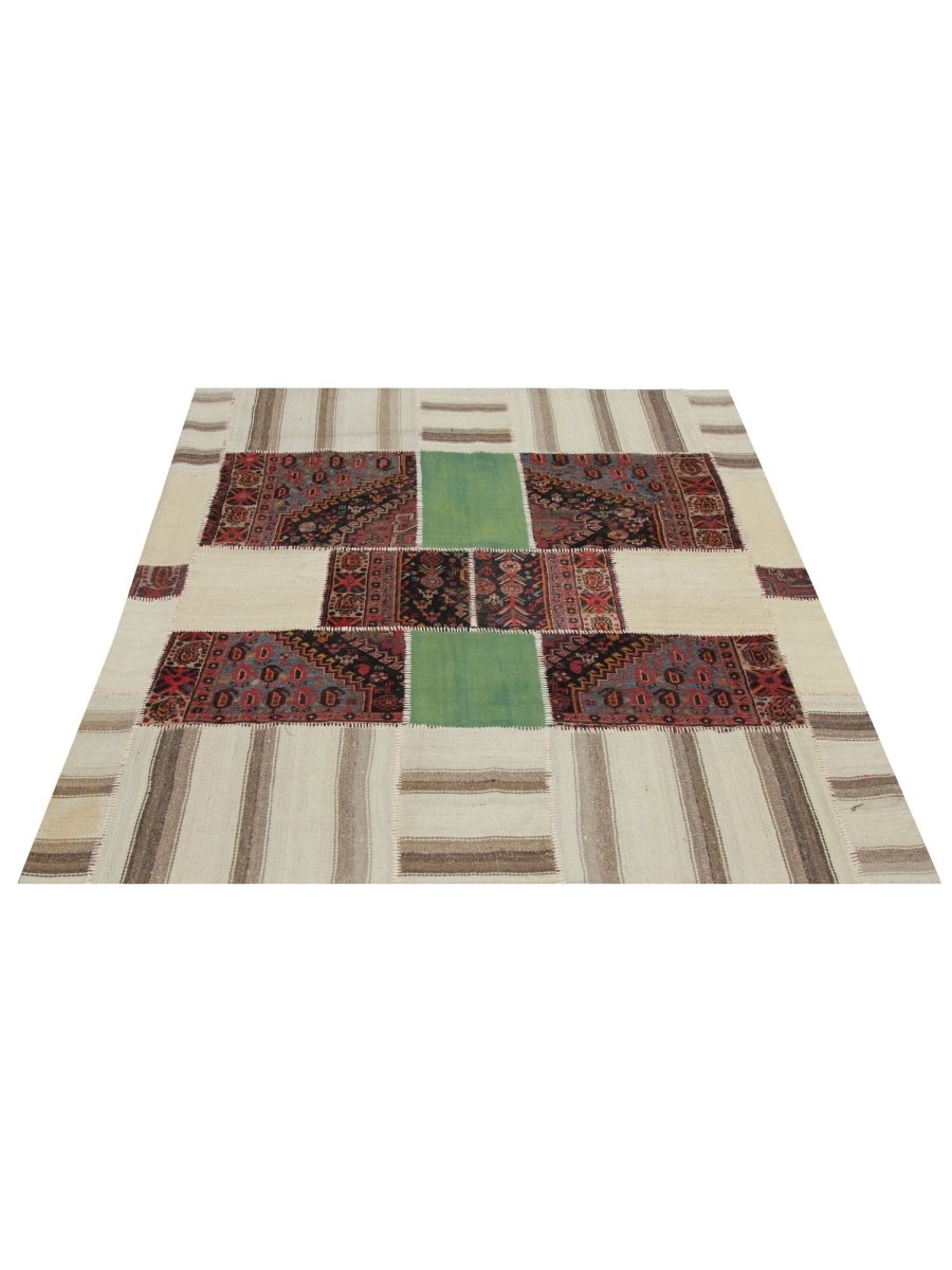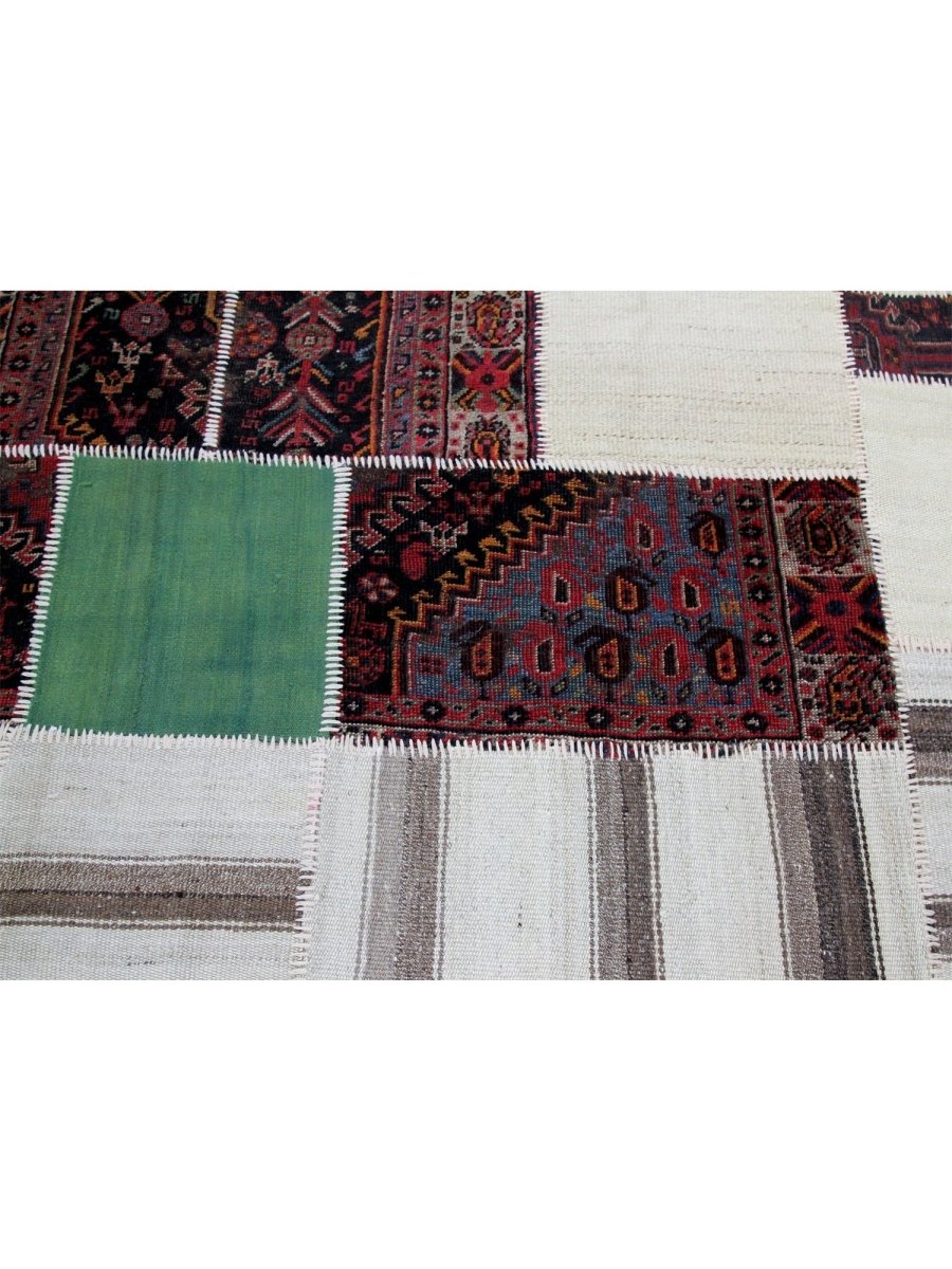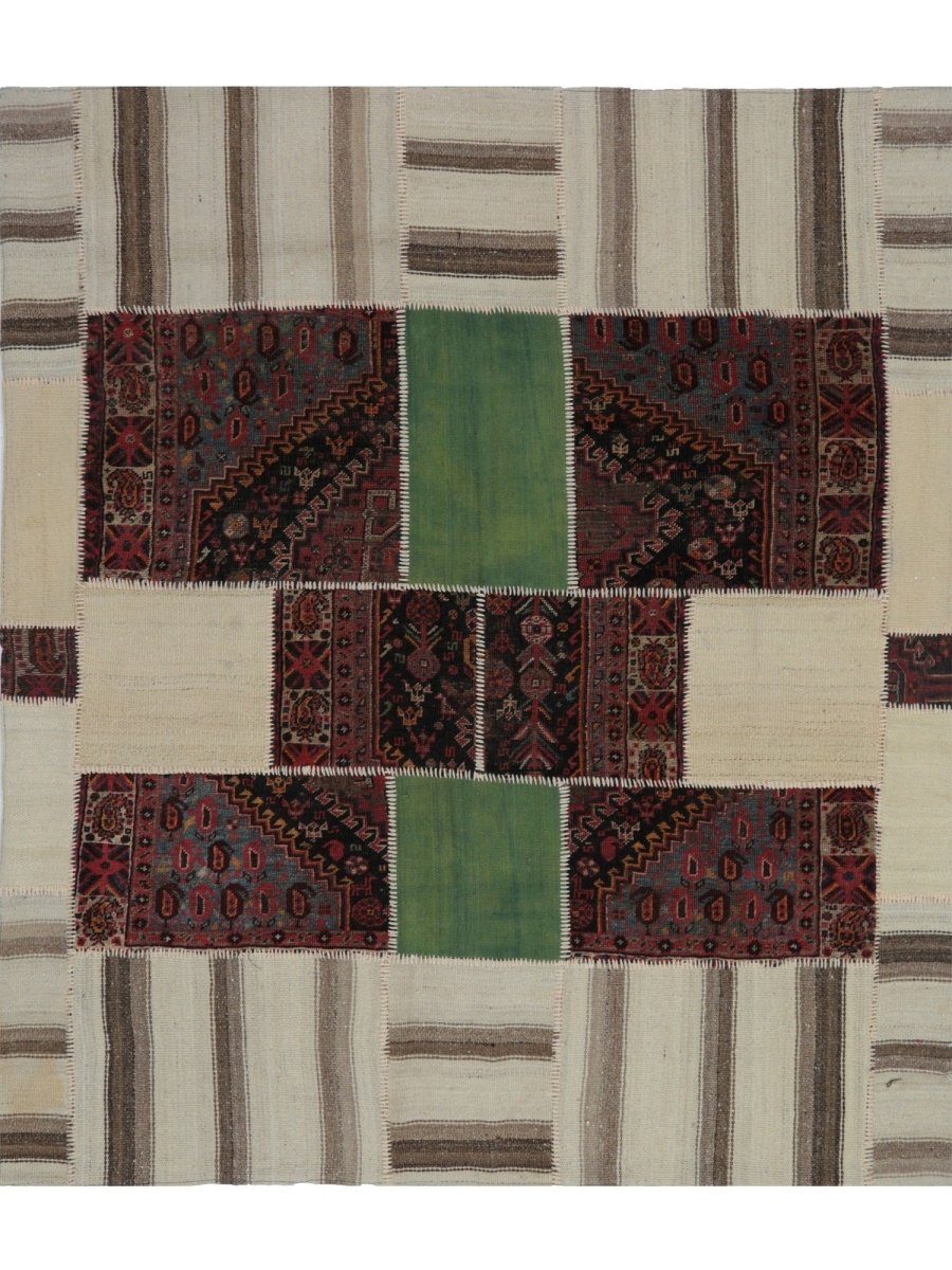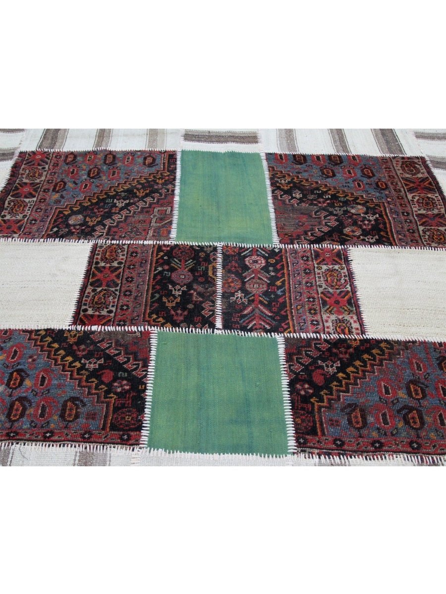 Elevate your decor with this 5x6 Vintage Persian Patchwork Area Rug, a stunning blend of artistry and craftsmanship. Handwoven in Persia, this unique rug features a patchwork composition of beige, red, green, brown, and black tones, seamlessly stitched together for a rich, textured aesthetic. The geometric patterns add depth and cultural significance, making it a standout piece for any space. Crafted from high-quality wool, this rug has a soft underfoot and is durable. The eco-friendly patchwork design repurposes vintage Persian textiles, giving each section a distinctive history and artistic charm. This rug adds warmth, depth, and cultural heritage to your decor.