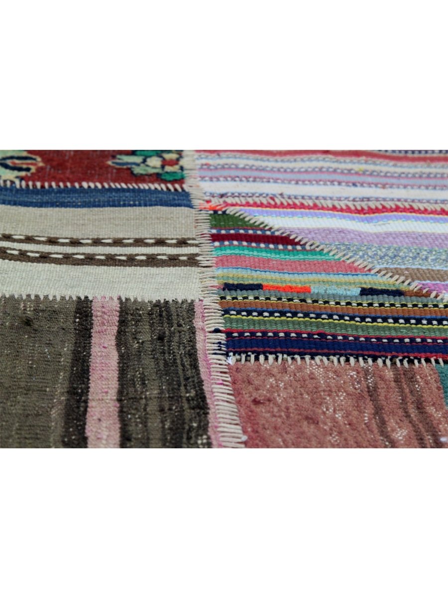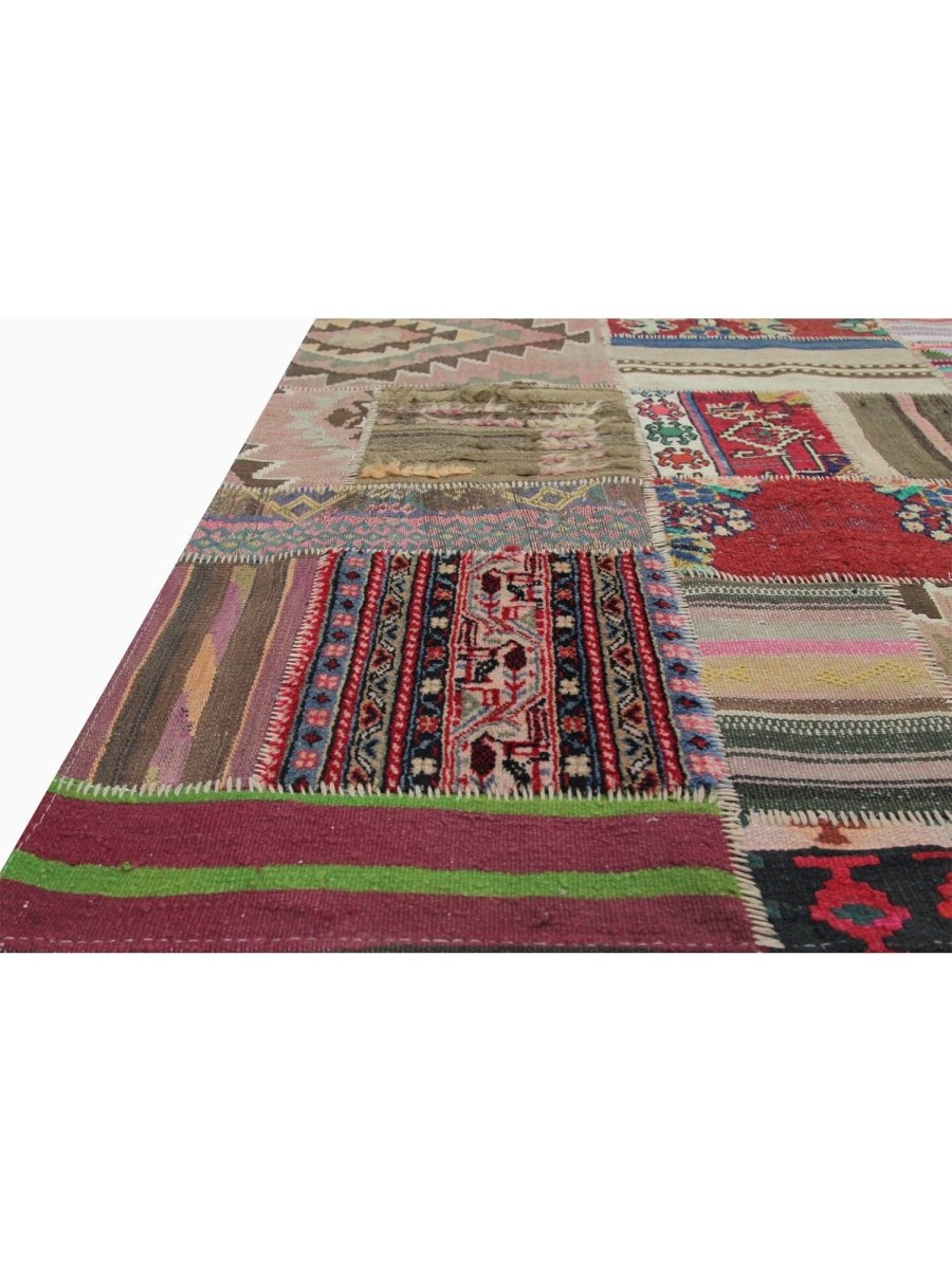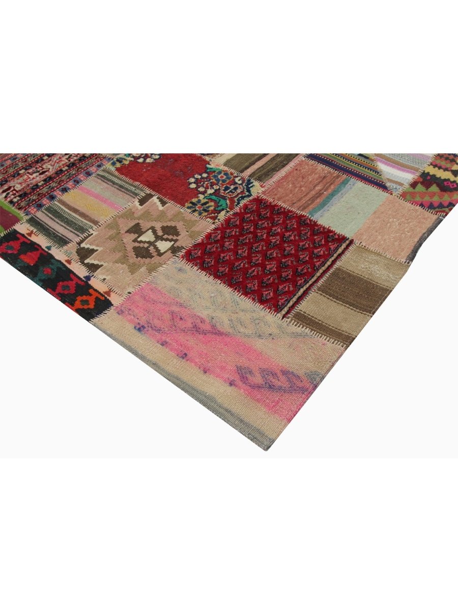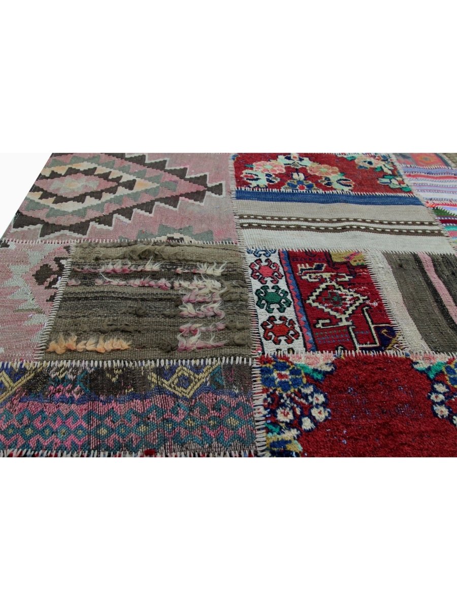 Transform your space with this 5x6 Vintage Persian Patchwork Area Rug, a stunning blend of craftsmanship and artistic design. Handwoven in Persia, this rug showcases an eclectic mix of red, beige, pink, brown, green, and black tones, seamlessly pieced together from authentic Persian textiles. Geometric pattern creates a visually rich and dynamic composition, making this rug a true work of art. Made from high-quality wool, this rug is soft and comfortable underfoot while being exceptionally durable. The carefully stitched patchwork construction reflects the intricate skill of Persian artisans, preserving the cultural heritage of various regional rug designs. This vintage rug adds warmth, depth, and history to any room.