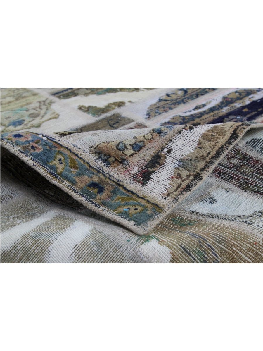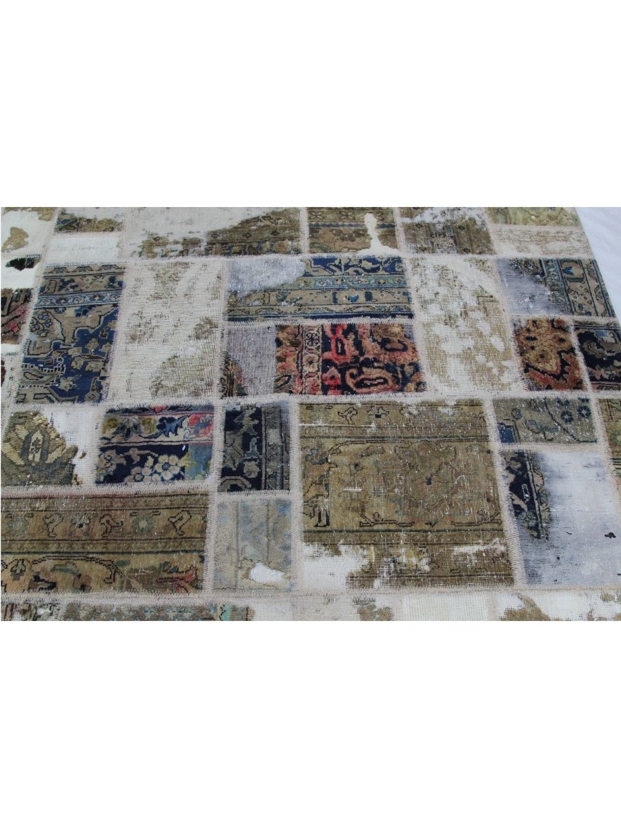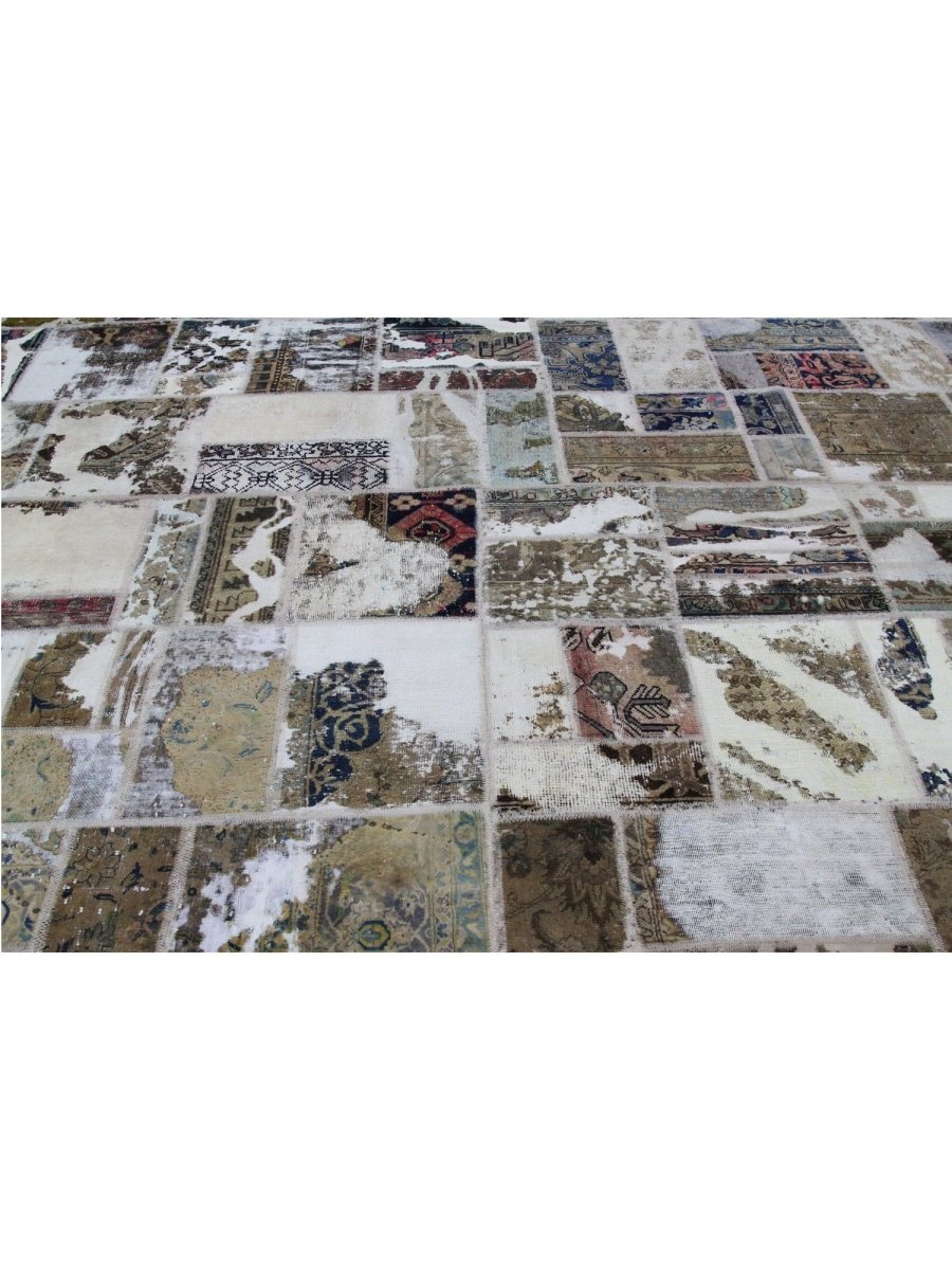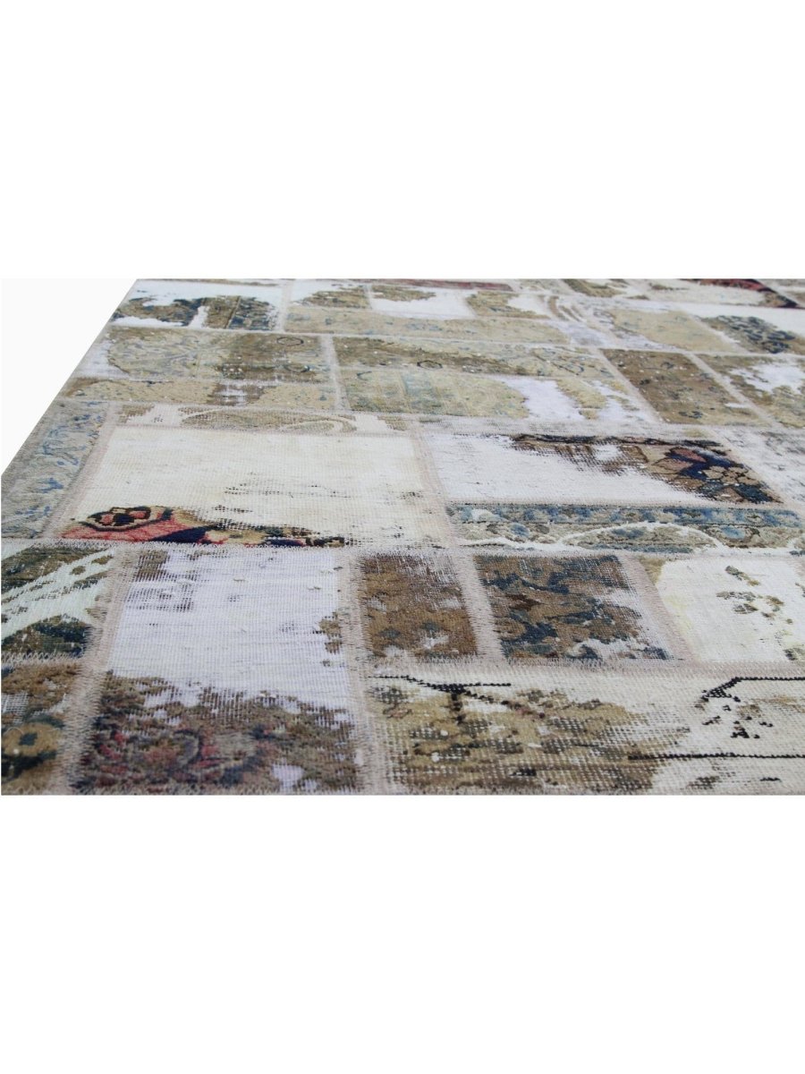 This 11x15 Persian patchwork rug accurately represents vintage charm and expert craftsmanship. It is hand-knotted from high-quality wool and boasts an intricate geometric pattern with a distressed finish. A one-of-a-kind statement piece, this rug enhances any interior with its unique design. The blend of beige, tan, brown, and rust makes it a perfect choice for grand living rooms, luxurious bedrooms, or elegant office spaces. Designed for both durability and style, this rug is an ideal investment. Free shipping in the US.