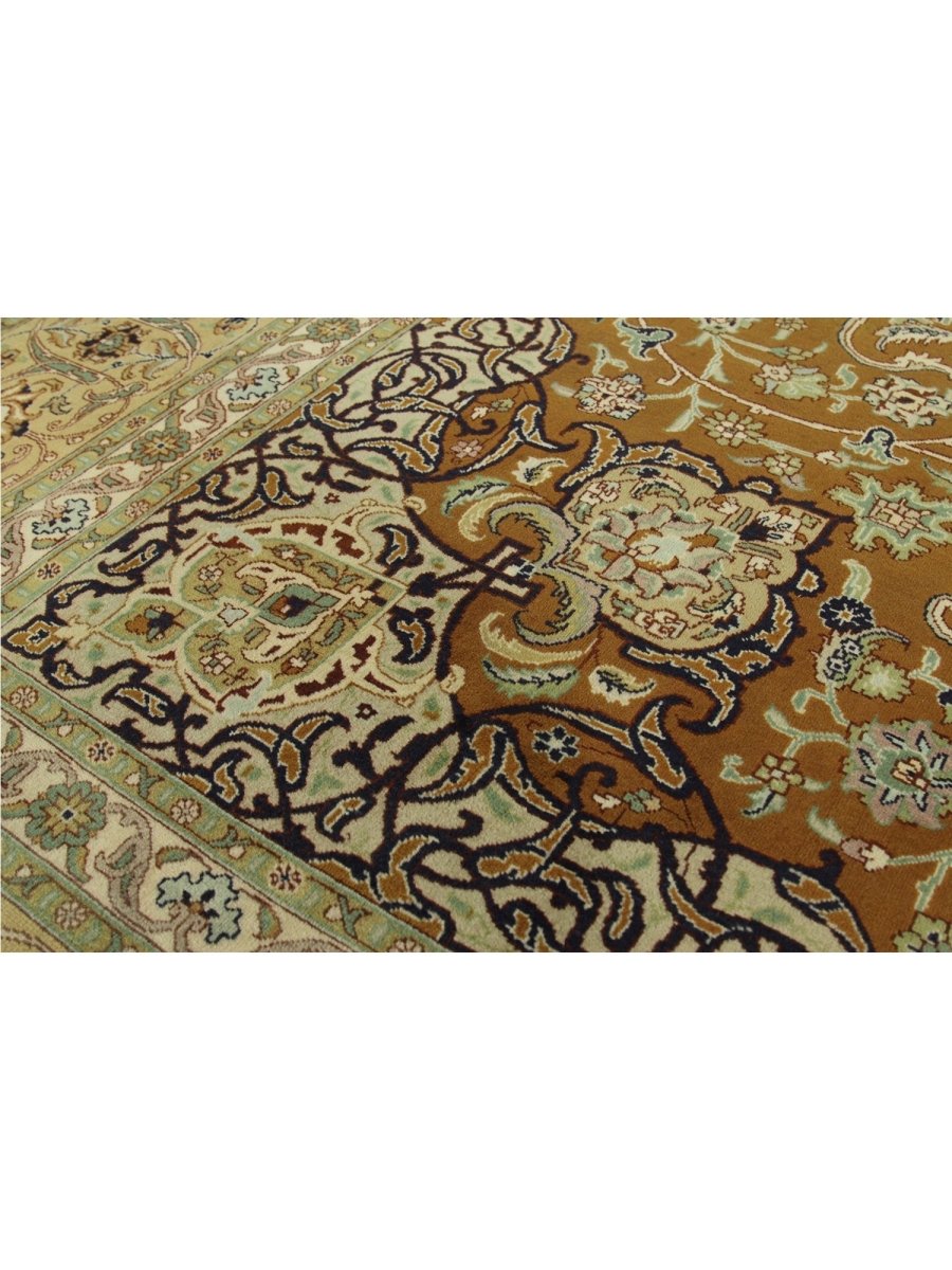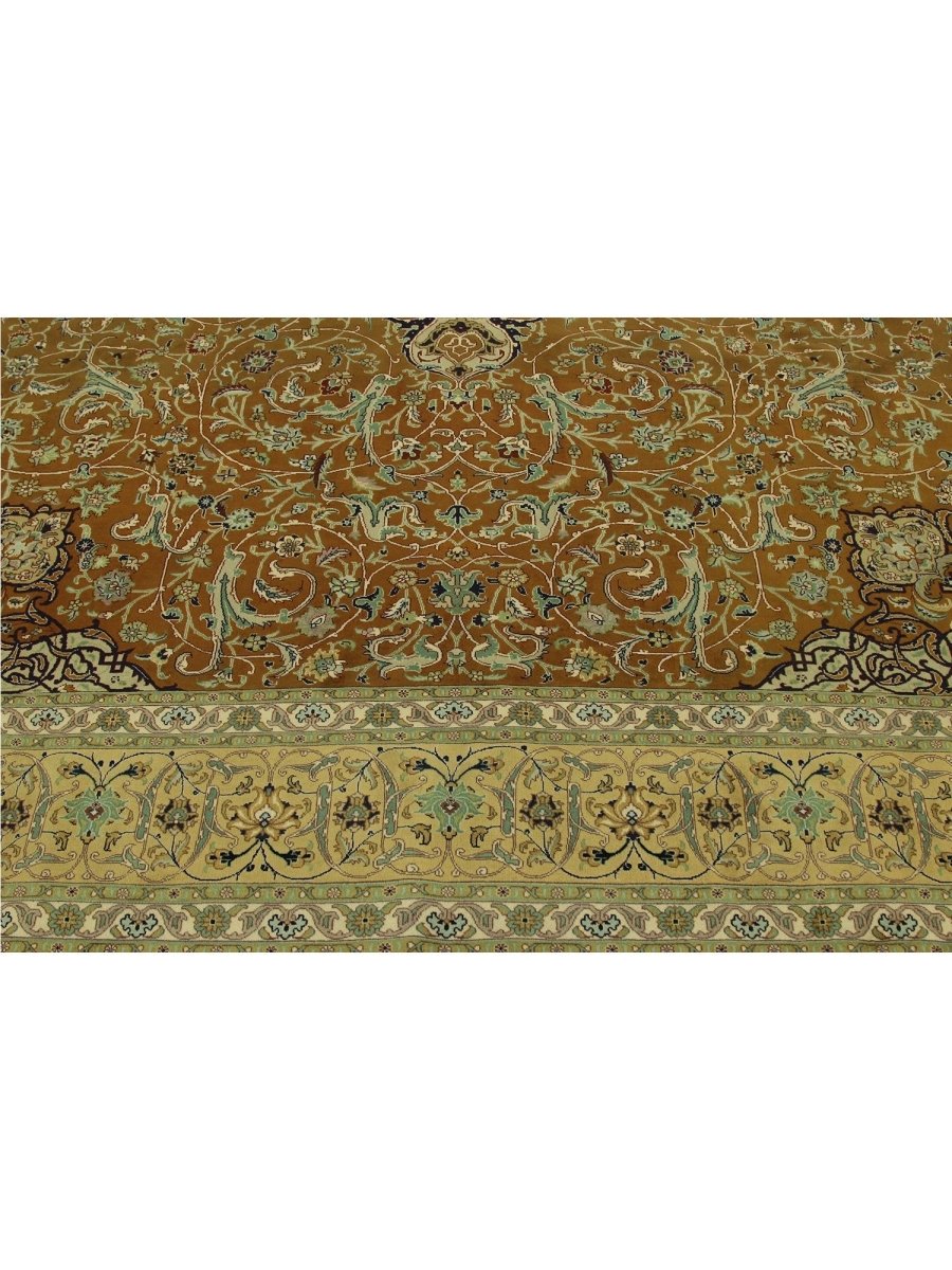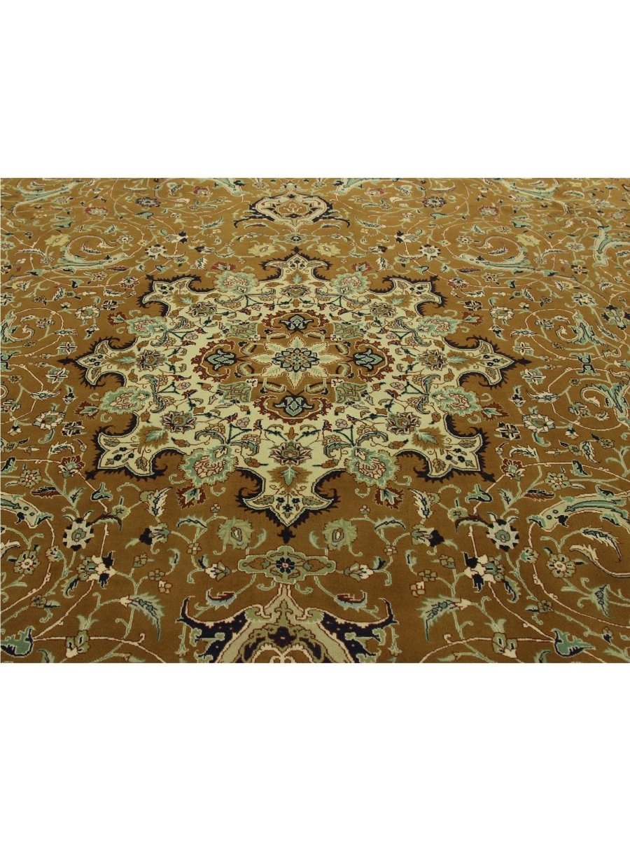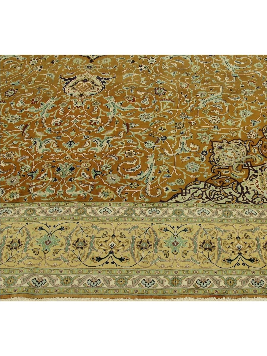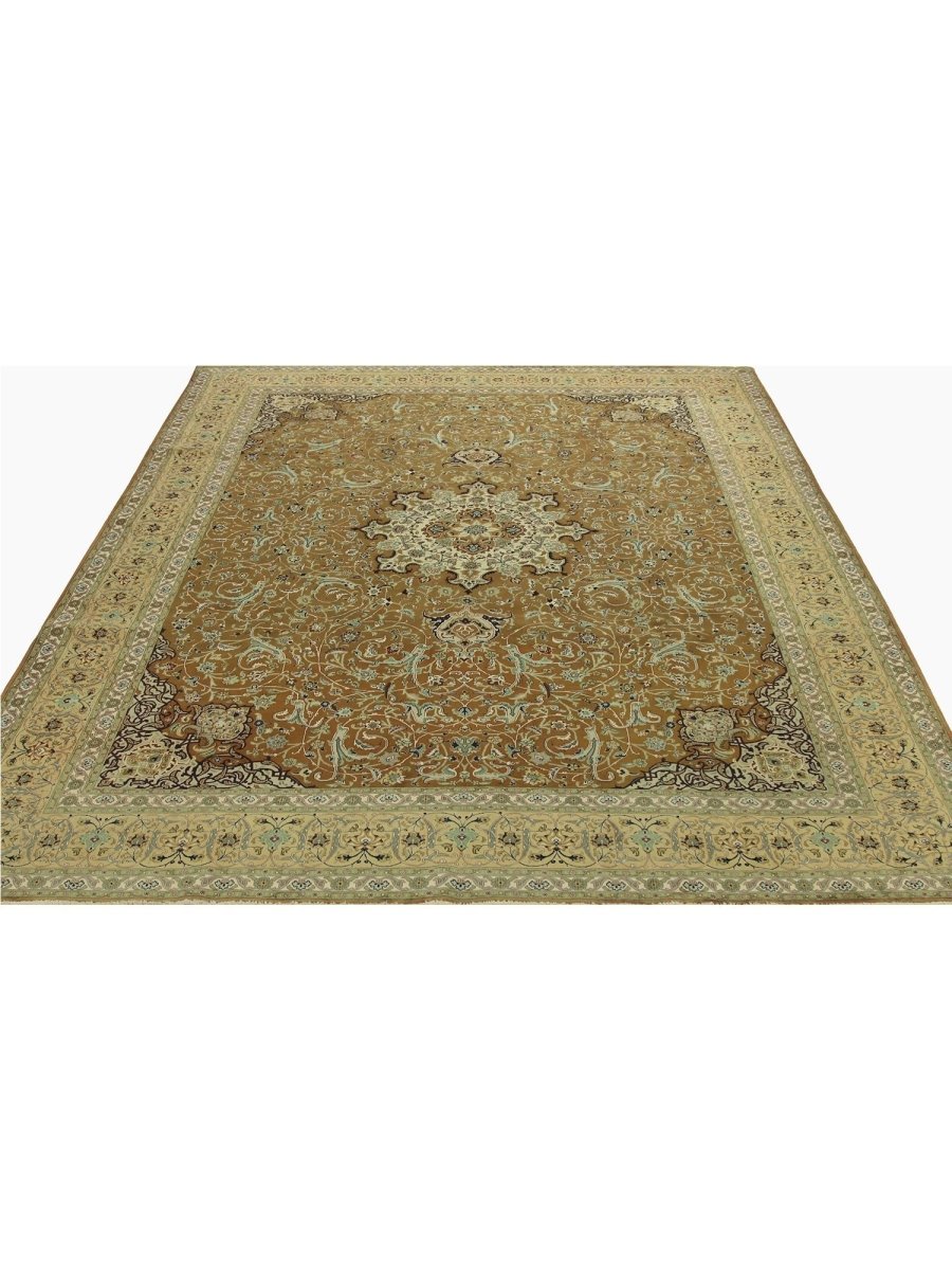 Experience the exquisite beauty of this 10x13 Old Persian Tabriz rug, crafted from wool in Persia. Hand-knotted with meticulous care, the large rug features a classic central medallion pattern surrounded by a brown tone. Intricately detailed medallion set upon a densely filled field of floral motifs, creating timeless artistry. The field is stunningly golden, providing the luminous backdrop. A complex frame beautifully frames the composition, featuring shades of yellow-beige, red, blue, and green. Colors within the medallion, floral patterns echo those in the border, adding layers of visual interest. This generously sized piece is perfect for anchoring a living or dining area. Crafted with traditional techniques, this wool rug provides lasting durability and a soft, luxurious feel underfoot. Enjoy free US shipping.