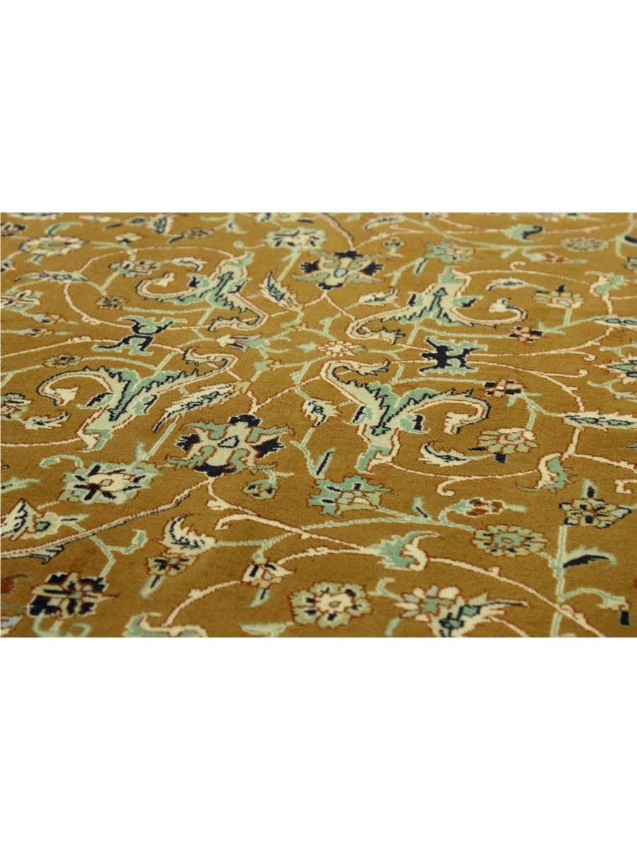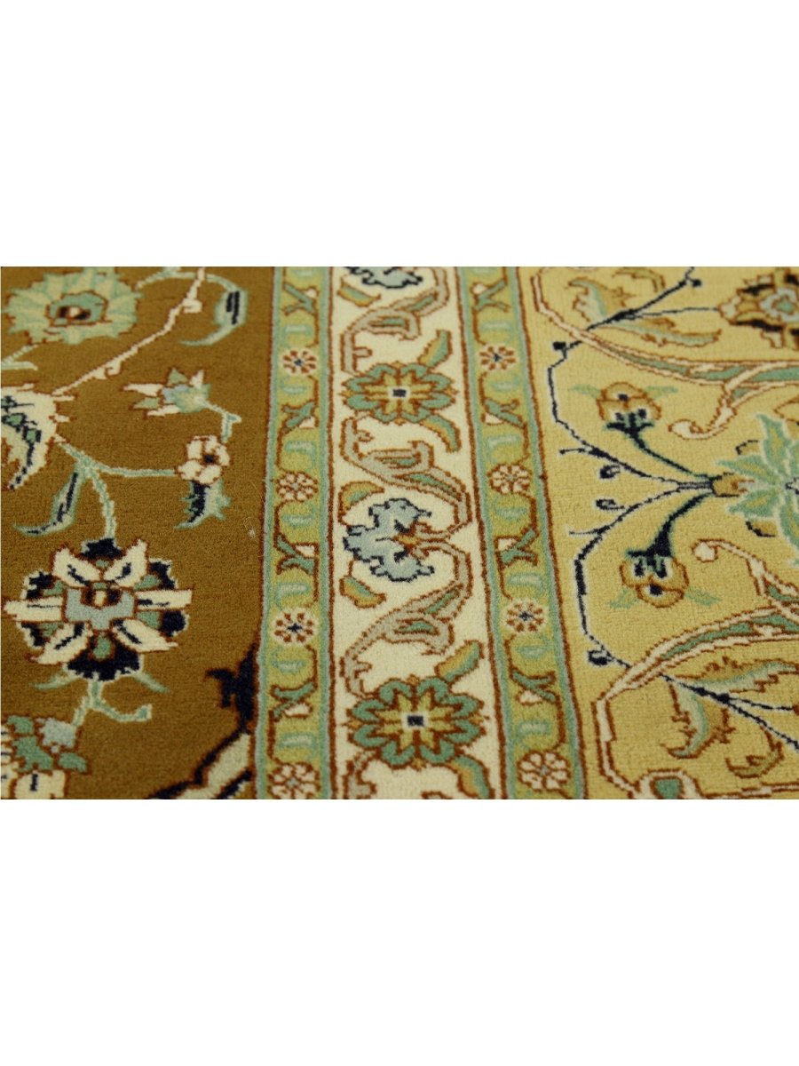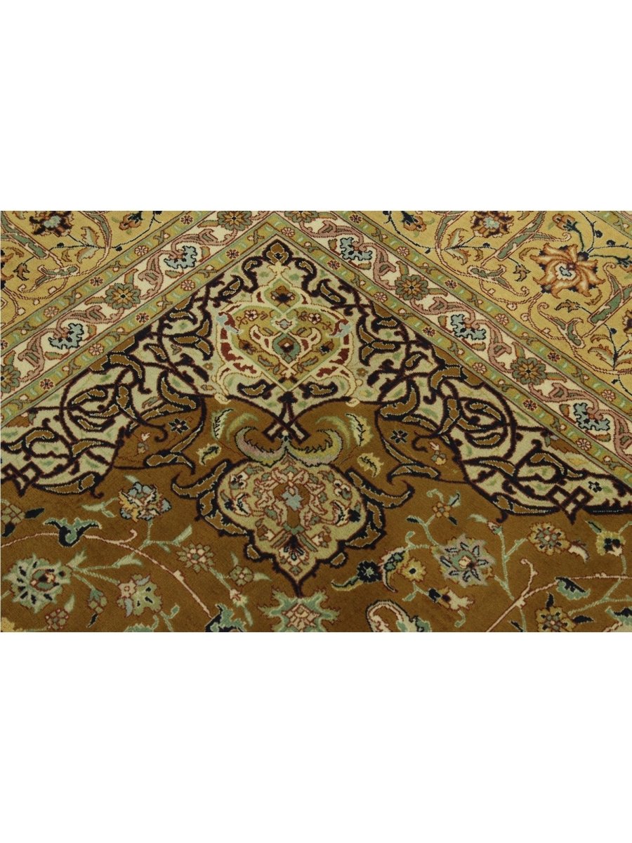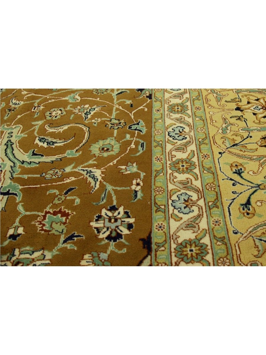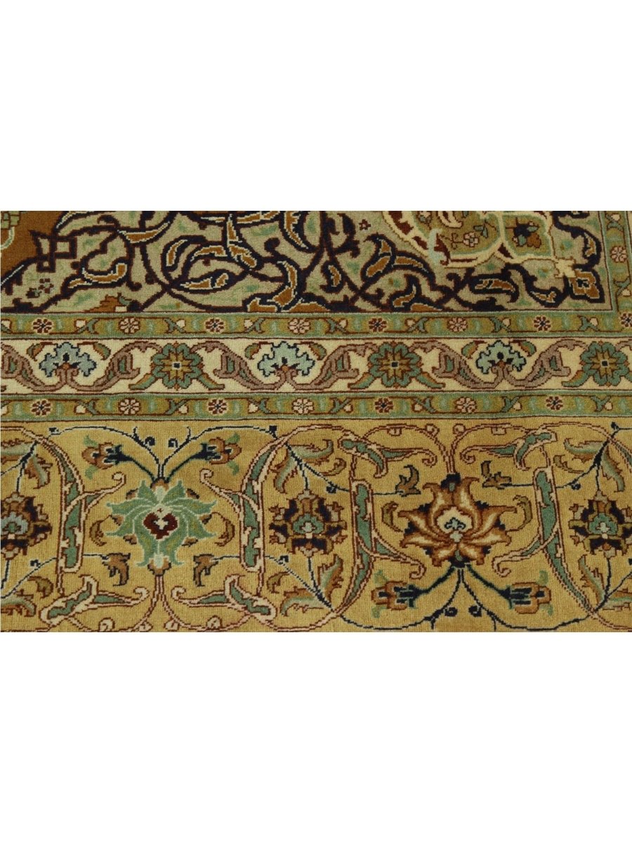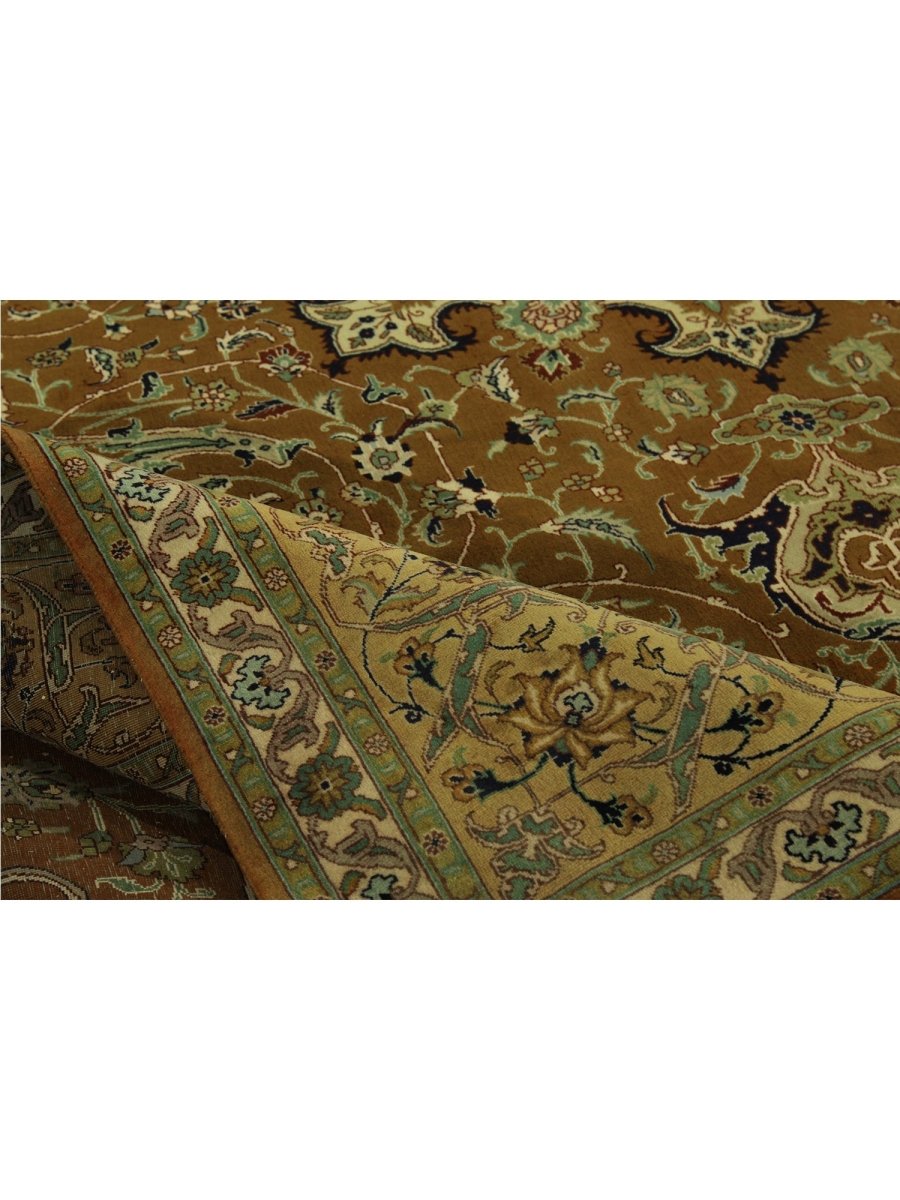 Experience the exquisite beauty of this 10x13 Old Persian Tabriz rug, crafted from wool in Persia. Hand-knotted with meticulous care, the large rug features a classic central medallion pattern surrounded by a brown tone. Intricately detailed medallion set upon a densely filled field of floral motifs, creating timeless artistry. The field is stunningly golden, providing the luminous backdrop. A complex frame beautifully frames the composition, featuring shades of yellow-beige, red, blue, and green. Colors within the medallion, floral patterns echo those in the border, adding layers of visual interest. This generously sized piece is perfect for anchoring a living or dining area. Crafted with traditional techniques, this wool rug provides lasting durability and a soft, luxurious feel underfoot. Enjoy free US shipping.