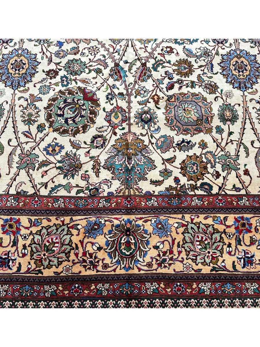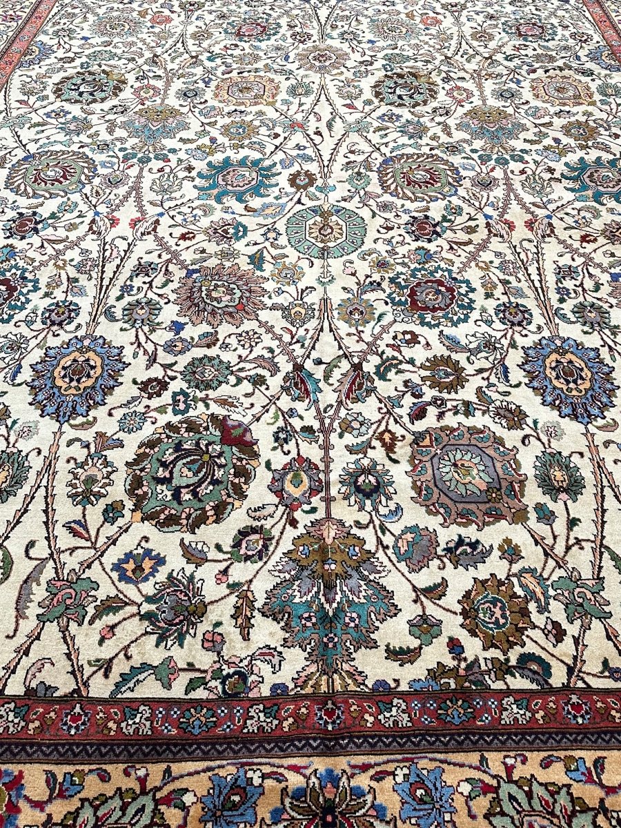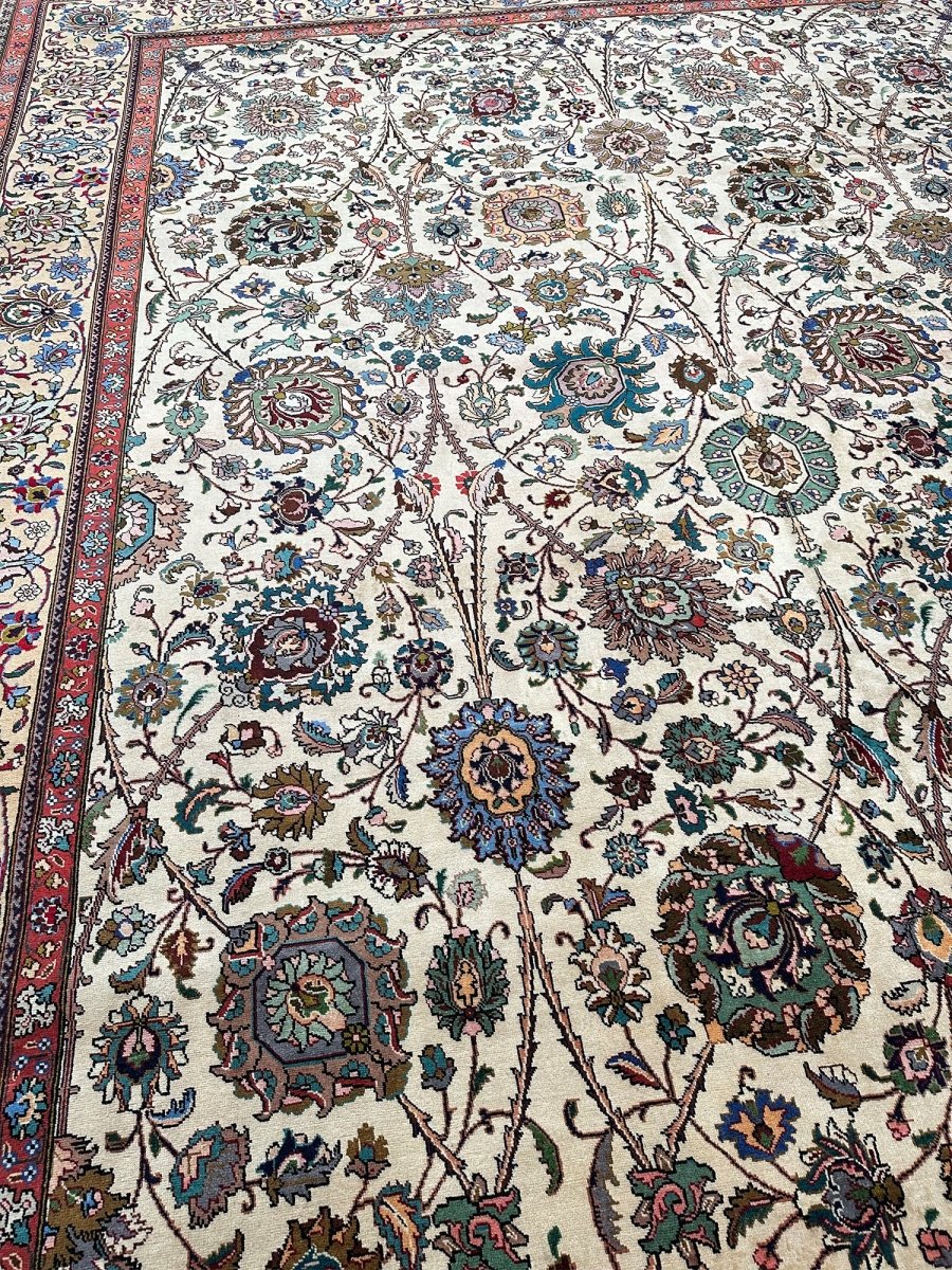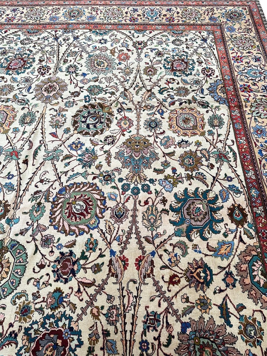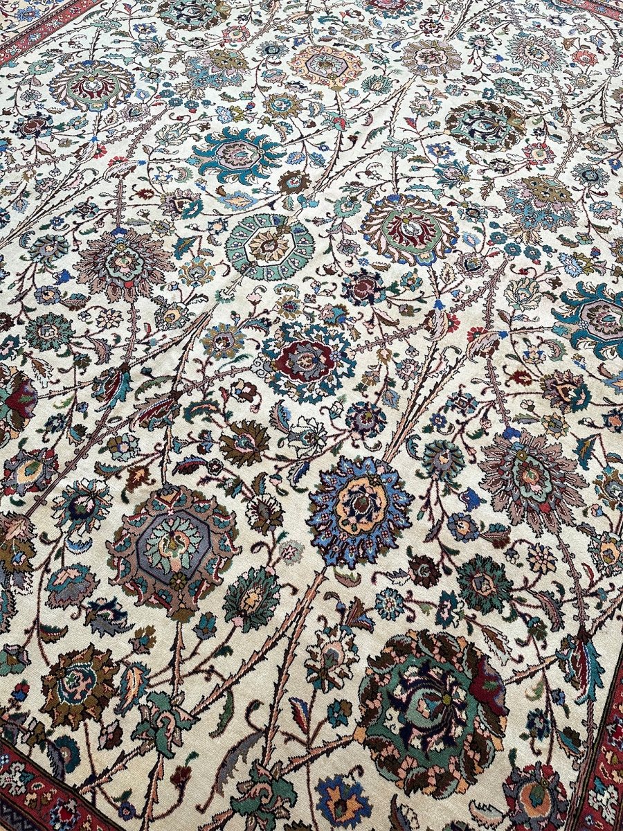 This 11x14 Old Persian Tabriz Area Rug blends timeless beauty with rustic charm. Crafted from high-quality wool, this hand-knotted rug features an intricate floral pattern with detailed motifs, showcasing cream, blue, tan, and red tones. Originating from Persia, its elaborate design adds elegance. The rug’s floral motifs create a warm and stylish feel. Its hand-knotted construction ensures that it will last for years and will provide charm to your space for years to come. Make this rug a beautiful addition to your home with its charismatic beauty. Shop now to get the added benefit of free shipping in the United States.