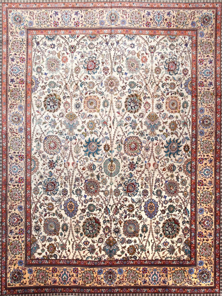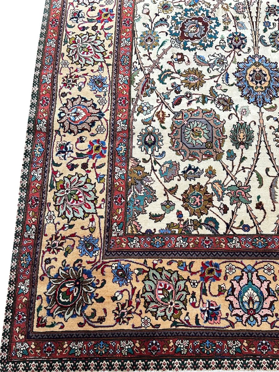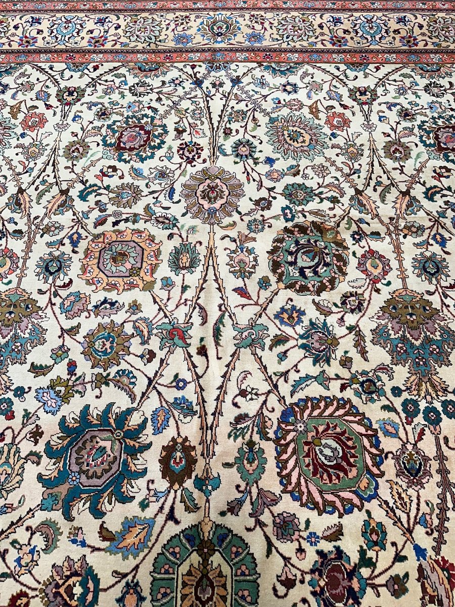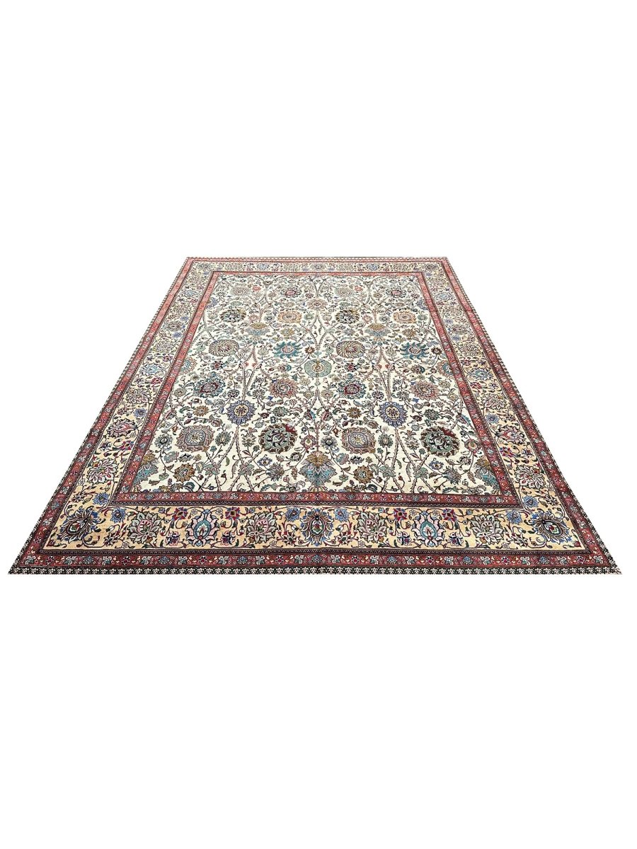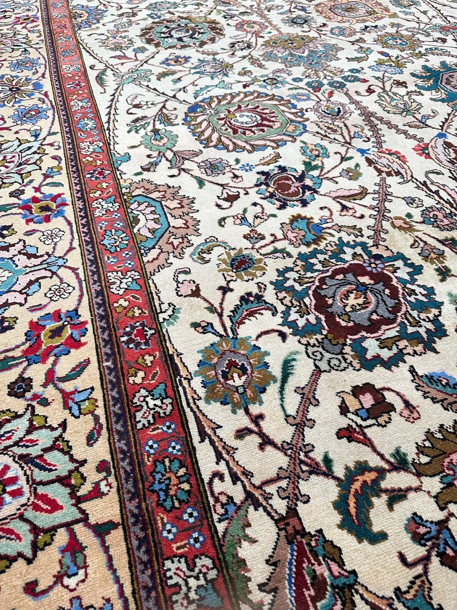 This 11x14 Old Persian Tabriz Area Rug blends timeless beauty with rustic charm. Crafted from high-quality wool, this hand-knotted rug features an intricate floral pattern with detailed motifs, showcasing cream, blue, tan, and red tones. Originating from Persia, its elaborate design adds elegance. The rug’s floral motifs create a warm and stylish feel. Its hand-knotted construction ensures that it will last for years and will provide charm to your space for years to come. Make this rug a beautiful addition to your home with its charismatic beauty. Shop now to get the added benefit of free shipping in the United States.