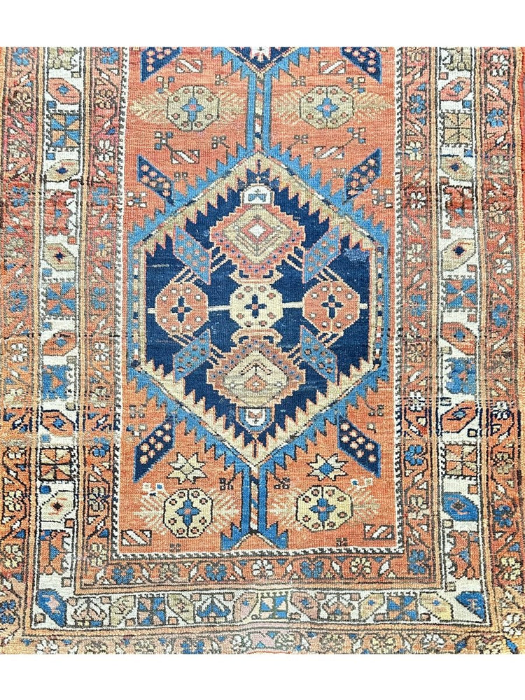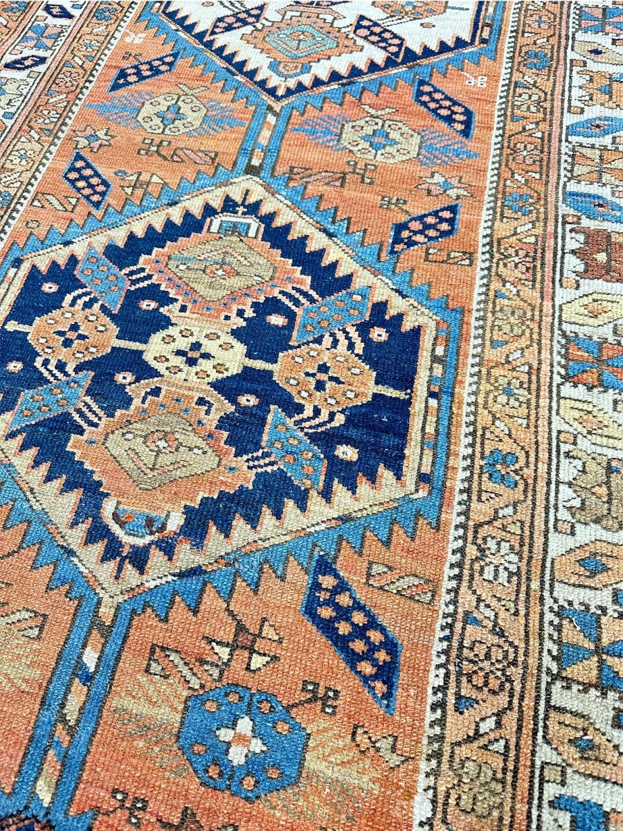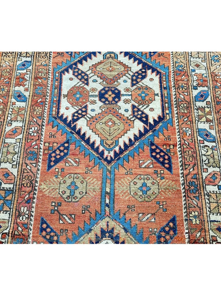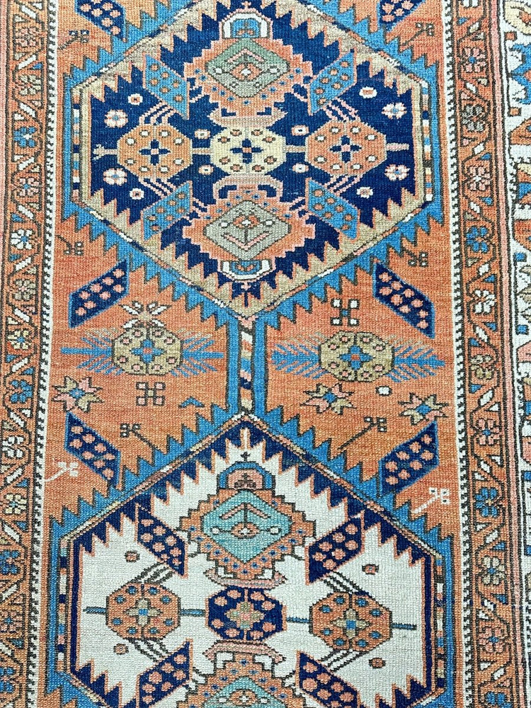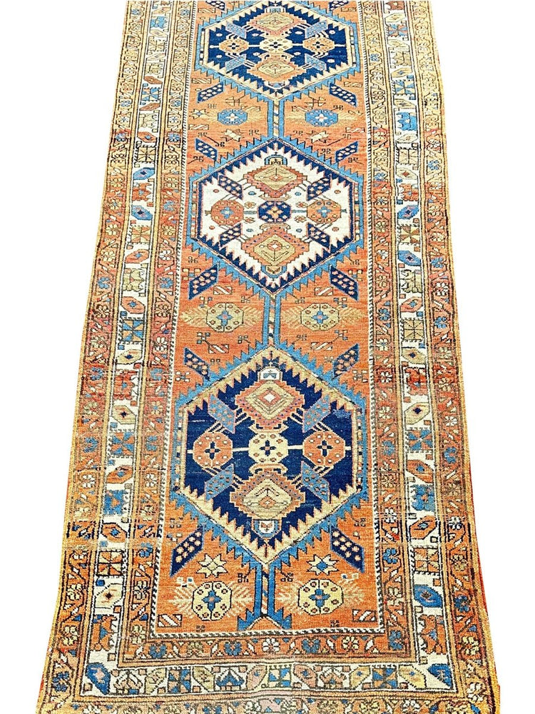 The 3x18 Antique Persian Serapi Runner Rug is a unique find that transforms any area and adds a touch of classic traditional elegance. This gorgeous rug, made from high-quality wool, features a geometric design that enhances your interior decor. It creates a welcoming atmosphere its vibrant orange, blue, cream, and orange hues make it a versatile addition to any home. Beyond its functional use, this stunning runner serves as a beautiful centerpiece in your room. Enjoy free US delivery.