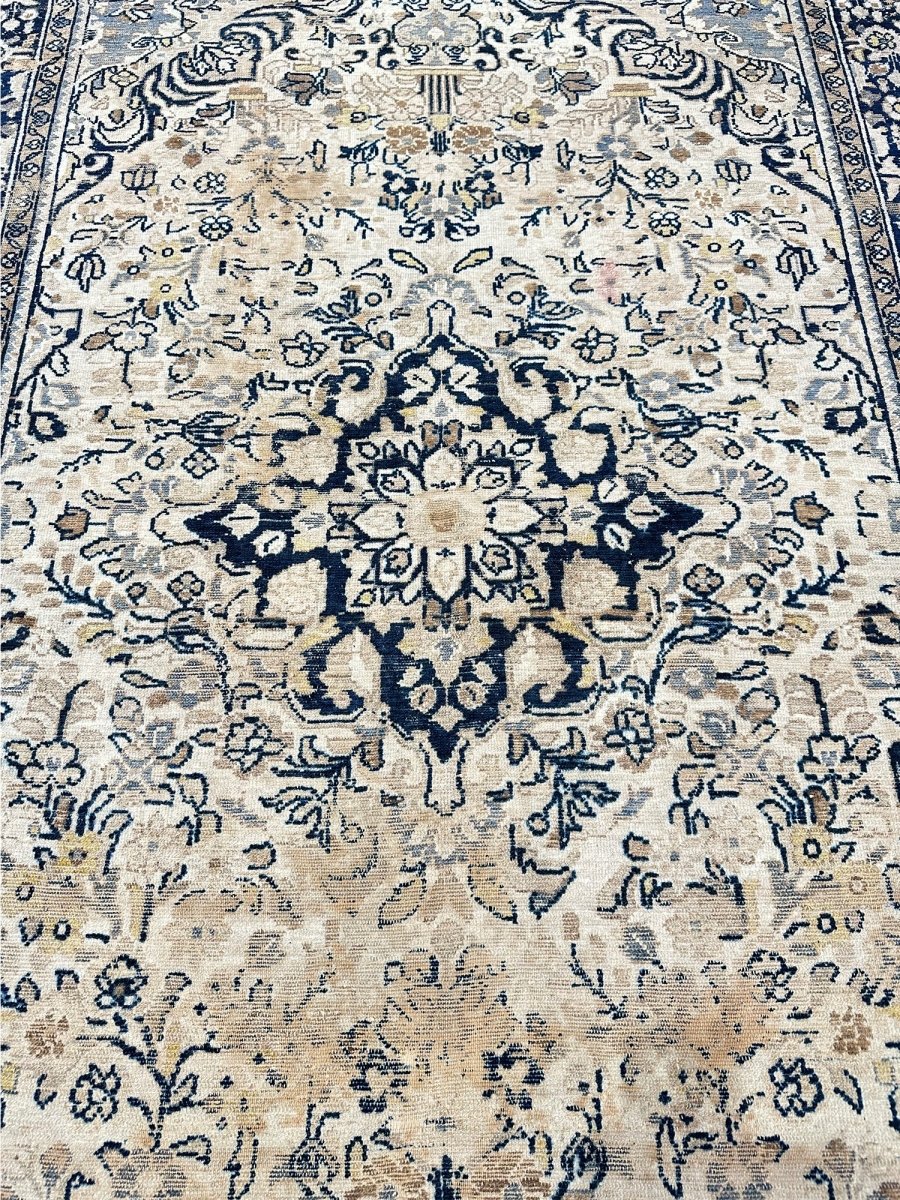 Experience the art of Persian weaving with the 5x7 Persian Tabriz Area Rug. Known for their extraordinary weaving skill and careful details, ornate medallion patterns, exquisite details, and wonderful balance. Handwoven in Persia with fine wool, the richness of this rug presents depths with its rich tones of navy blue and beige, to impart depth and character in your environment. Enjoy our complimentary shipping within the US.