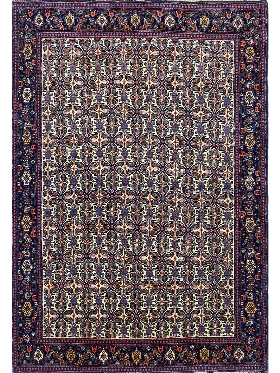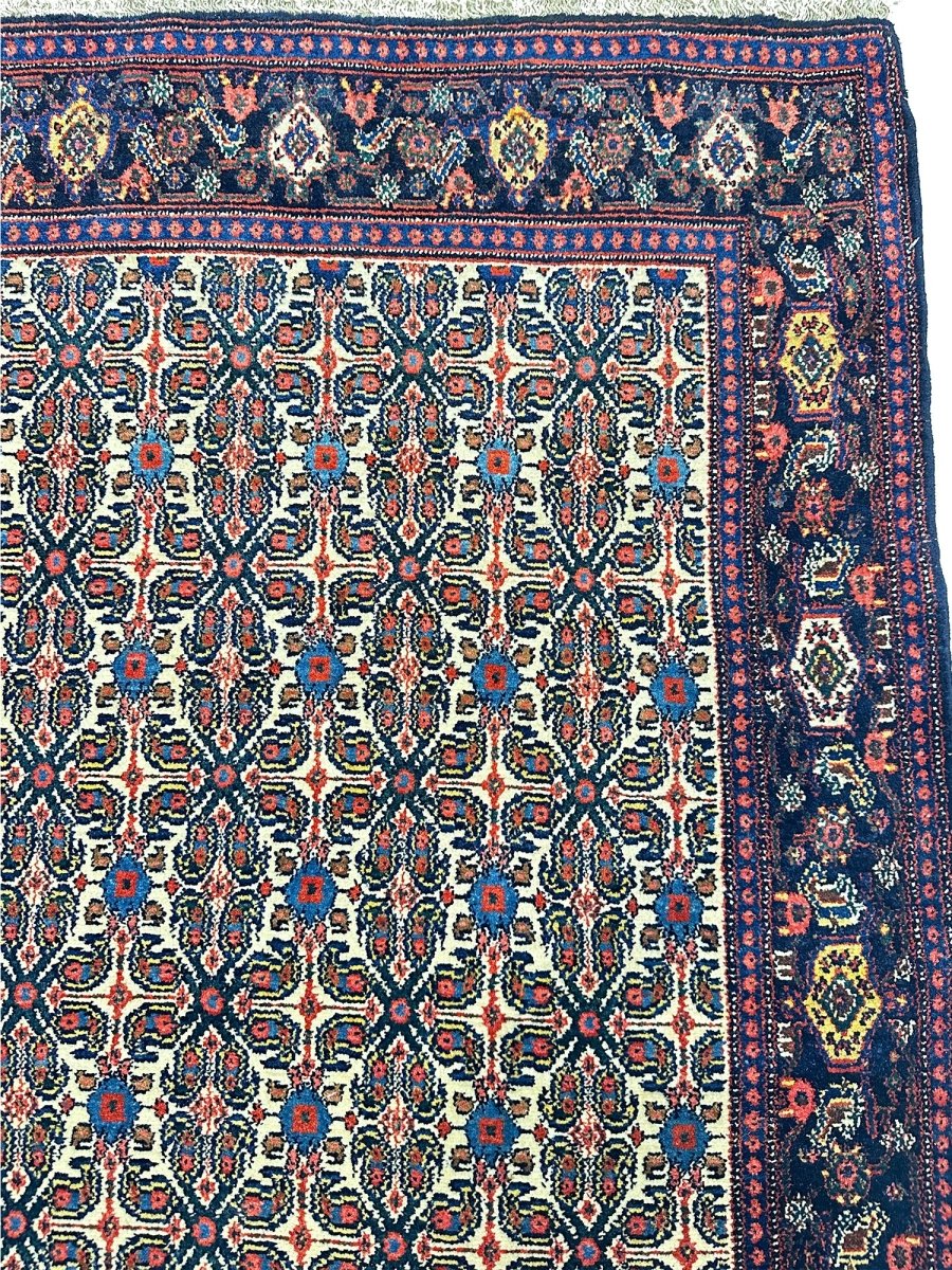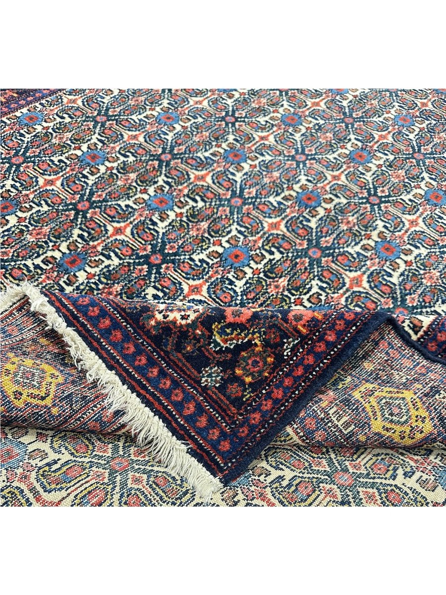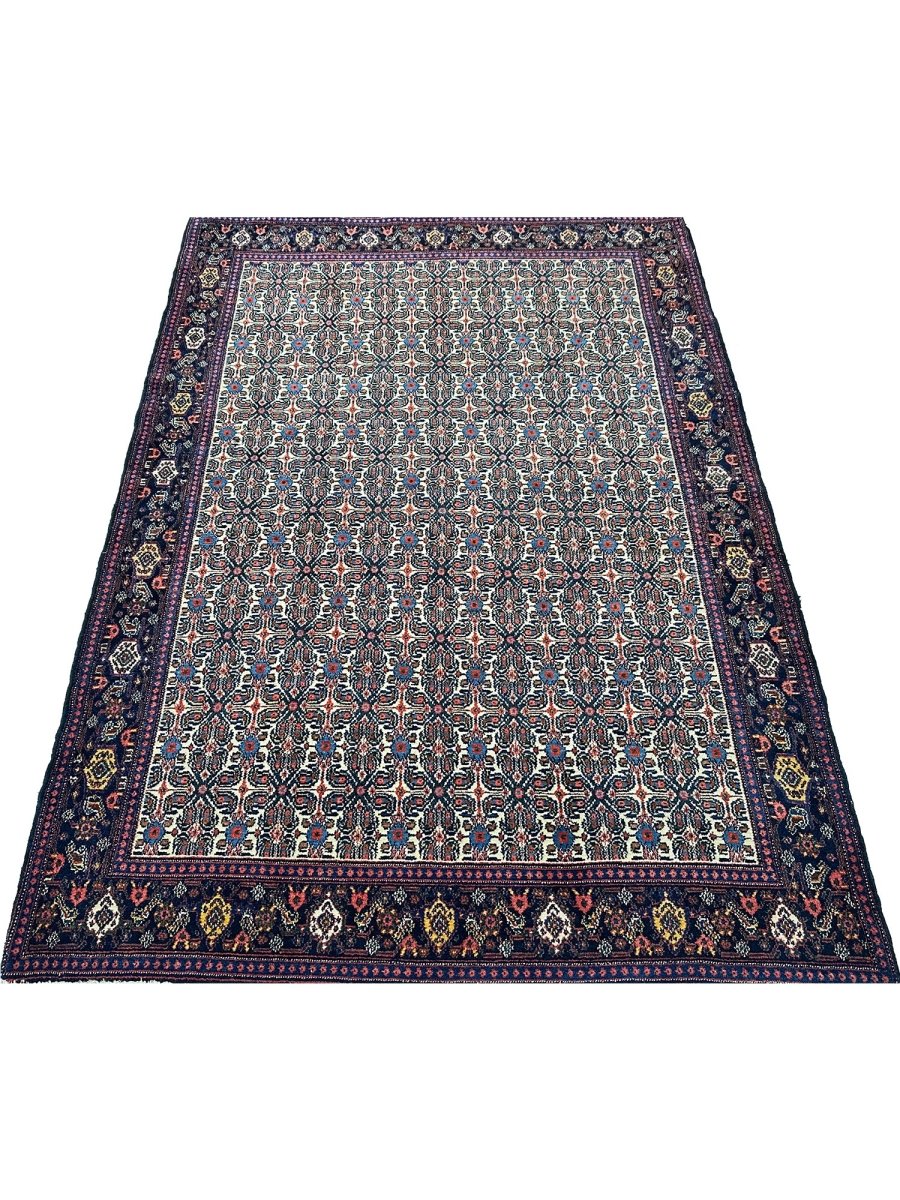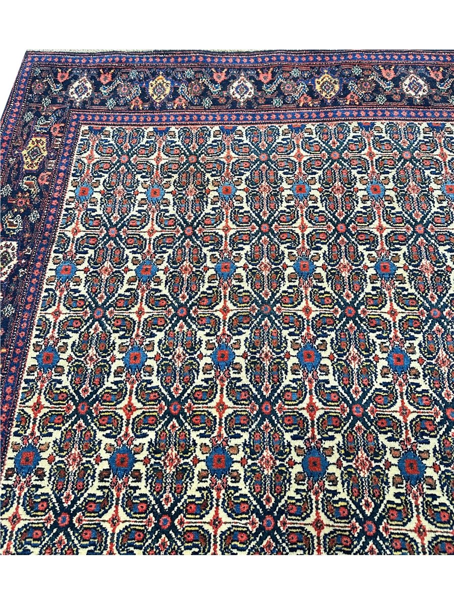 Elevate your home with a 5x7 Persian Senneh area rug. A perfect blend of traditional and contemporary design. Hand-knotted in Persia from premium wool. This rug has a detailed geometric pattern enriched with the beautiful colors of navy blue and ivory. Its optimal size, durability, and pattern will bring comfort along with luxury to your space. Free delivery around the US.