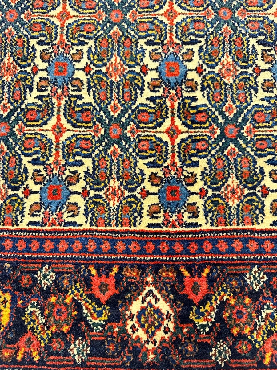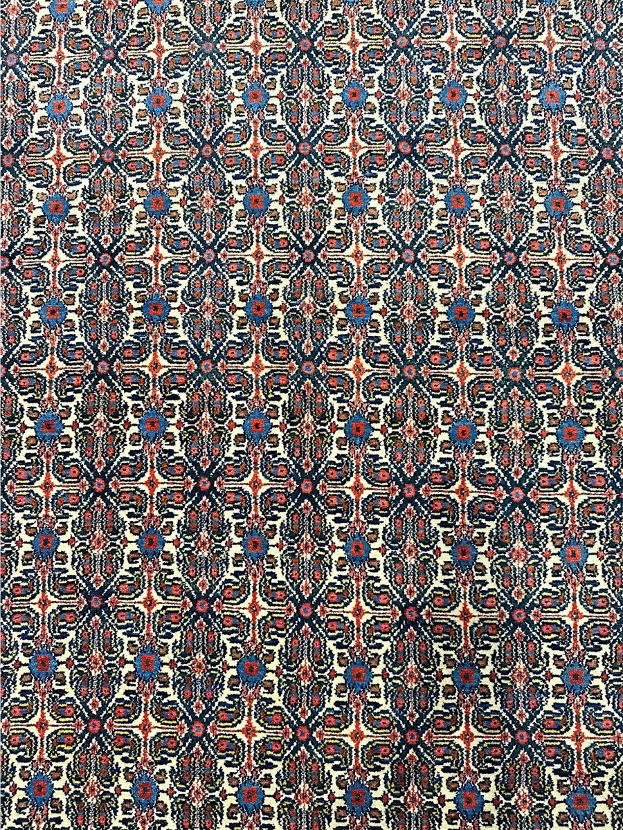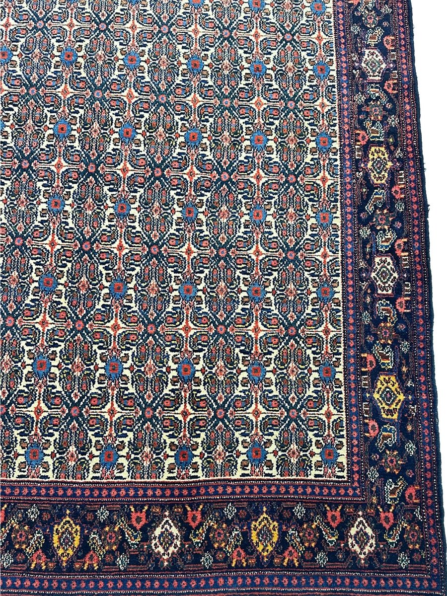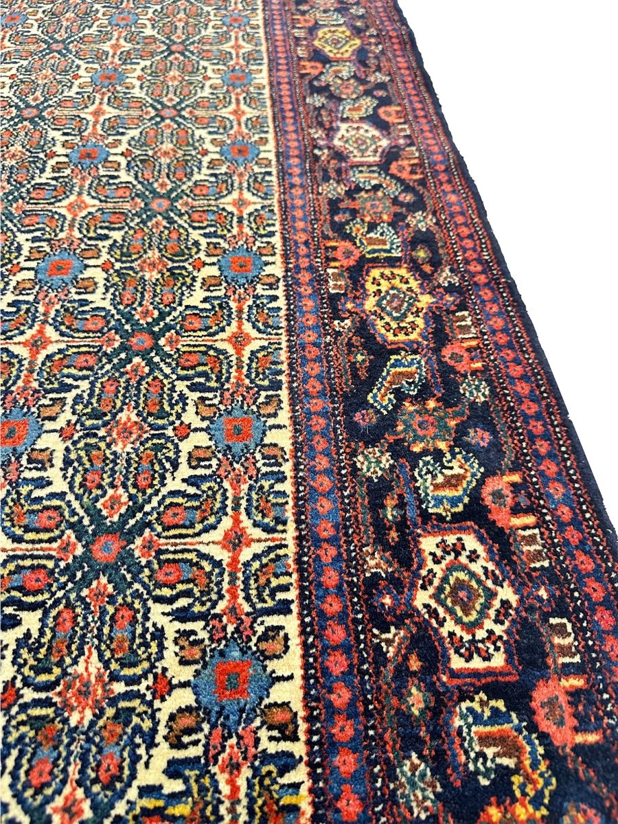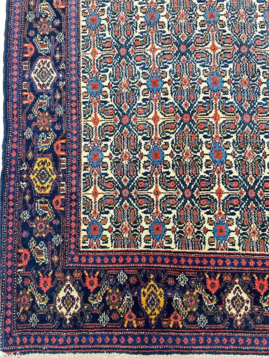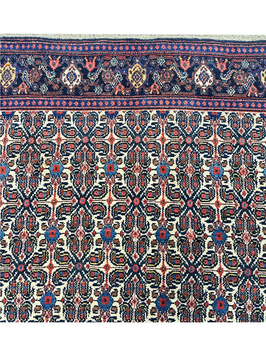 Elevate your home with a 5x7 Persian Senneh area rug. A perfect blend of traditional and contemporary design. Hand-knotted in Persia from premium wool. This rug has a detailed geometric pattern enriched with the beautiful colors of navy blue and ivory. Its optimal size, durability, and pattern will bring comfort along with luxury to your space. Free delivery around the US.