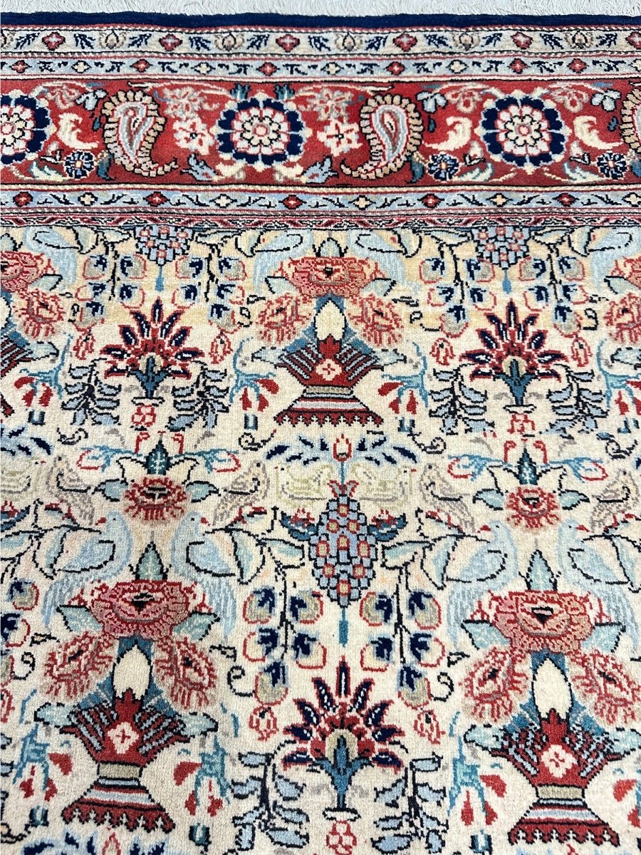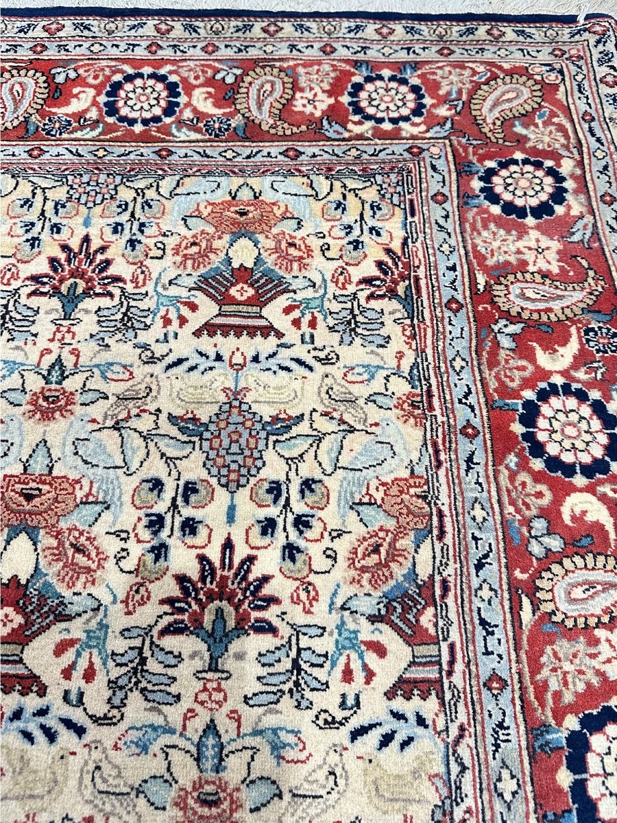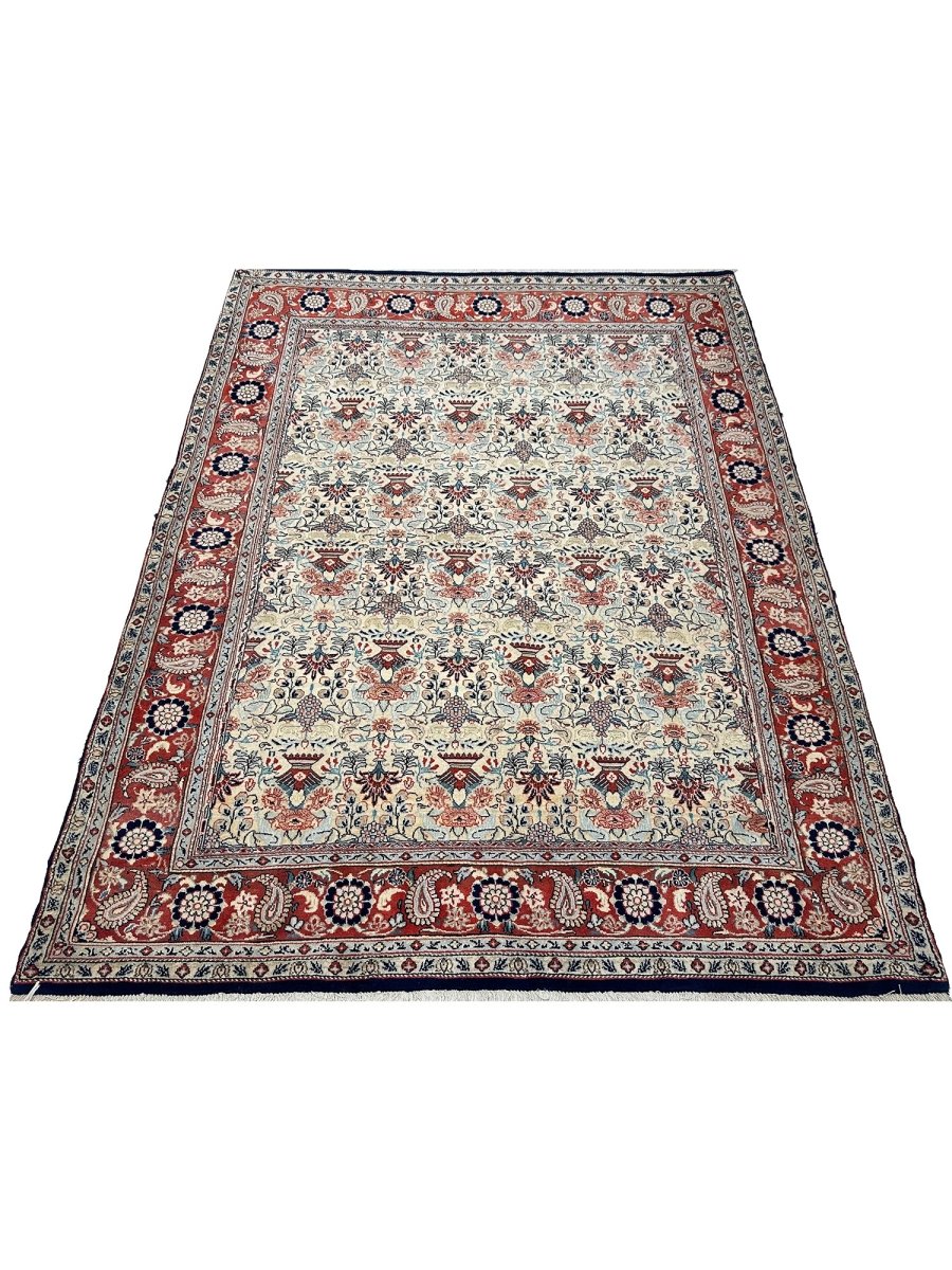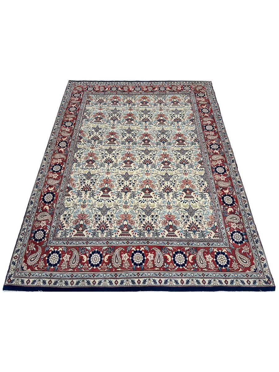 5x7 Persian Varamin area rug, a timeless piece originating from Persia, hand-knotted luxury and fine craftsmanship with wool of fine quality that blends durability with timeless beauty. Elegant repeated floral patterns in vibrant red and ivory colors, this item adds elegance to your space through its true charm and cultural heritage. A collector's item, it reflects the sophistication and artistry of Persian weaving traditions. Free delivery all around the US.