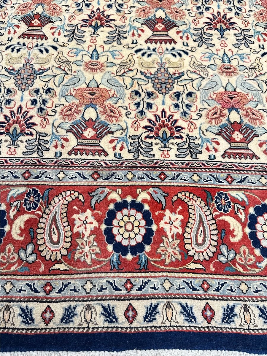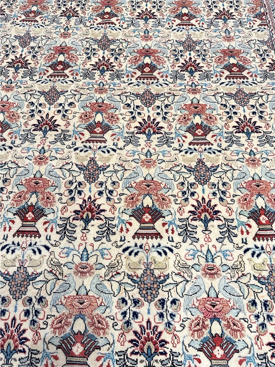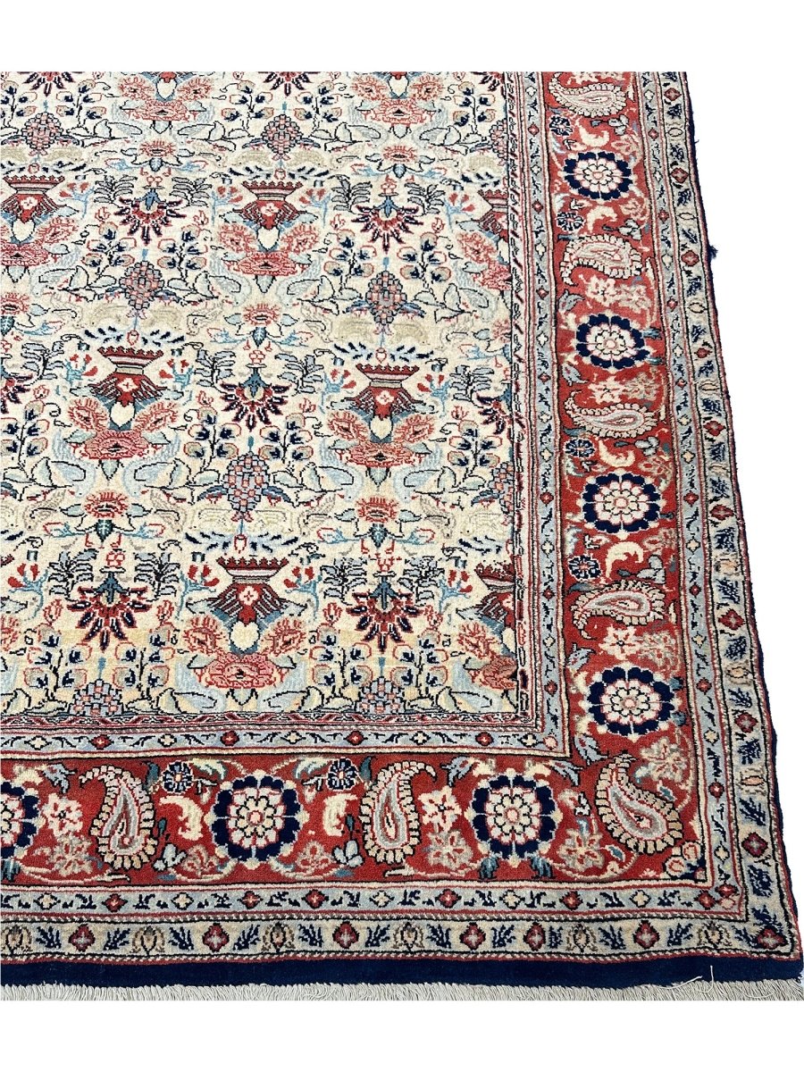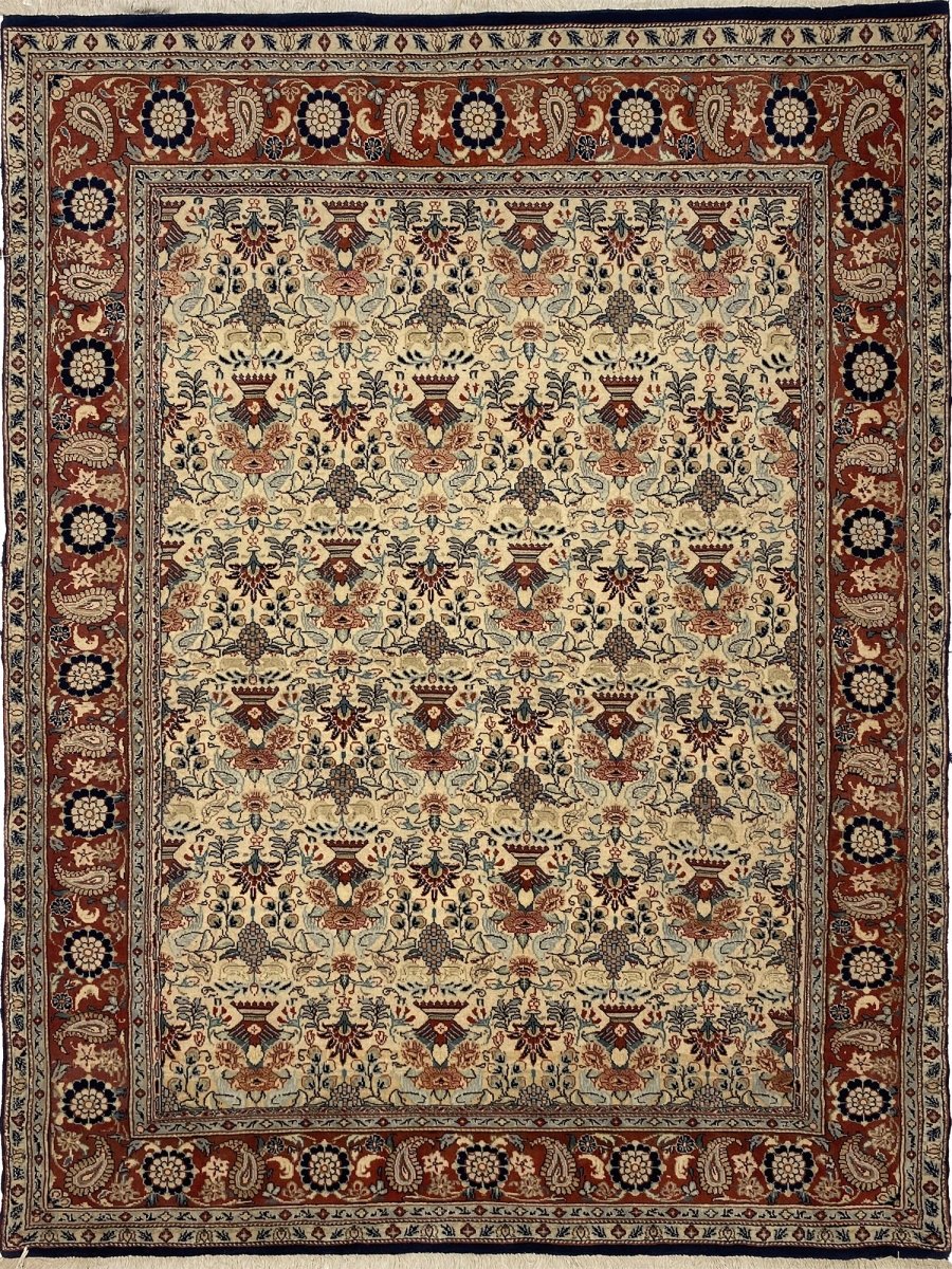 5x7 Persian Varamin area rug, a timeless piece originating from Persia, hand-knotted luxury and fine craftsmanship with wool of fine quality that blends durability with timeless beauty. Elegant repeated floral patterns in vibrant red and ivory colors, this item adds elegance to your space through its true charm and cultural heritage. A collector's item, it reflects the sophistication and artistry of Persian weaving traditions. Free delivery all around the US.