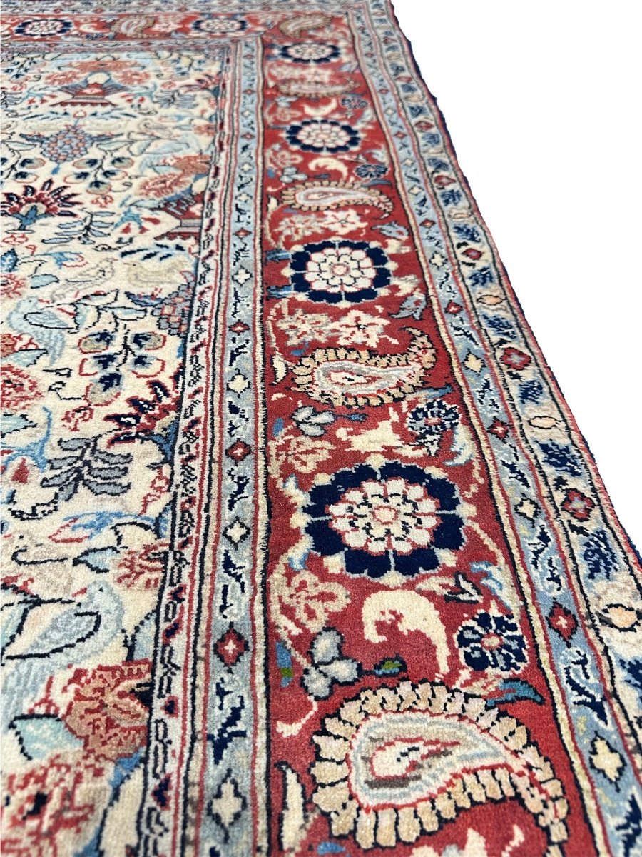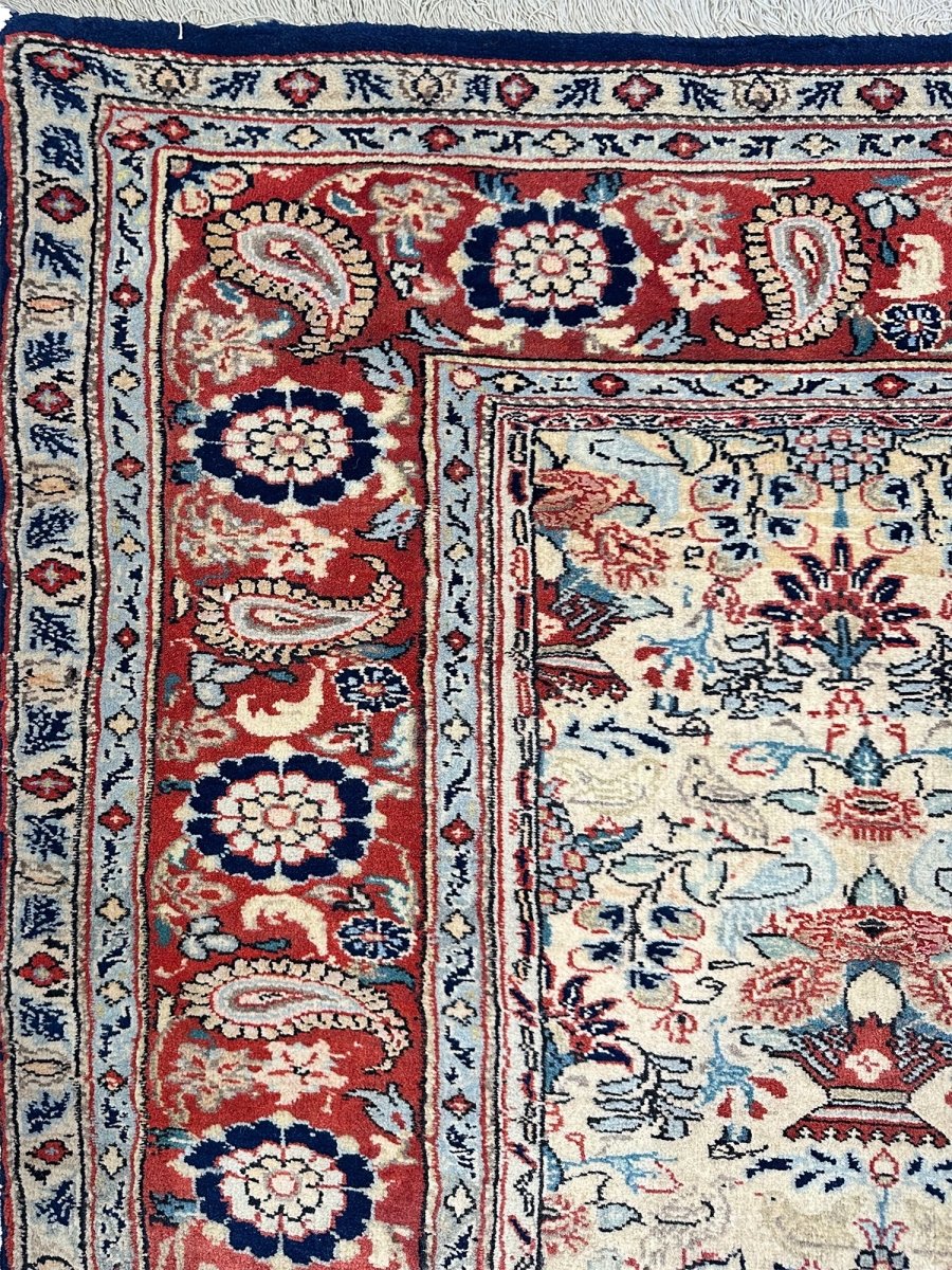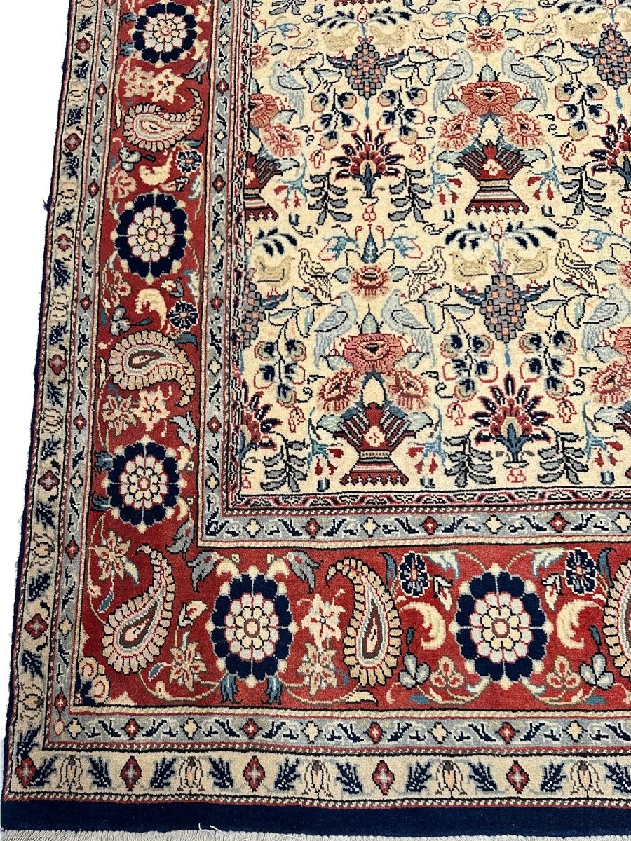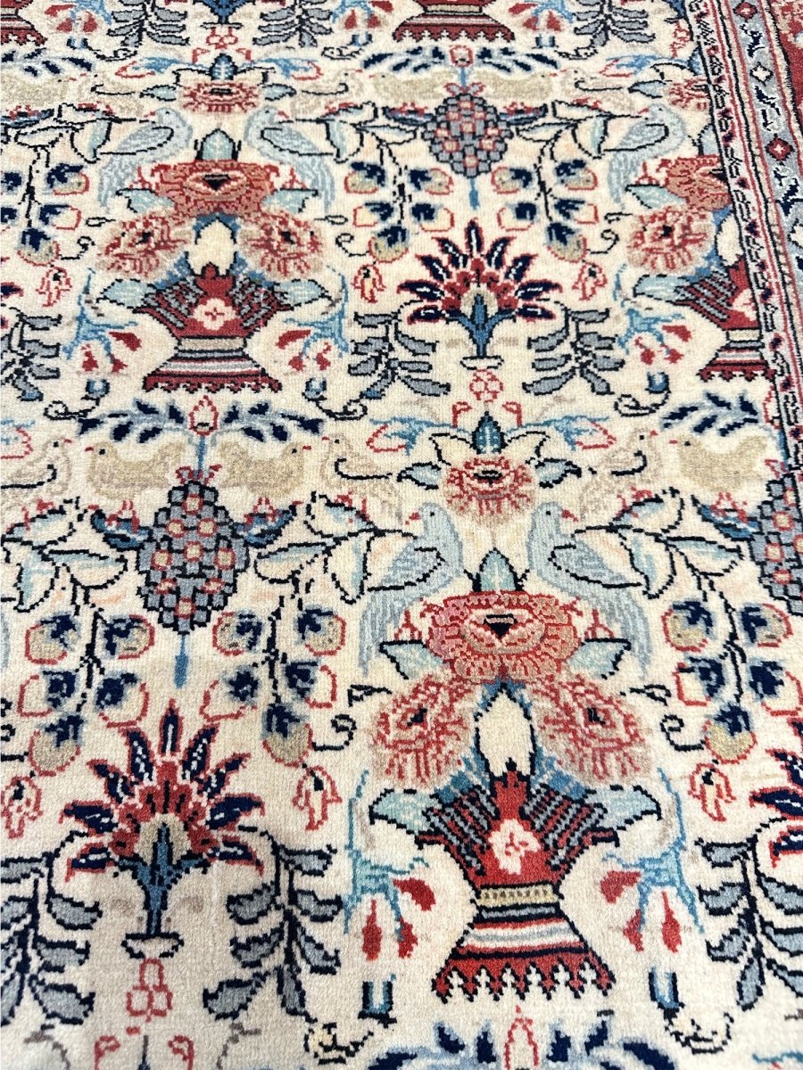 5x7 Persian Varamin area rug, a timeless piece originating from Persia, hand-knotted luxury and fine craftsmanship with wool of fine quality that blends durability with timeless beauty. Elegant repeated floral patterns in vibrant red and ivory colors, this item adds elegance to your space through its true charm and cultural heritage. A collector's item, it reflects the sophistication and artistry of Persian weaving traditions. Free delivery all around the US.