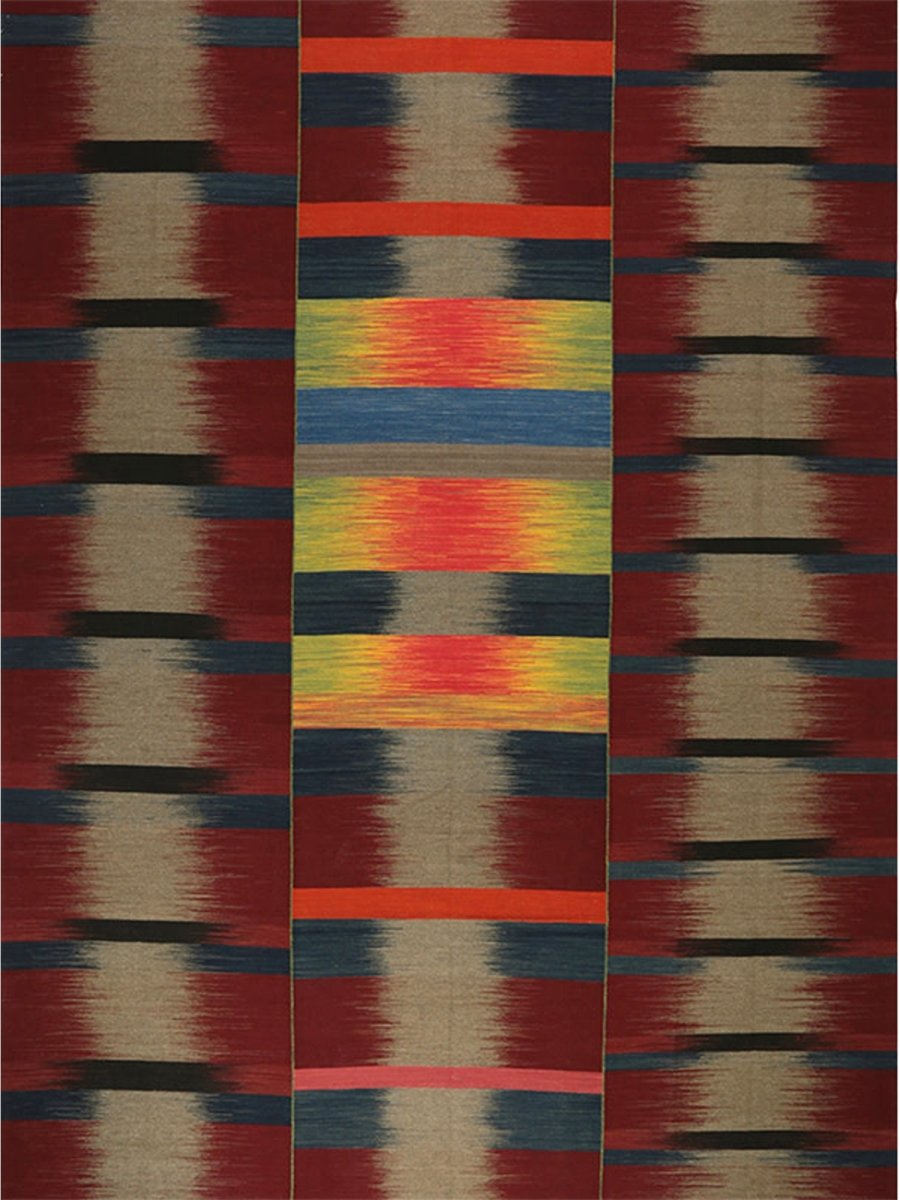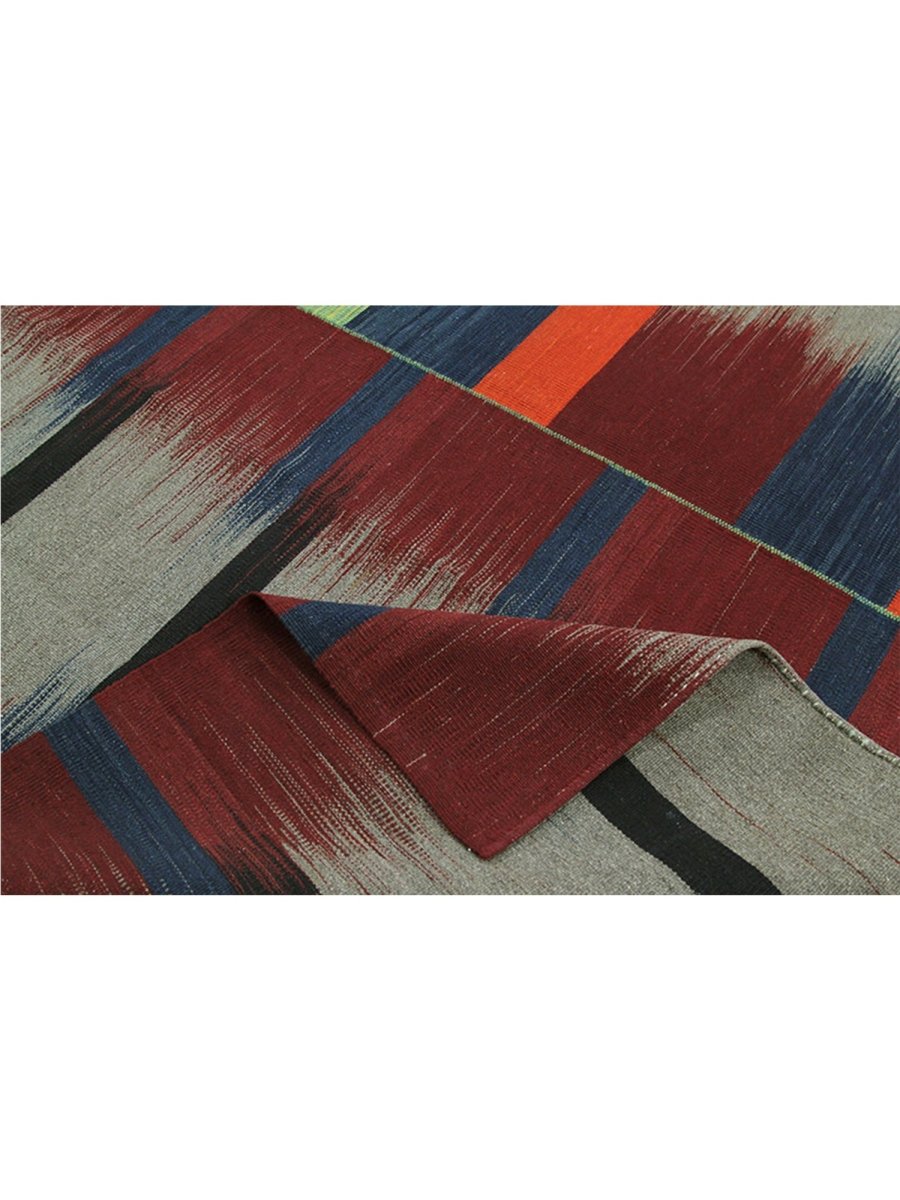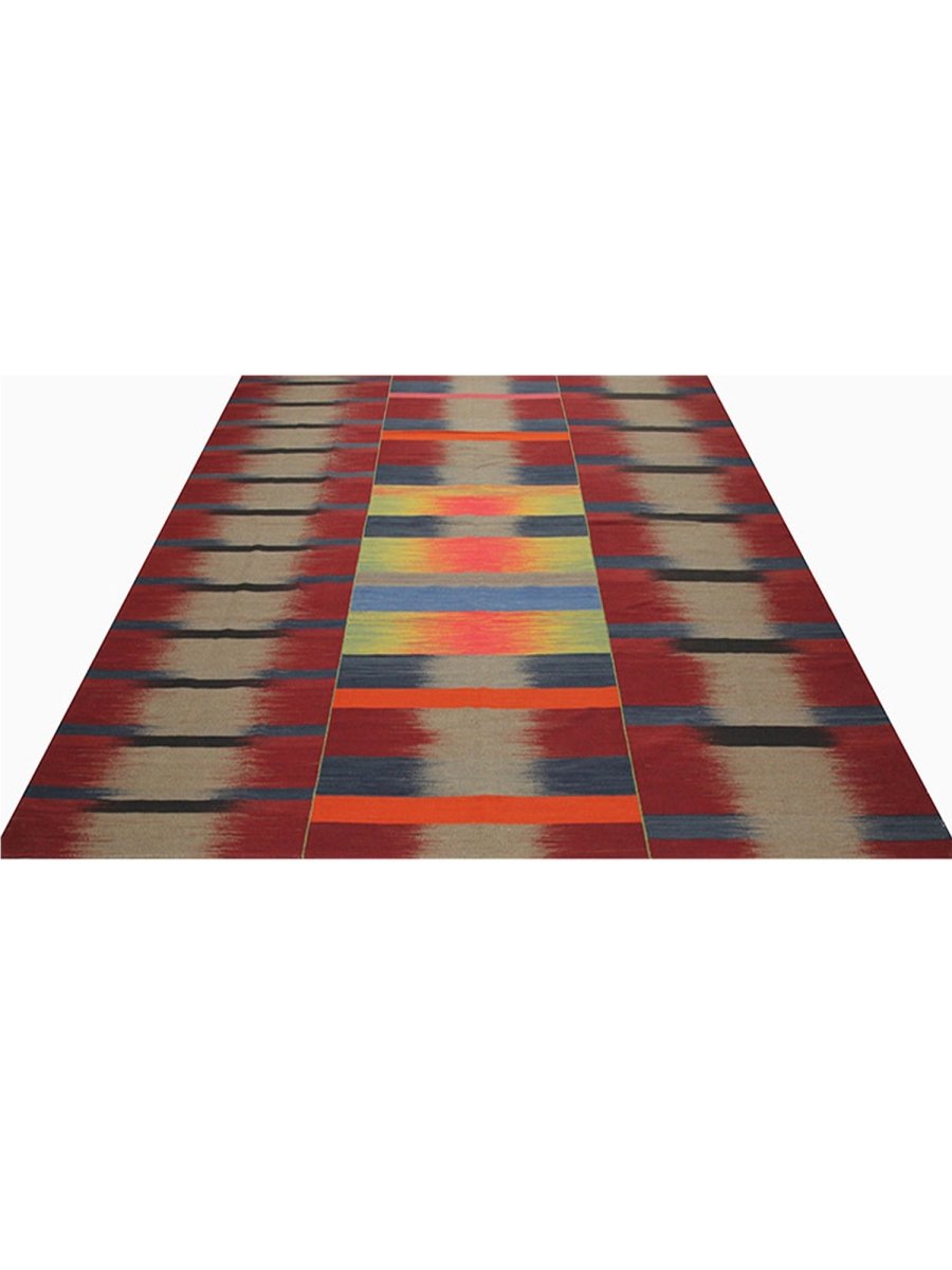 This 10x13 red and gray Persian kilim rug is a stunning example of Persian weaving, boasting a beautiful striped pattern that seamlessly blends shades of red, grey, blue, and beige, creating a sense of timeless elegance that will elevate any room to new heights. With its flat-weave construction and bold color palette, this rug is perfect for those who want to add a touch of sophistication and refinement to their home decor. The rug's durable construction ensures it will withstand daily life's wear and tear. This rug will become a stunning focal point, drawing the eye and commanding attention.