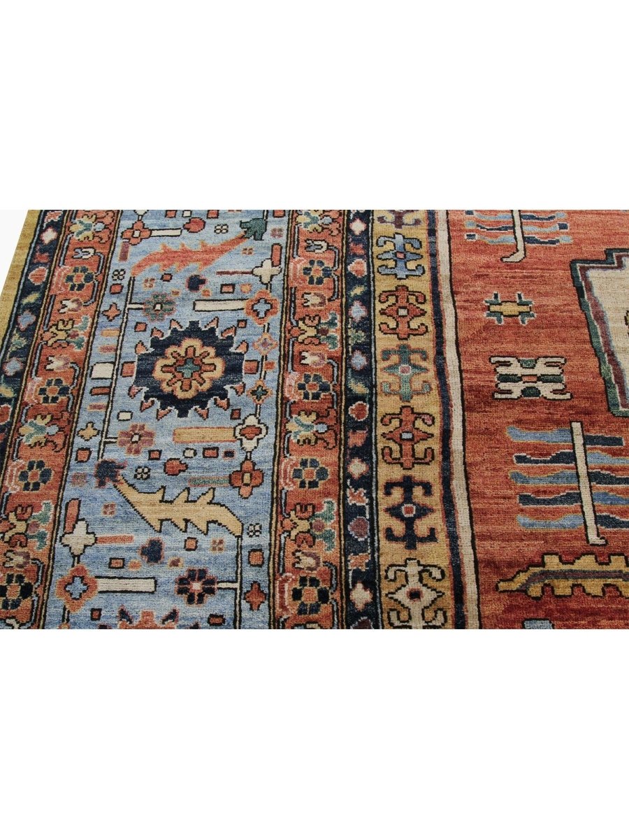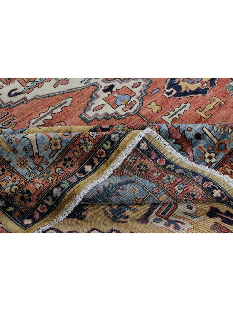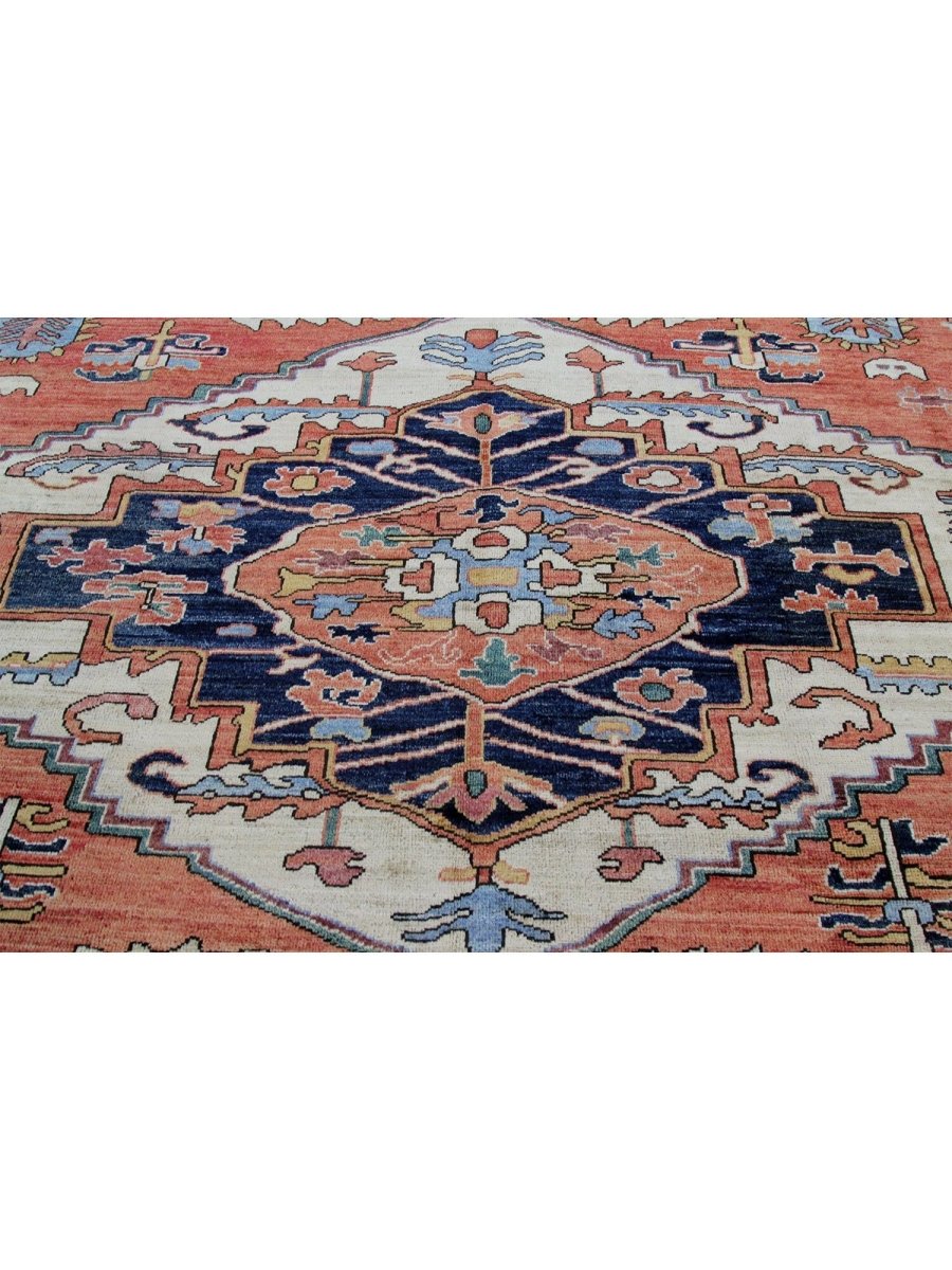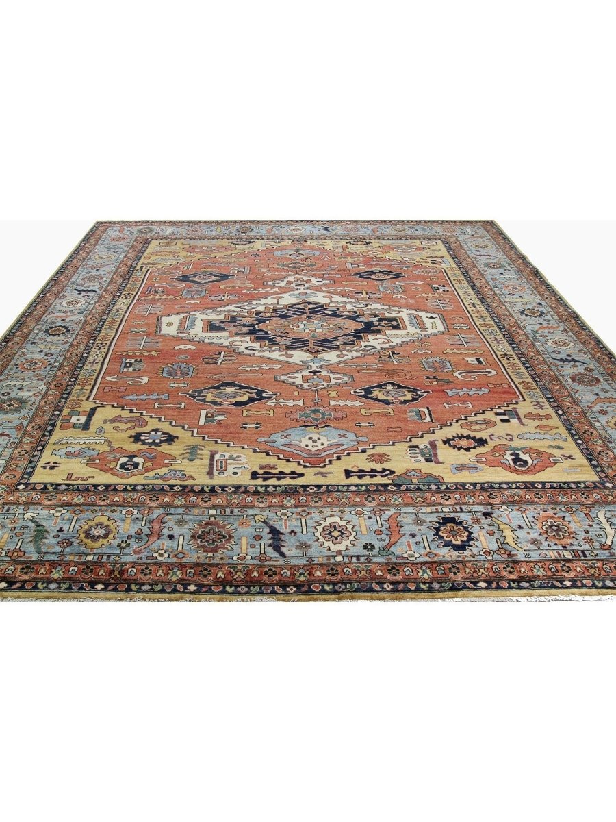 Add a touch of timeless beauty to your home with this 12x15 Handwoven Serapi style area rug, crafted in Pakistan. This rug features a bold geometric pattern striking with a central medallion, showcasing traditional motifs including a rich orange, red, deep blue, and gold palette. Its hand-knotted wool construction ensures durability and lasting beauty and is perfect for spacious living rooms, elegant dining areas, and grand bedrooms. Intricate border detail reflects the artisan's skill and timeless design. This piece effortlessly enhances your decor while adding warmth, texture, and sophistication. A true blend of artistry and function easily brings heritage charm into any space. Enjoy the benefit of free shipping across the United States. Each rug is a one-of-a-kind with subtle variations highlighting its handmade nature.
