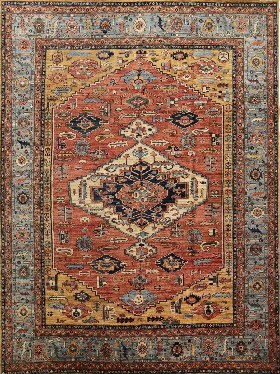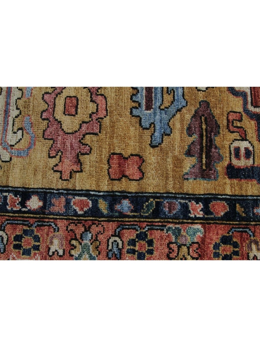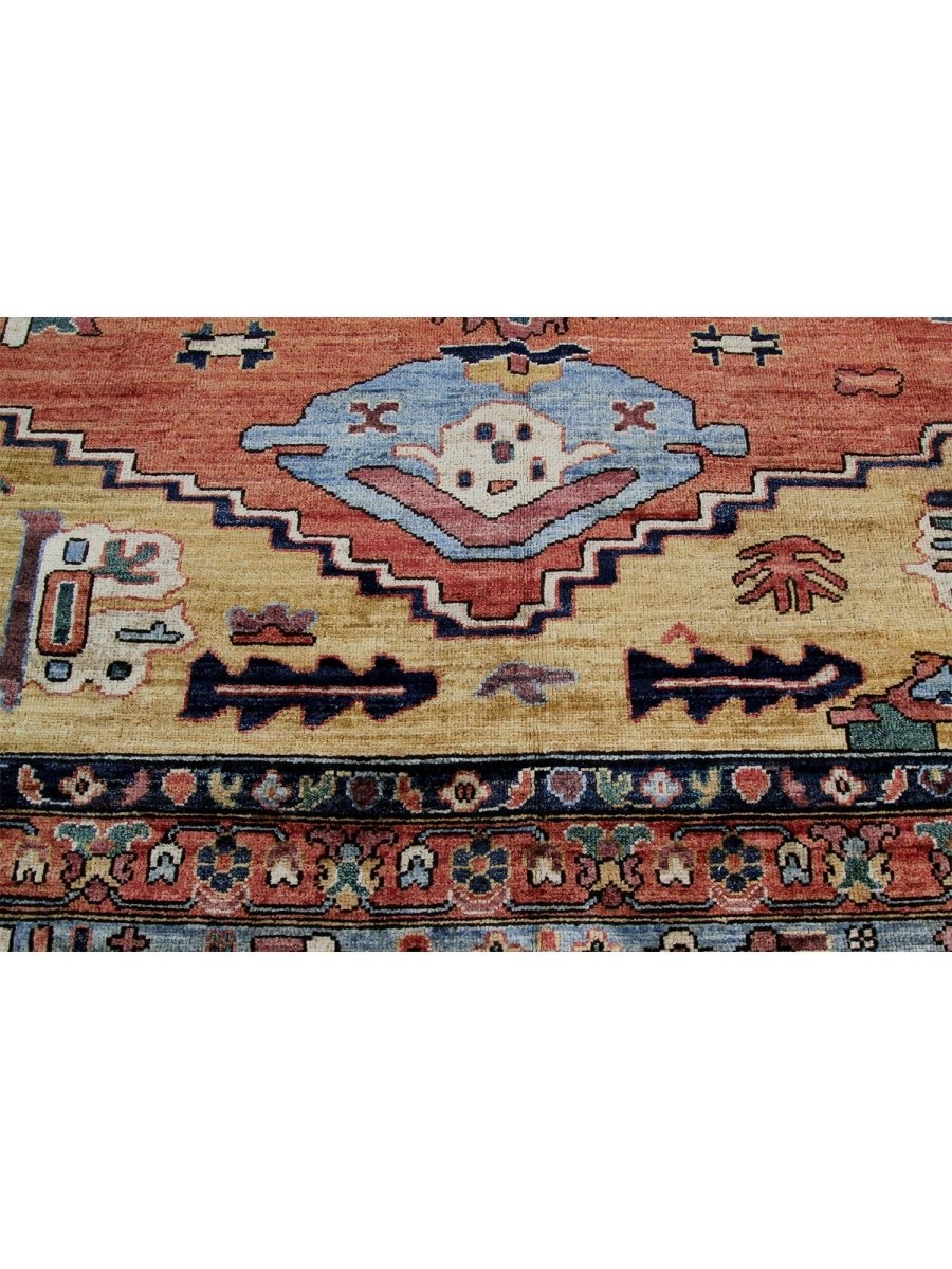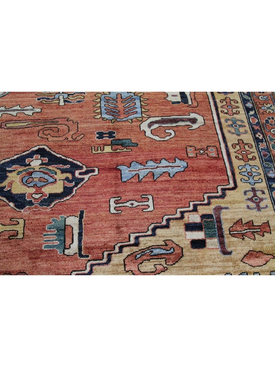 Add a touch of timeless beauty to your home with this 12x15 Handwoven Serapi style area rug, crafted in Pakistan. This rug features a bold geometric pattern striking with a central medallion, showcasing traditional motifs including a rich orange, red, deep blue, and gold palette. Its hand-knotted wool construction ensures durability and lasting beauty and is perfect for spacious living rooms, elegant dining areas, and grand bedrooms. Intricate border detail reflects the artisan's skill and timeless design. This piece effortlessly enhances your decor while adding warmth, texture, and sophistication. A true blend of artistry and function easily brings heritage charm into any space. Enjoy the benefit of free shipping across the United States. Each rug is a one-of-a-kind with subtle variations highlighting its handmade nature.