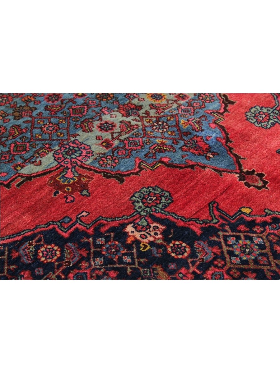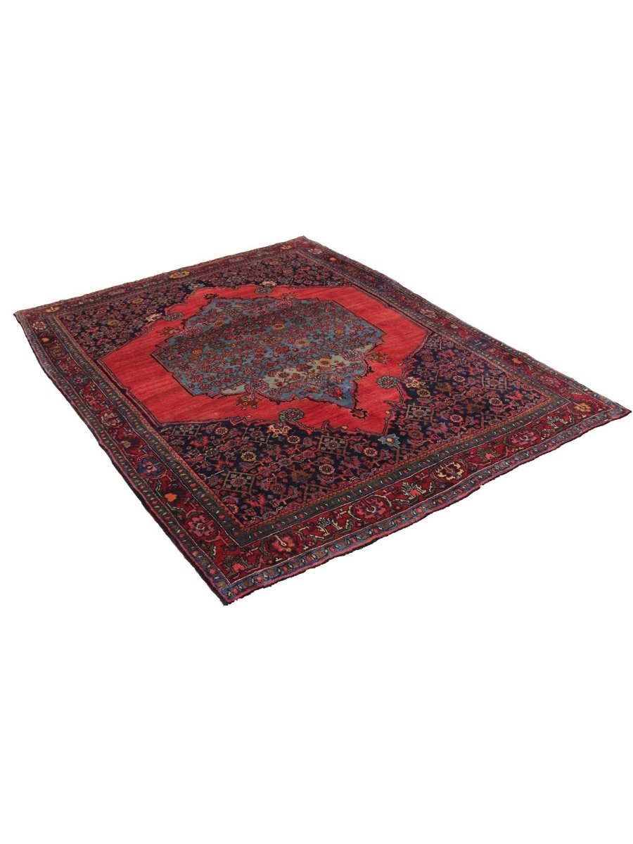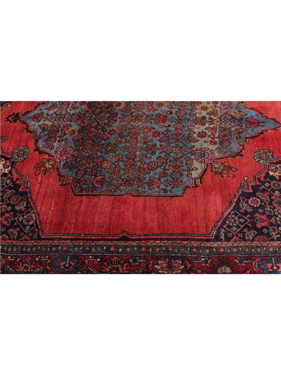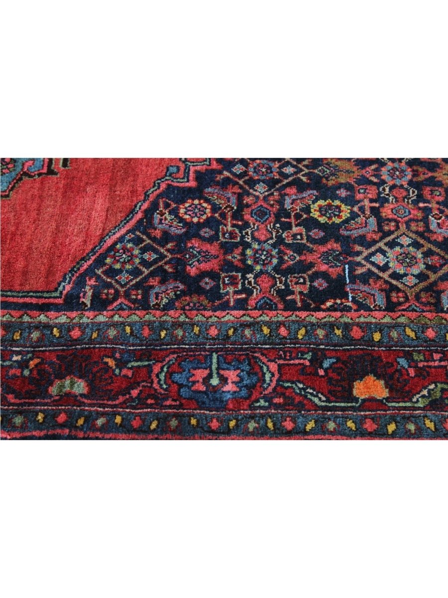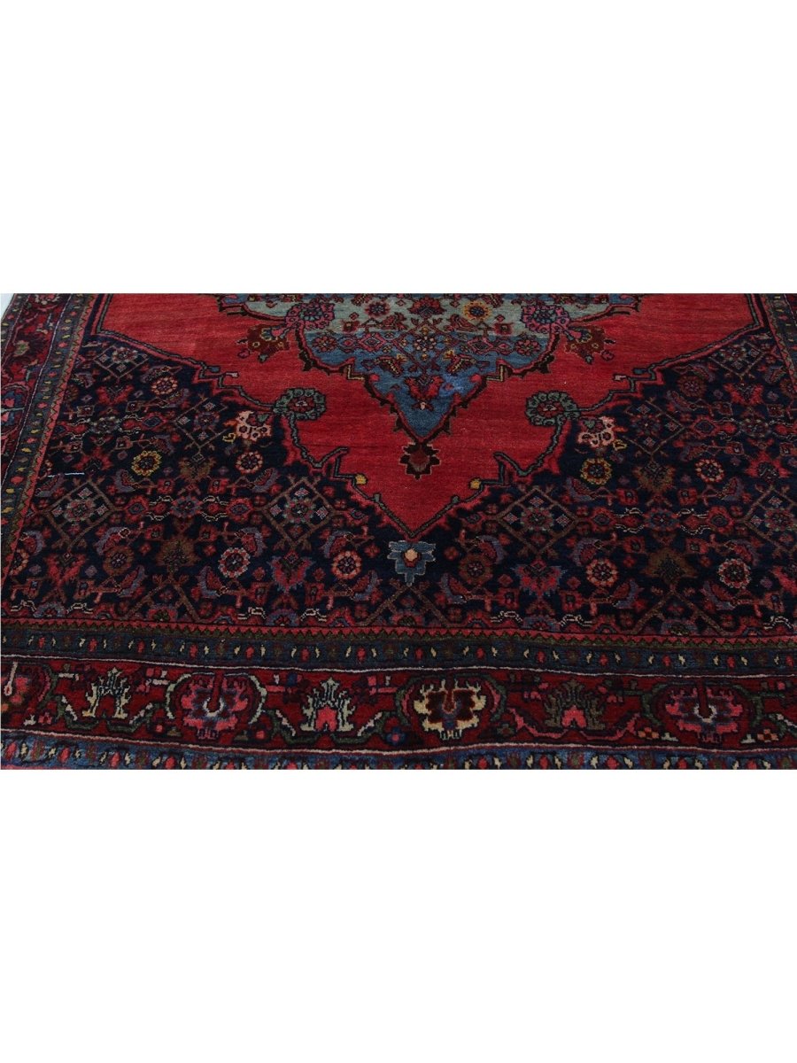 Crafted by hand in Persia, this 4x5 Persian Bijar area rug is a stunning mix of strength and beauty. It features a bold central medallion pattern set against a rich red field, surrounded by intricate geometric motifs in deep navy and soft blue tones. Known for their durability, Bijar rugs are tightly woven with high-quality wool, making them both resilient and long-lasting. The medallion design brings balance and symmetry to the piece, making it an excellent choice for small living rooms, bedrooms, or office spaces. This handmade rug seamlessly blends artistry with everyday functionality, and it ships free within the United States.