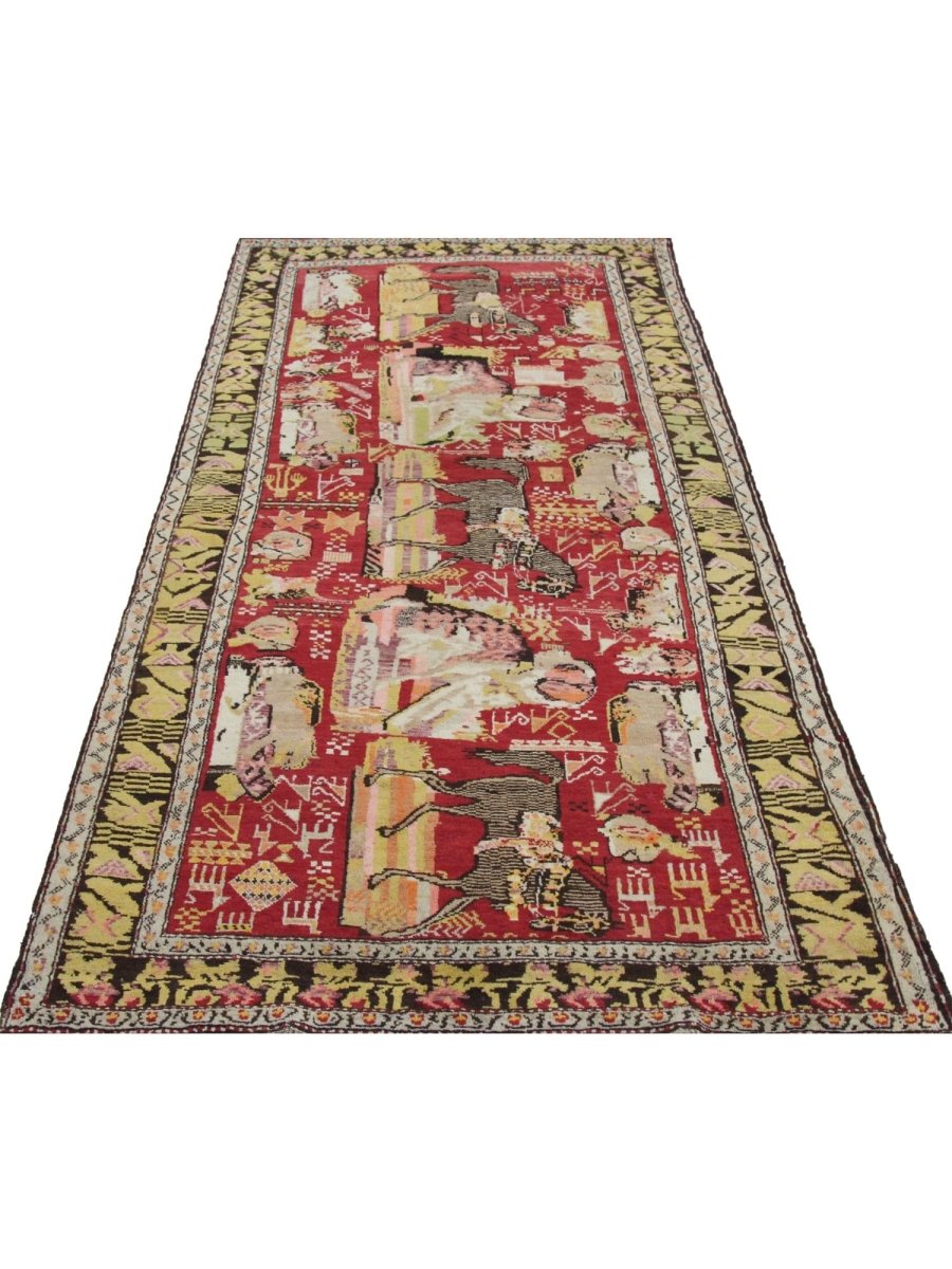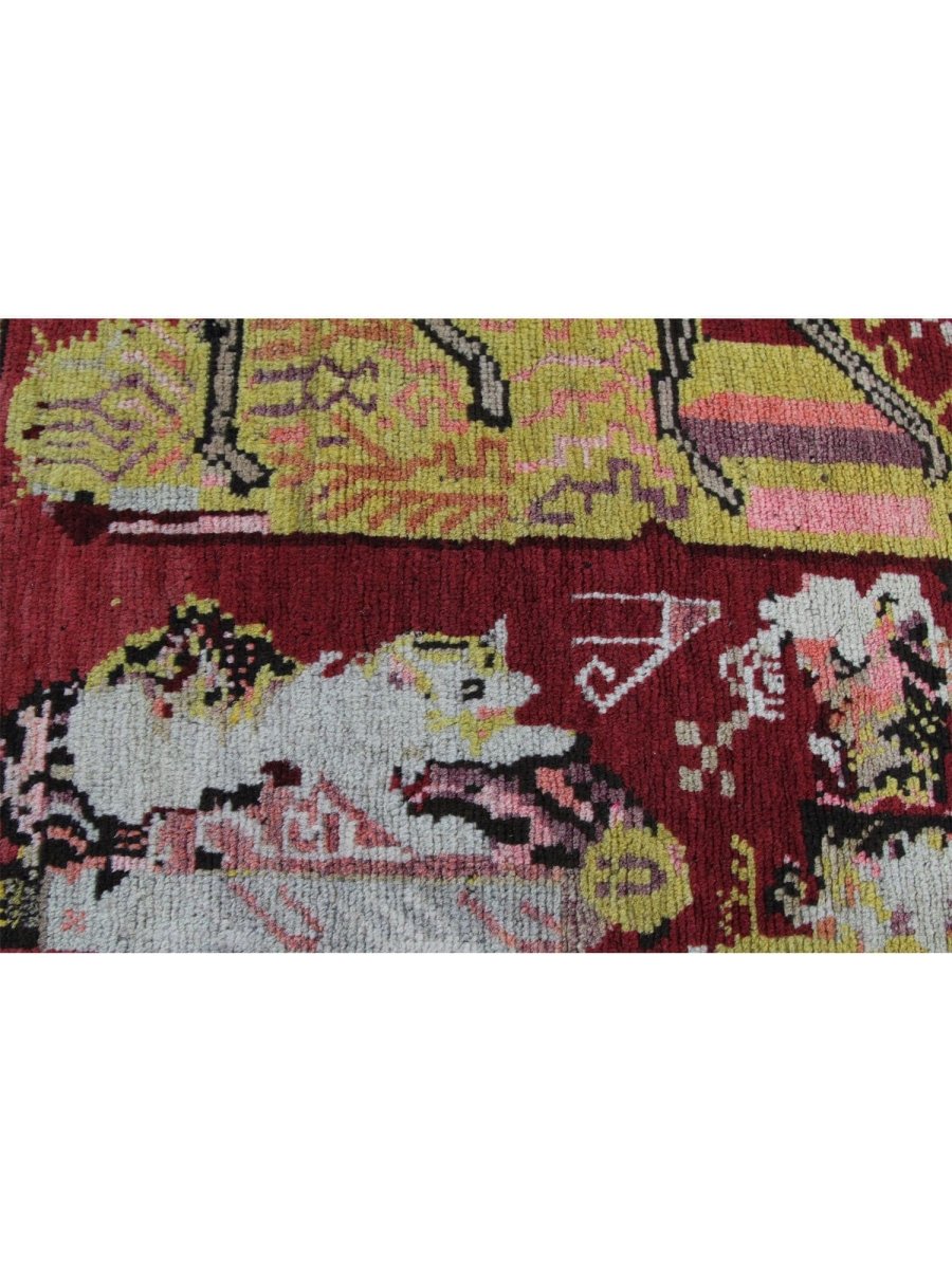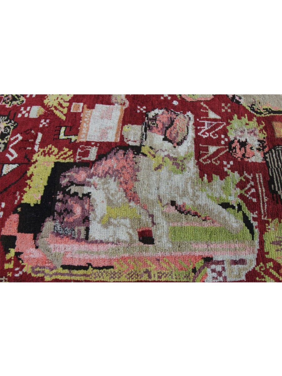 This 4x9 Antique Russian Runner Rug, hand-knotted from premium wool adds a unique touch to your hallway or entryway. Featuring an eye-catching animal pattern in vibrant red, deep black, warm yellow, soft beige, and rich brown, it brings a blend of artistic flair and traditional craftsmanship. The plush texture offers comfort underfoot, while its durable construction ensures it withstands everyday wear. Perfect for adding character and warmth to both eclectic and classic interiors. Enjoy free shipping within the US for a hassle-free purchase.