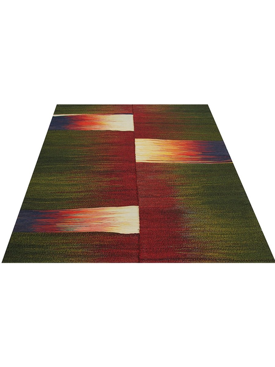 Bring a touch of nature and serenity to your space with this stunning 5x6 green Persian kilim area rug. Hand-woven in Persia using classic techniques, this rug boasts a beautiful striped pattern showcasing a palette of soothing green, vibrant red, and warm orange hues. The wool material ensures a soft and durable texture underfoot, while the flat-weave construction adds a touch of authenticity and charm.
