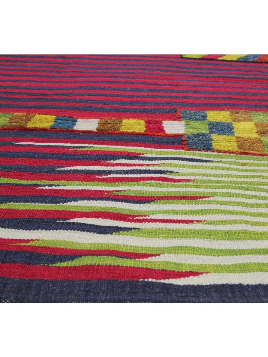 This charming 5x6 Persian Kilim area rug is a delightful addition to any room, boasting a stunning color palette that adds a touch of warmth and sophistication. Made from high-quality wool using a hand-knotted construction, it features a beautiful combination of Charcoal gray, red, green, yellow, and beige hues, perfectly balanced to create a sense of energy and vitality. The vibrant pattern adds a touch of dynamism and visual interest to the rug's design, which is characterized by intricate motifs and subtle color gradations. With its compact size of 4'7" x 5'10", this Persian Kilim area rug is perfect for adding a touch of elegance. Its exceptional quality and beautiful design make it a valuable addition to any home. Whether displayed in a formal setting or a cozy retreat, this Persian Kilim area rug is sure to impress.