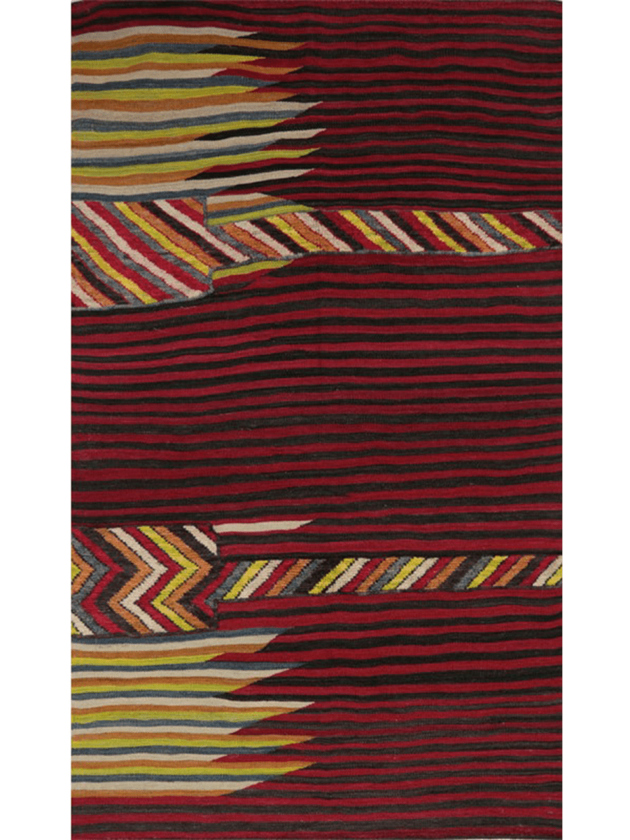 Infuse your space with the vibrant energy of this stunning 5x7 red Persian kilim area rug. Expertly hand-knotted in Persia, this rug boasts a striking striped pattern that showcases a bold red, blue, yellow, and beige colors perfectly balanced by deep black accents and vibrant stripes. The wool material ensures a soft and durable texture underfoot, while the kilim construction adds a touch of rustic charm. Whether you're looking to add a pop of color to a neutral room or create a bold and eclectic space, this rug is sure to make a statement. Its unique blend of Persian design and color palette makes it a perfect choice for those who want to add a touch of global style to their home decor. With its bold colors and striking pattern, this rug is sure to become a conversation starter in any room.
