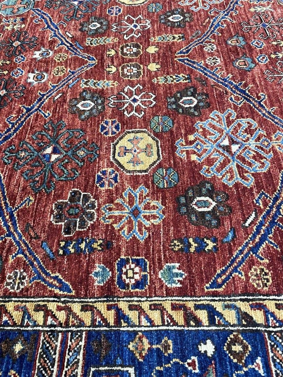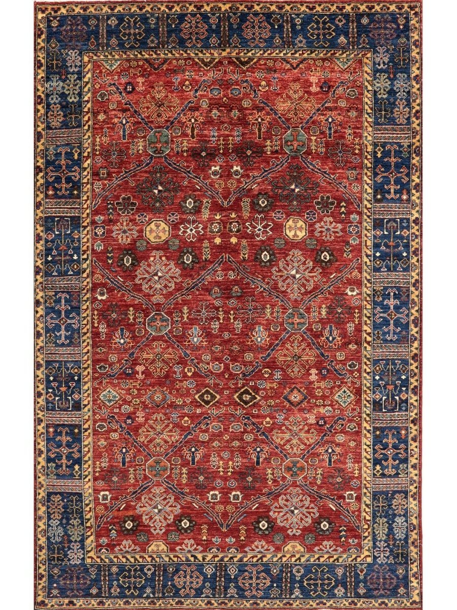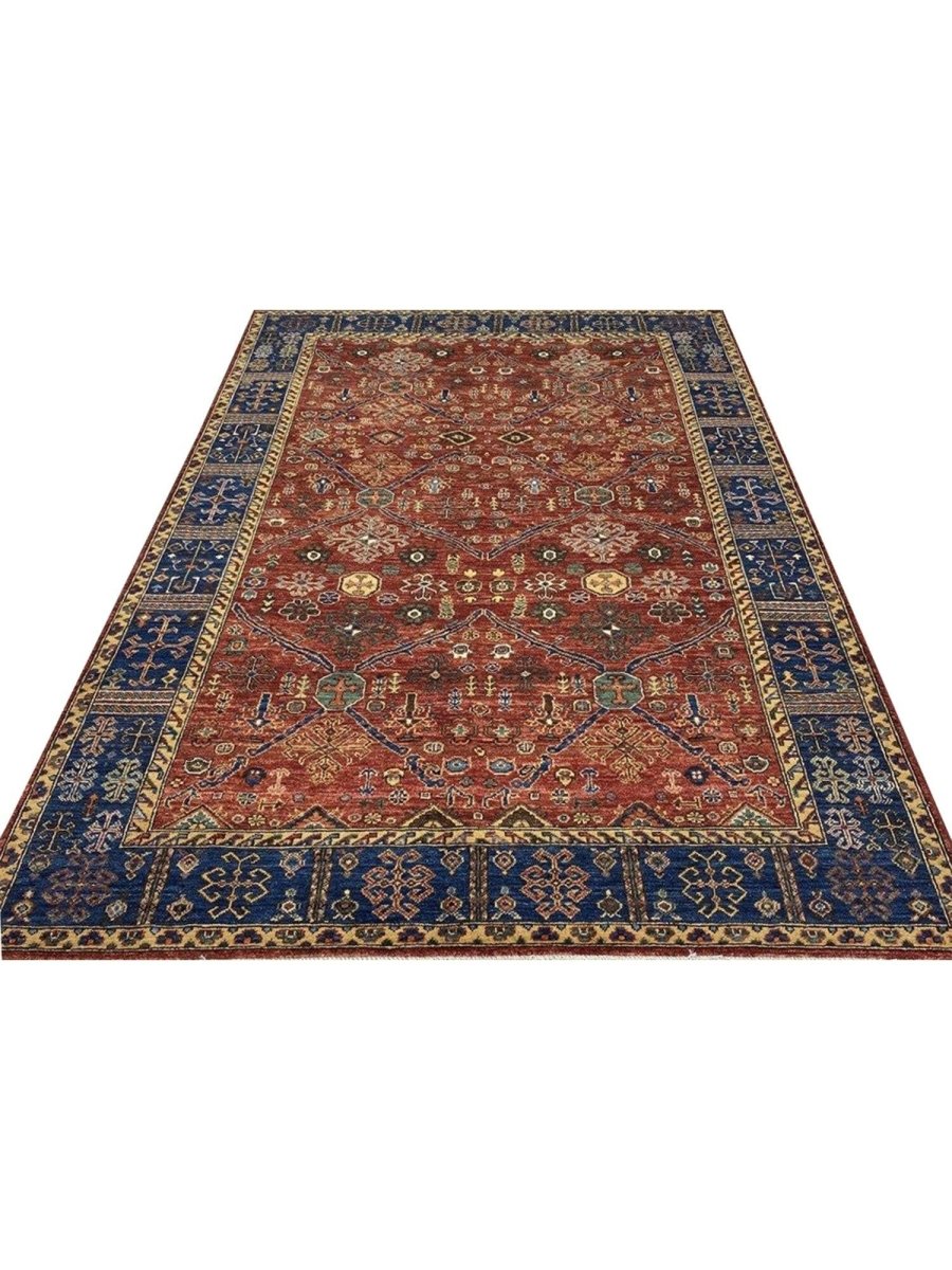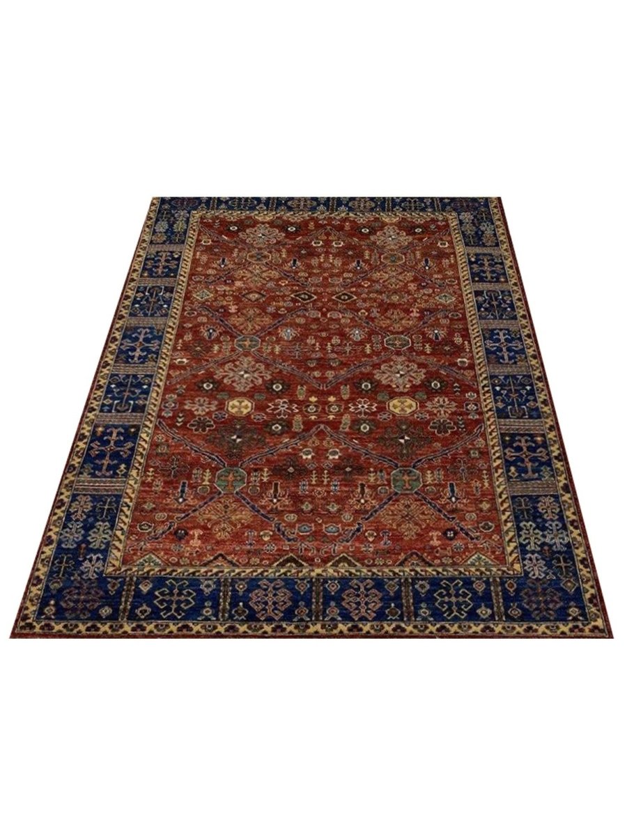 Add a touch of classic elegance to your home with this 5x8 Handwoven Heriz Style Area Rug, crafted in Pakistan. This rug features a bold geometric pattern, showcasing traditional Persian-inspired motifs in a rich red, navy, ivory, and gold palette. Its hand-knotted wool construction ensures durability and long-lasting beauty, perfect for living rooms, dining spaces, or bedrooms. The striking and intricate border detail reflects the artisan's skill and the timeless design heritage. This piece effortlessly complements while adding warmth, texture, and sophistication. A true blend of artistry and function, it easily brings heritage charm into any space. Enjoy the added benefit of free shipping across the United States.