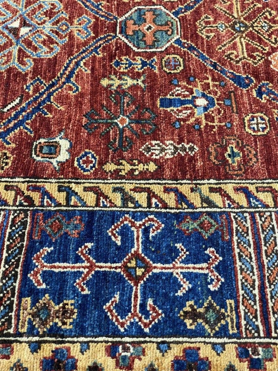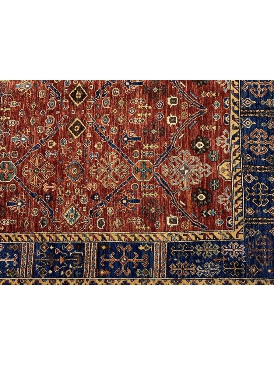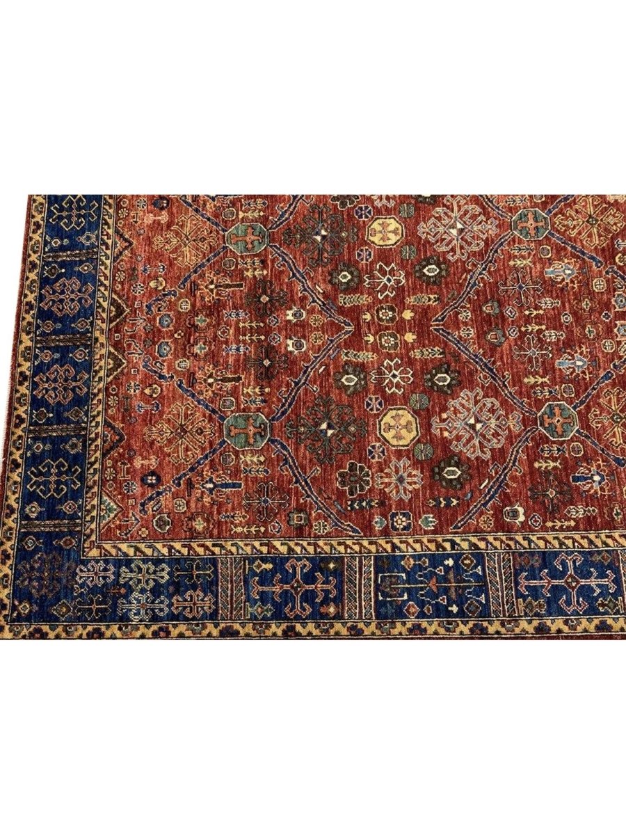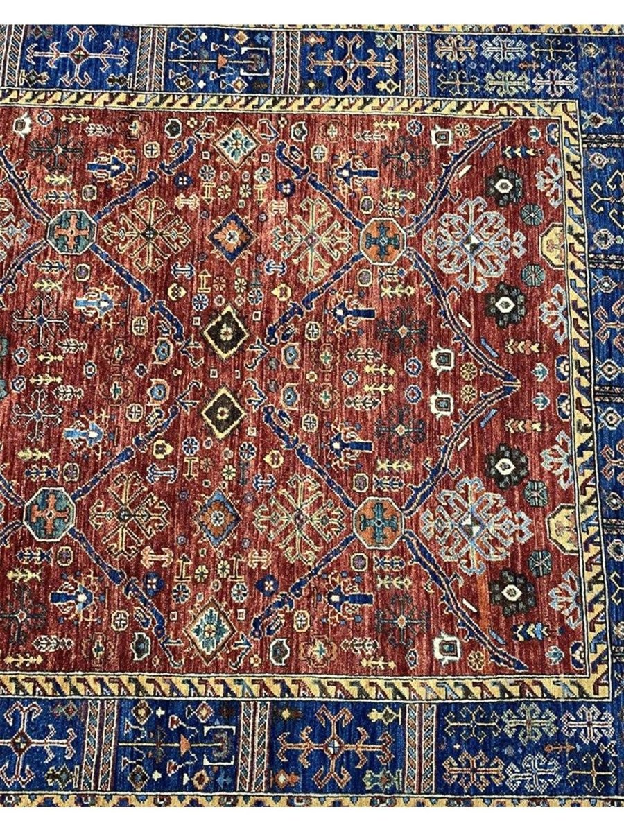 Add a touch of classic elegance to your home with this 5x8 Handwoven Heriz Style Area Rug, crafted in Pakistan. This rug features a bold geometric pattern, showcasing traditional Persian-inspired motifs in a rich red, navy, ivory, and gold palette. Its hand-knotted wool construction ensures durability and long-lasting beauty, perfect for living rooms, dining spaces, or bedrooms. The striking and intricate border detail reflects the artisan's skill and the timeless design heritage. This piece effortlessly complements while adding warmth, texture, and sophistication. A true blend of artistry and function, it easily brings heritage charm into any space. Enjoy the added benefit of free shipping across the United States.