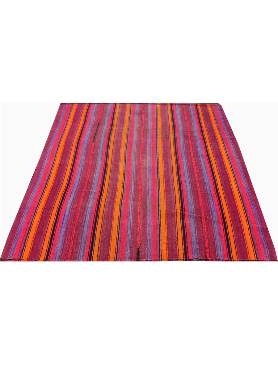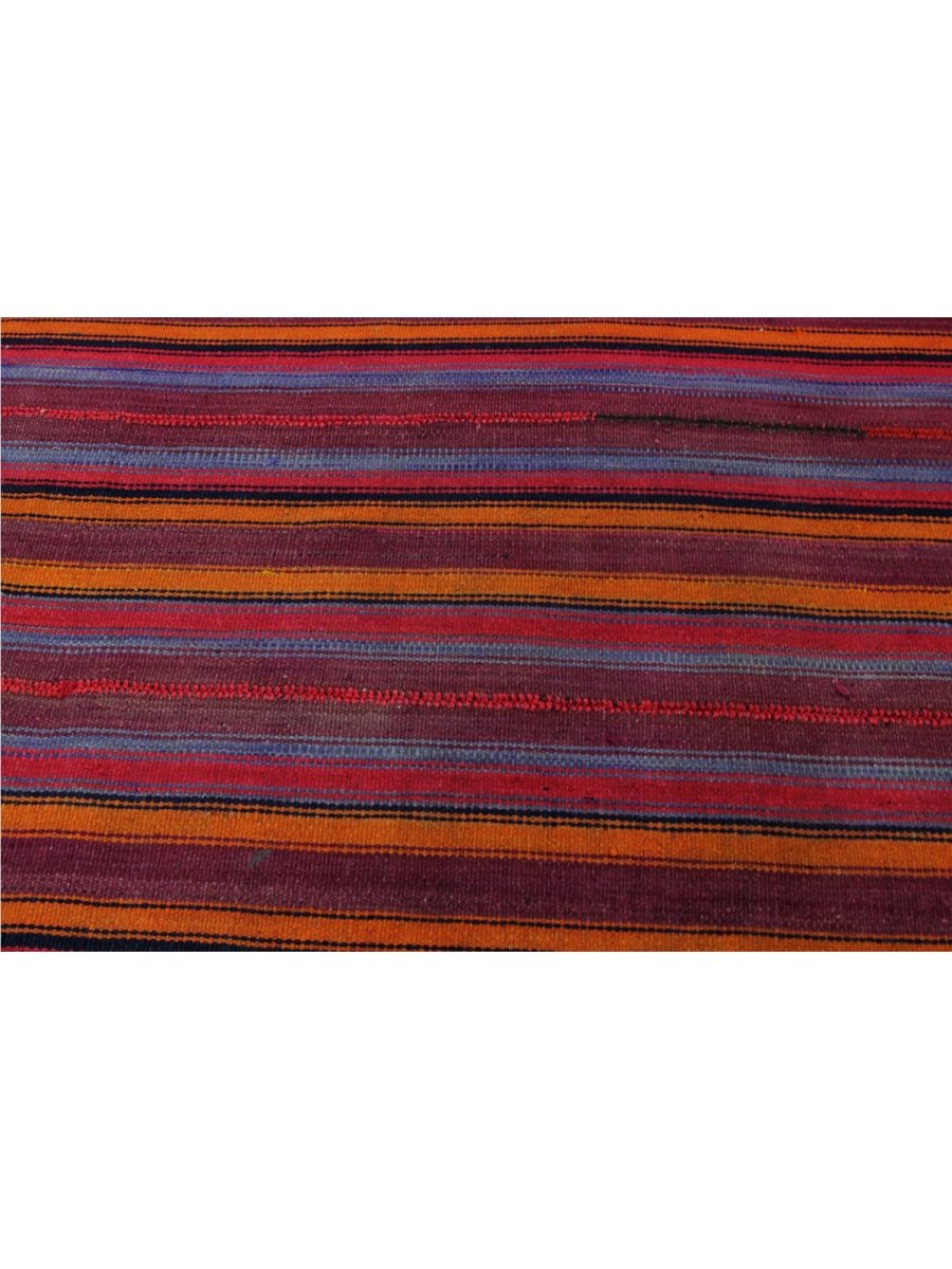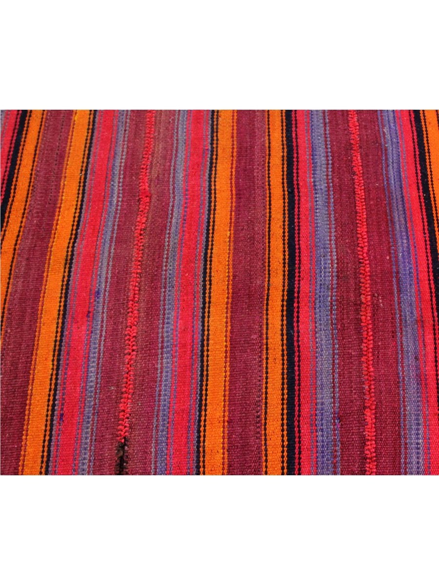 This charming 6x7 Orange Old Persian rug is a unique and authentic addition to any room, boasting a stunning color palette that adds a touch of warmth and character. Made from high-quality wool using a flat-weave construction, it features a beautiful maroon-colored base with a vibrant striped pattern in black, orange, blue, and red hues, perfectly balanced to create a sense of energy and vitality.