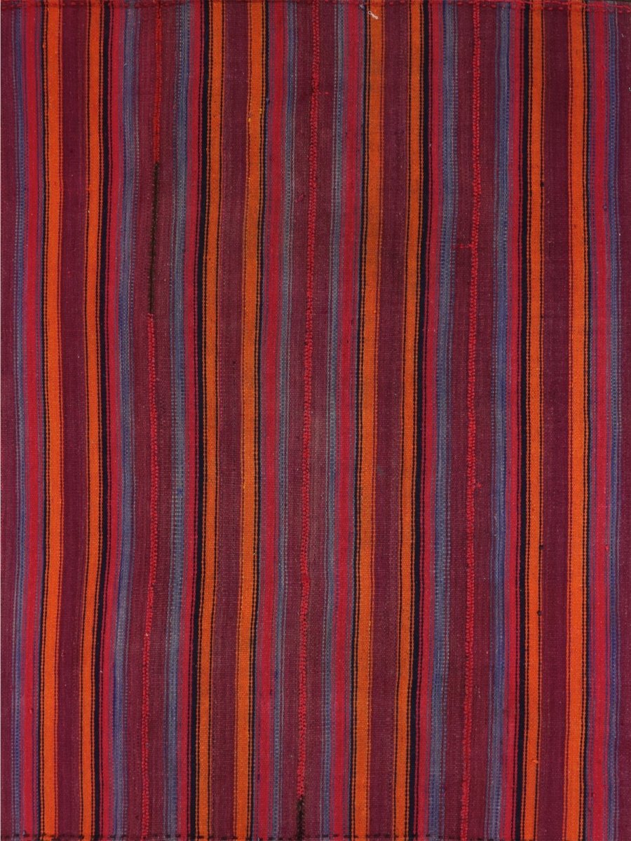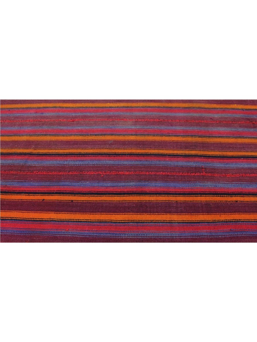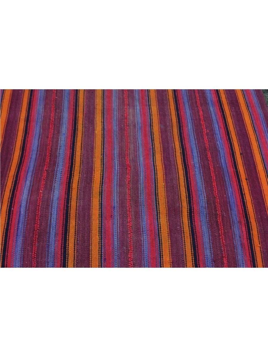 This charming 6x7 Orange Old Persian rug is a unique and authentic addition to any room, boasting a stunning color palette that adds a touch of warmth and character. Made from high-quality wool using a flat-weave construction, it features a beautiful maroon-colored base with a vibrant striped pattern in black, orange, blue, and red hues, perfectly balanced to create a sense of energy and vitality.
