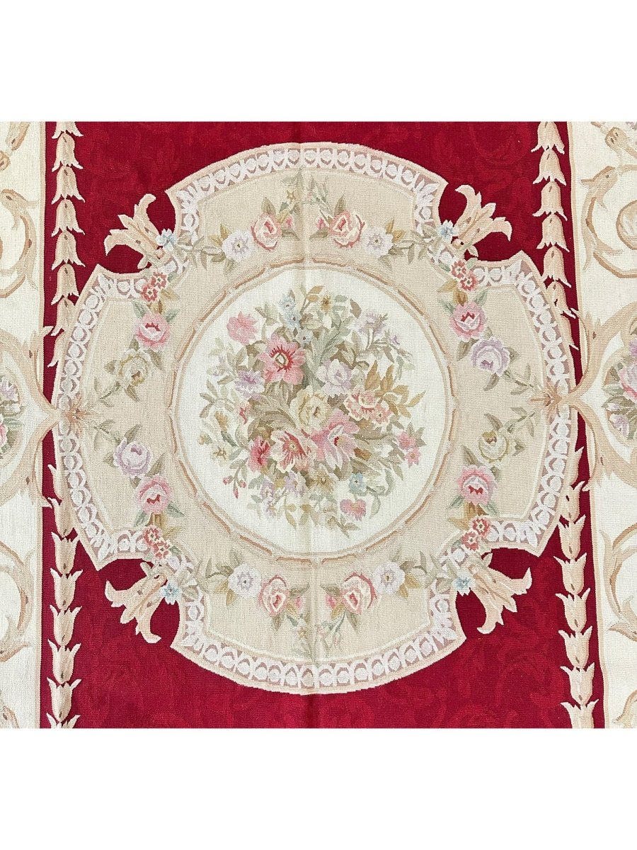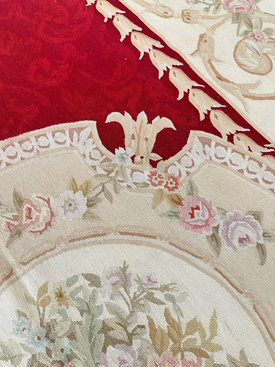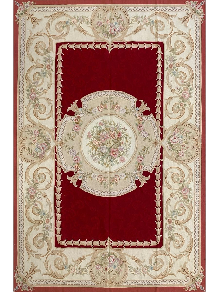 Add refined European elegance with this 6x9 French Aubusson Style Area Rug, hand-knotted in China from high-quality wool. Crafted in the tradition of classic French design, this rug features a rich red field complemented by cream and beige accents, creating a timeless, harmonious look.