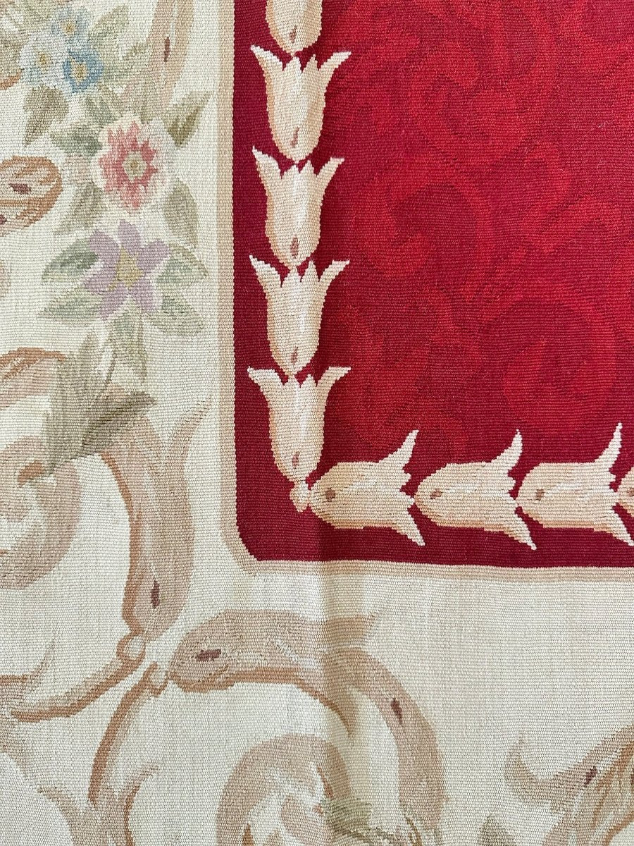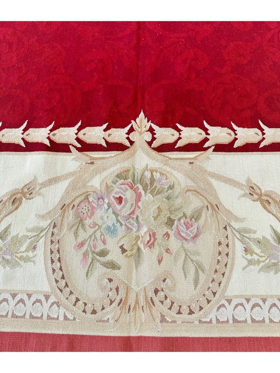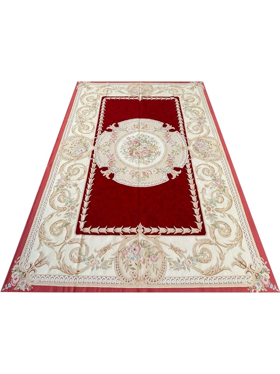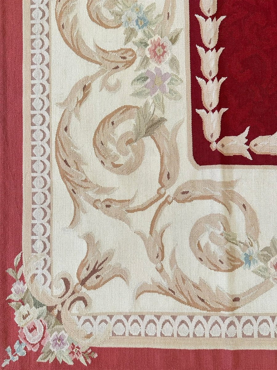 Add refined European elegance with this 6x9 French Aubusson Style Area Rug, hand-knotted in China from high-quality wool. Crafted in the tradition of classic French design, this rug features a rich red field complemented by cream and beige accents, creating a timeless, harmonious look.