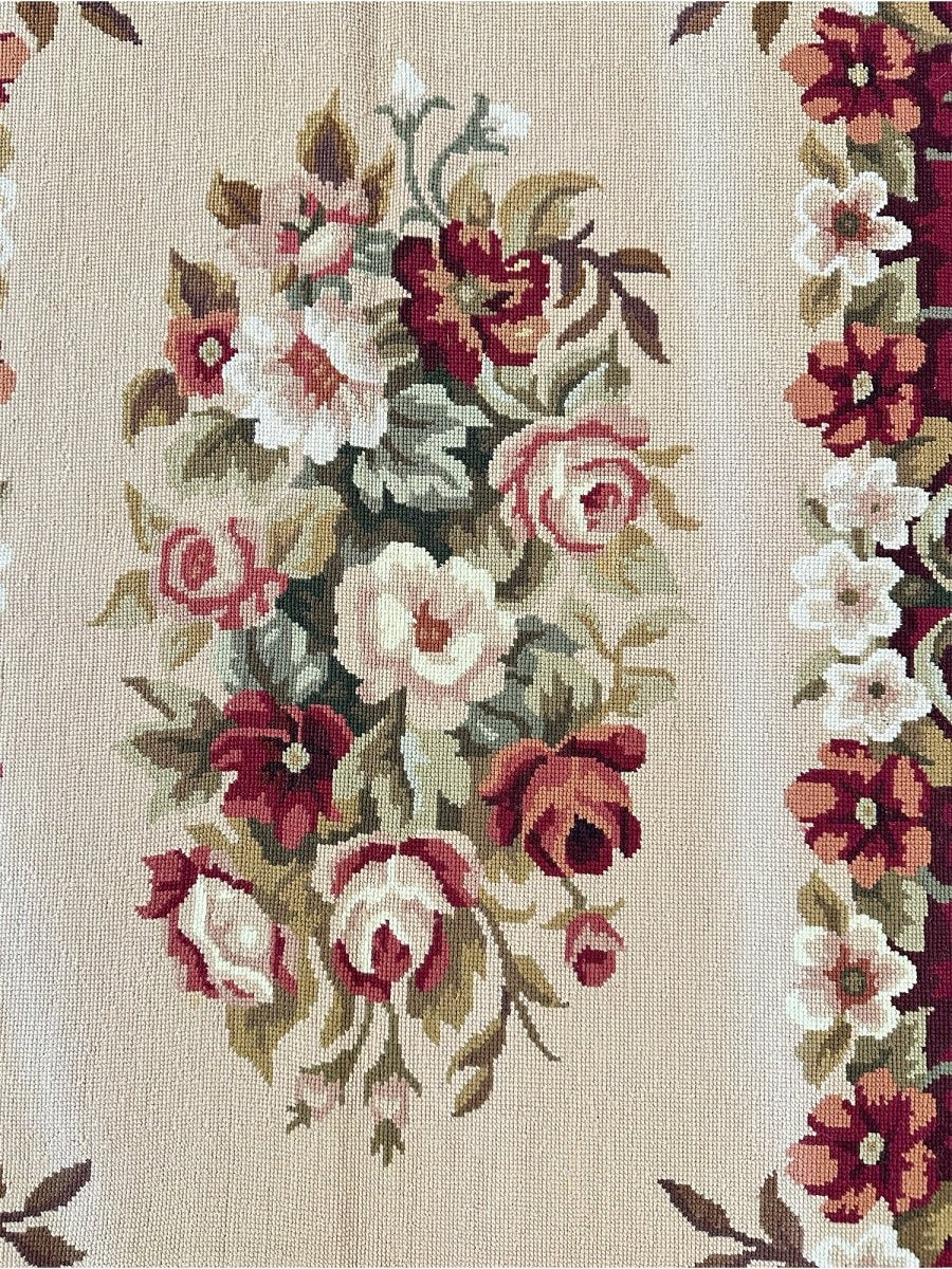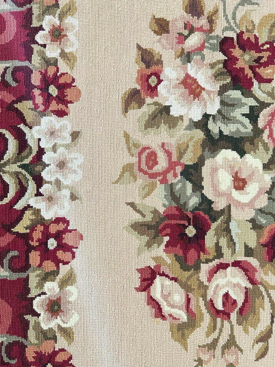 This 6x9 French Style Needlepoint Area Rug showcases rich red tones paired with soft pink accents and a refined ivory center, offering a beautifully balanced and timeless aesthetic. Hand-knotted in wool, it highlights intricate detailing, from the delicate central blossoms to the ornate floral borders that frame the design with classic needlepoint elegance. New and expertly crafted in China, this rug delivers depth, warmth, and artistry through its carefully rendered motifs. Free U.S. shipping adds convenience and value.