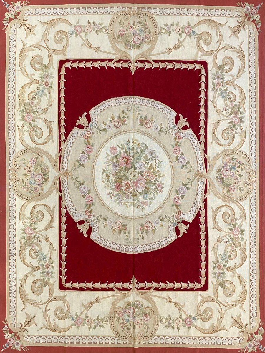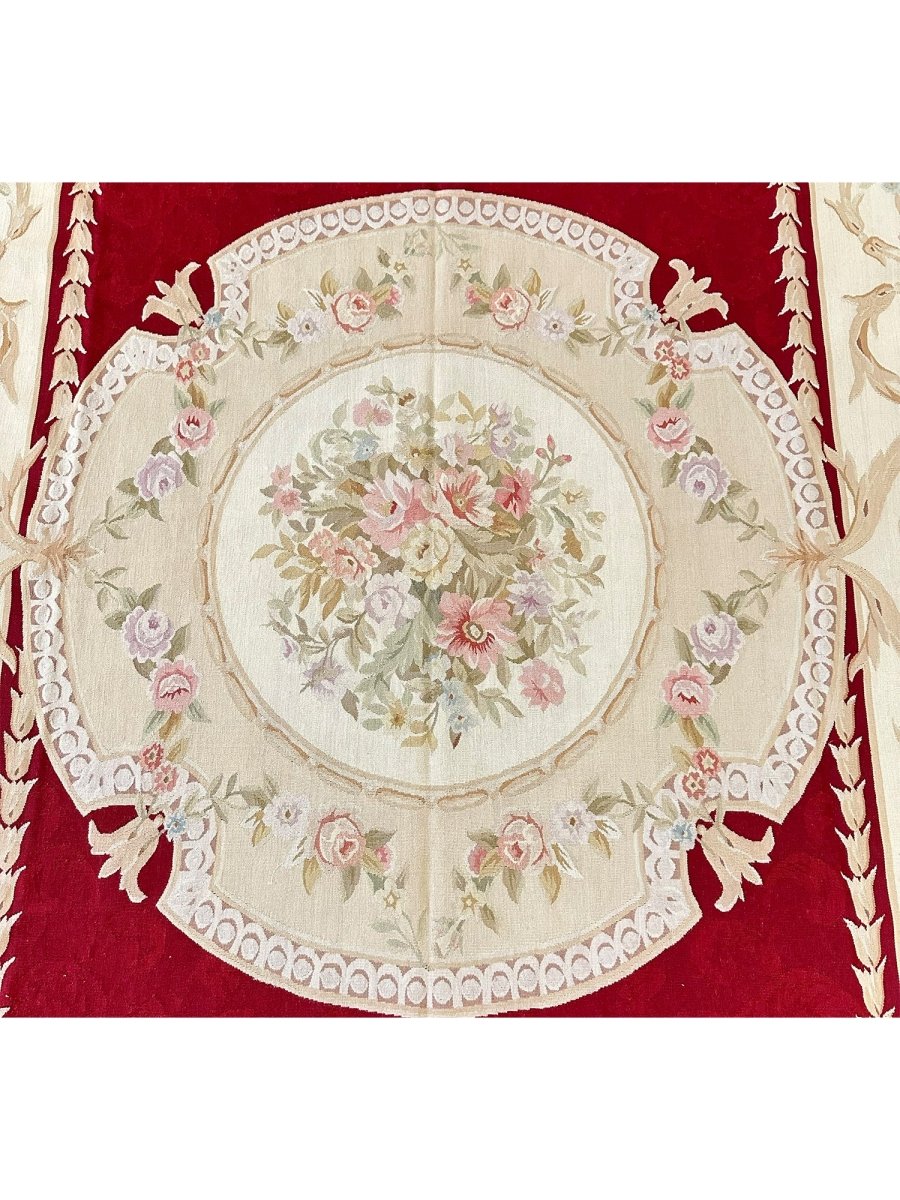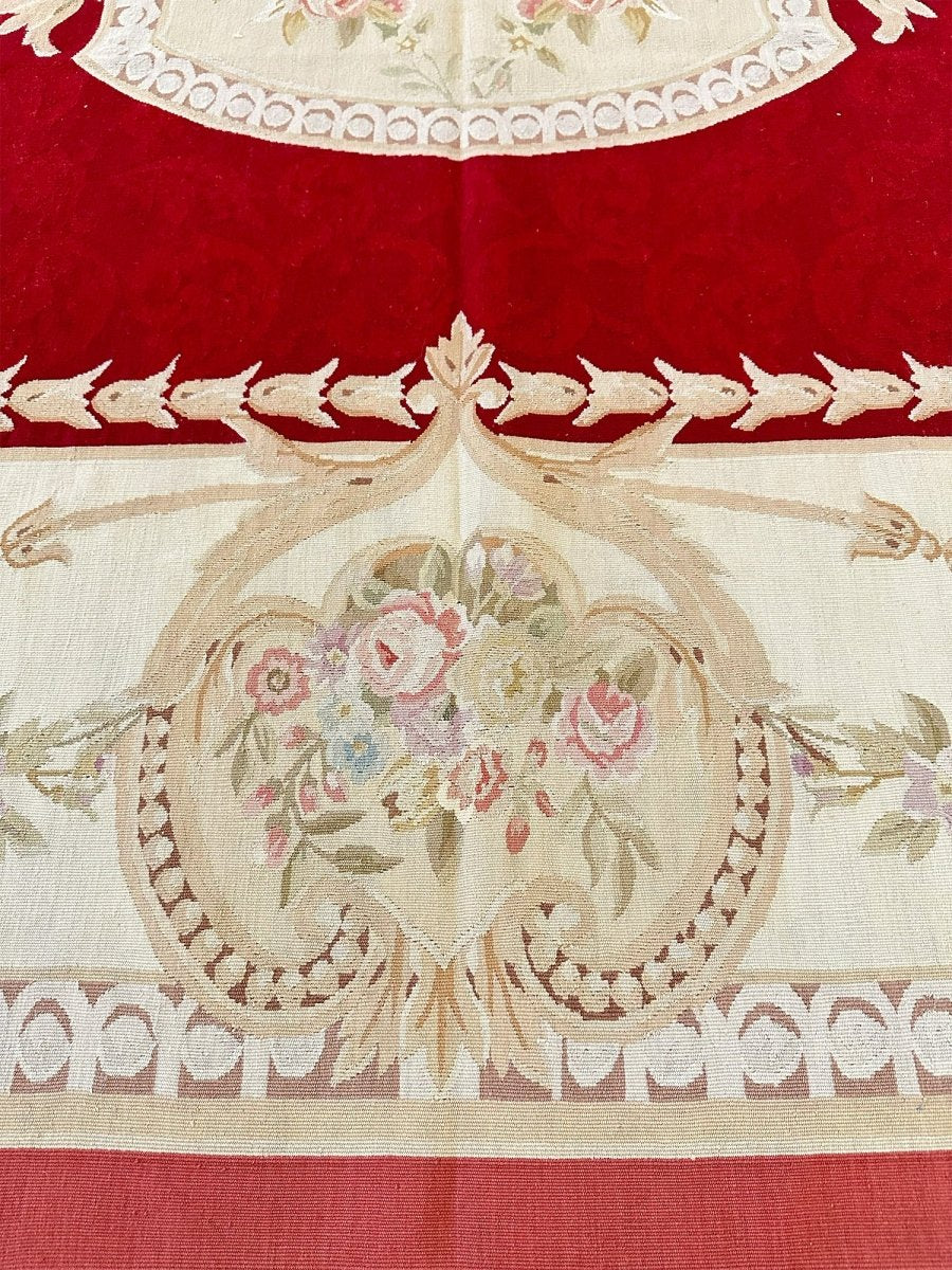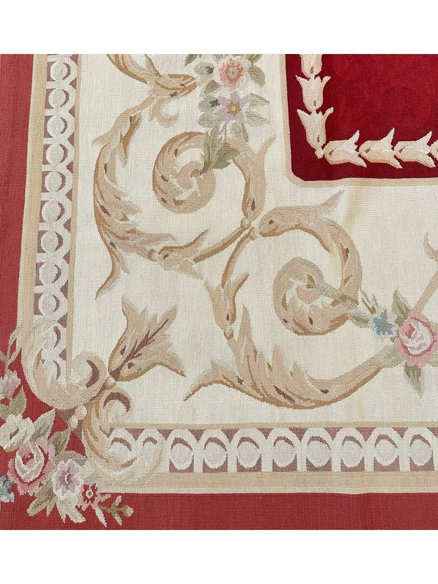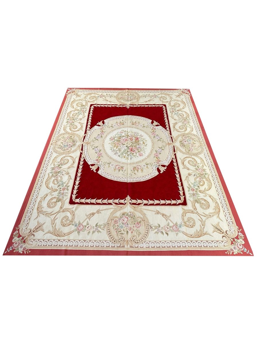 Elevate your living space with this exquisite 8x10 French Aubusson Style Area Rug, a luxurious hand-knotted piece crafted in China with classic European artistry. Designed in the spirit of traditional French elegance, the rug features a rich red field accented by graceful cream and beige tones that frame the composition with refined balance.