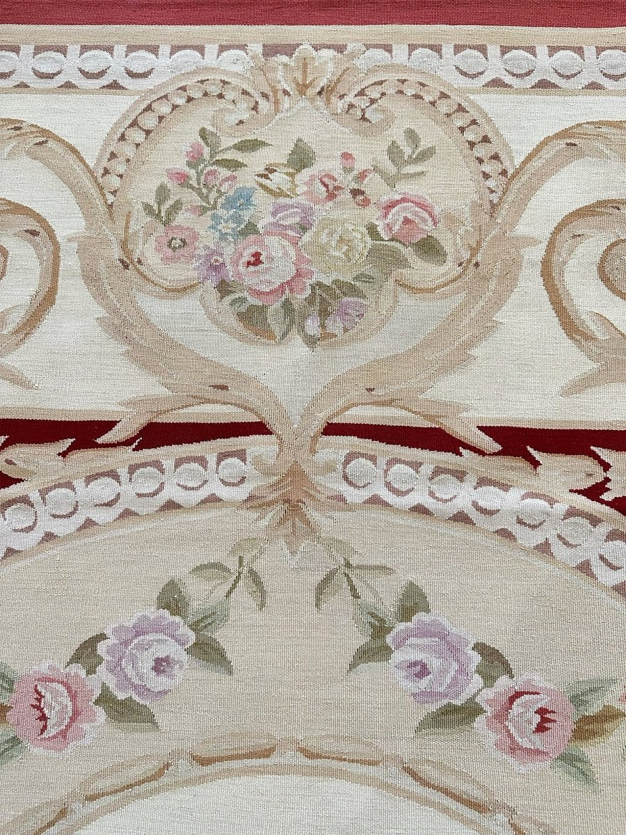 At the center, a floral medallion blooms with pastel roses and trailing vines, surrounded by ornate scrollwork and layered decorative borders reminiscent of historic Aubusson designs. The intricate detailing and harmonious color palette create a timeless, romantic aesthetic that brings depth and sophistication to any interior.