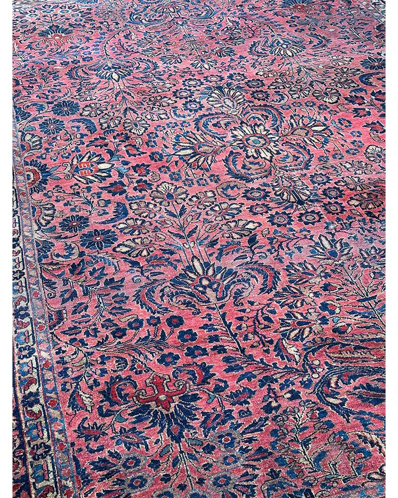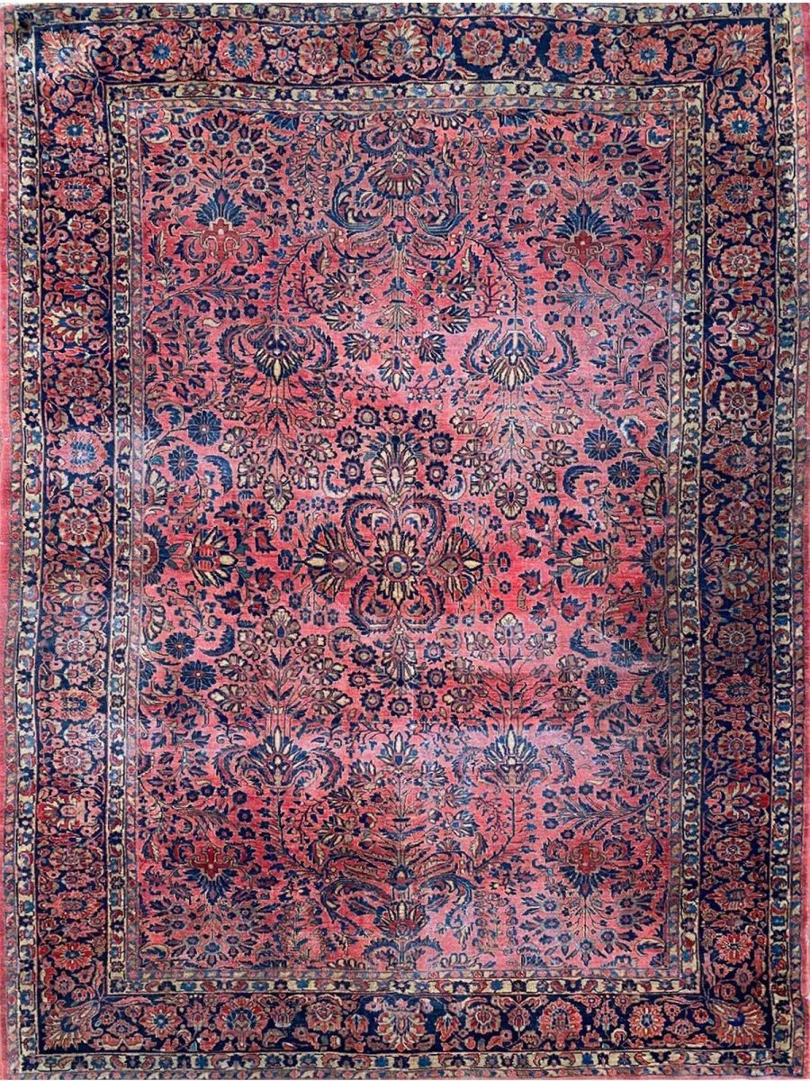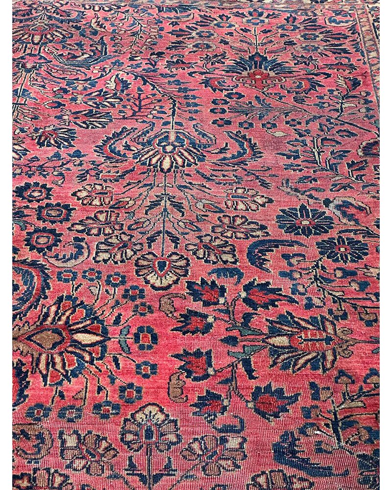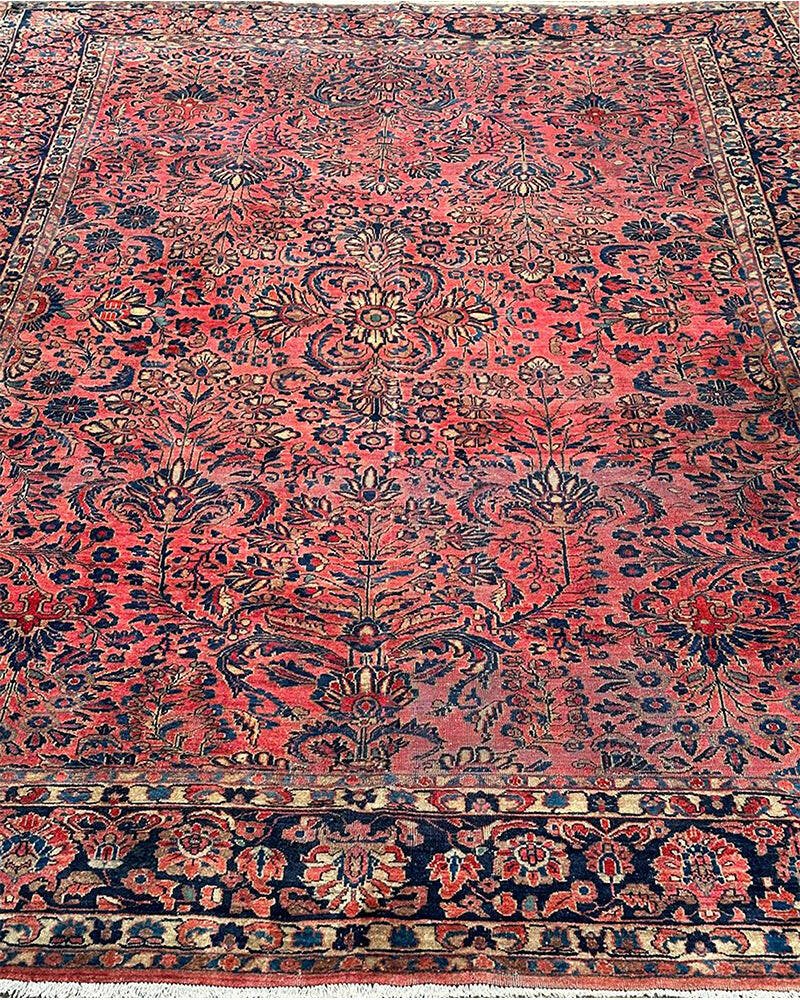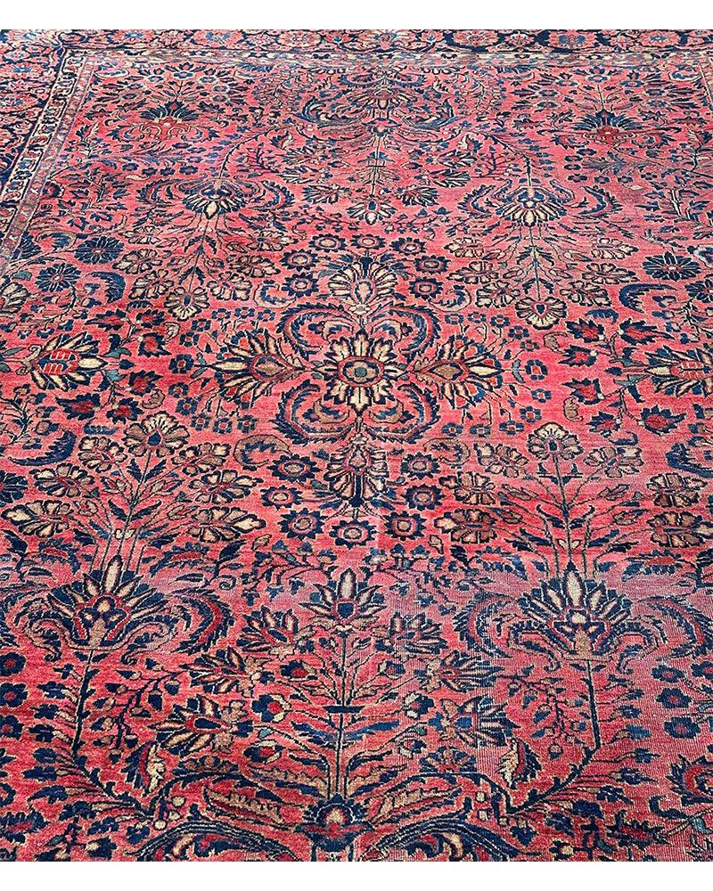 Step into a world of enduring beauty with this exquisite 8x11 Antique Persian Sarouk area rug. Hand-knotted with care in Persia, this piece features a captivating all-over floral pattern that fills the entire field with intricate design and detail. The dominant colors are a rich red, pink, and a deep blue, creating a classic and harmonious combination that speaks to the artistry of traditional Persian weaving. Crafted from fine wool, this Sarouk rug offers both durability and a soft underfoot feel, perfect for adding warmth and character to your living room, dining room, or entryway. Its substantial size makes it an ideal anchor for various furniture arrangements. Enjoy the convenience of free US shipping.