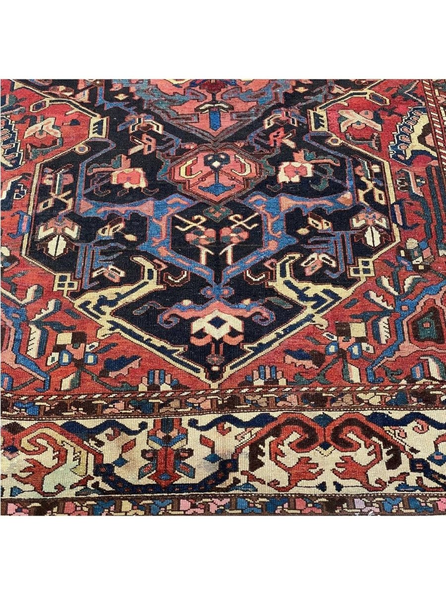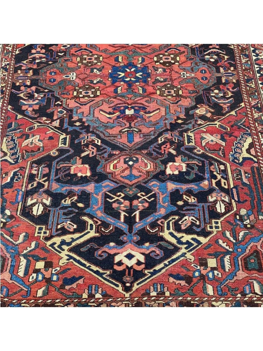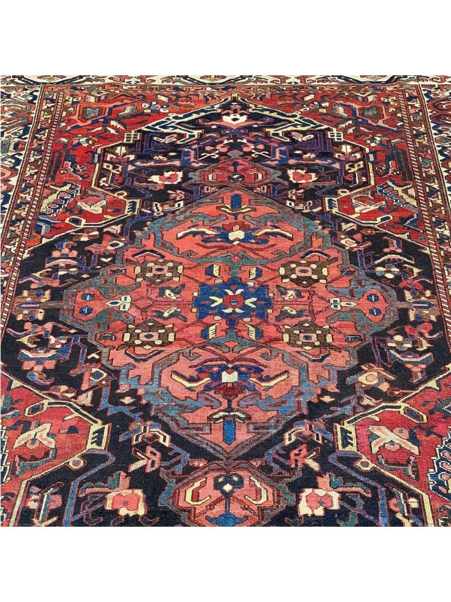 Add a touch of casual style to your home with 8x12 Antique Persian Bakhtiari Area Rug, crafted in Persia. This traditional rug features a captivating medallion pattern, showcasing a simple yet effective design in a red, navy blue, soft ivory, and black palette. Its durable wool construction ensures longevity and easy care, perfect for living rooms, bedrooms, and dining spaces. The clean finish reflects quality craftsmanship and design. This piece effortlessly brightens, adding warmth, texture, and a relaxed feel. A blend of simple design and function, it easily enhances any space. Enjoy the benefit of free shipping across the United States. Each rug offers a distinct look, with subtle variations inherent to its creation.