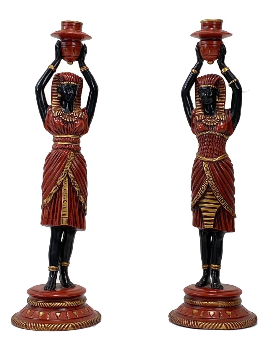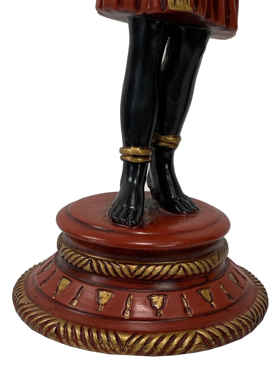 Pair of handcrafted Egyptian-inspired figurine candlesticks made from ceramic resin, featuring striking red, black, and gold accents. A bold decorative addition with functional candle-holding use.