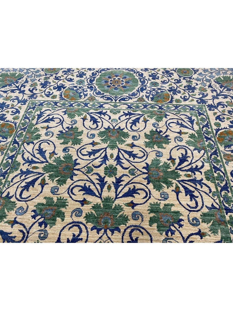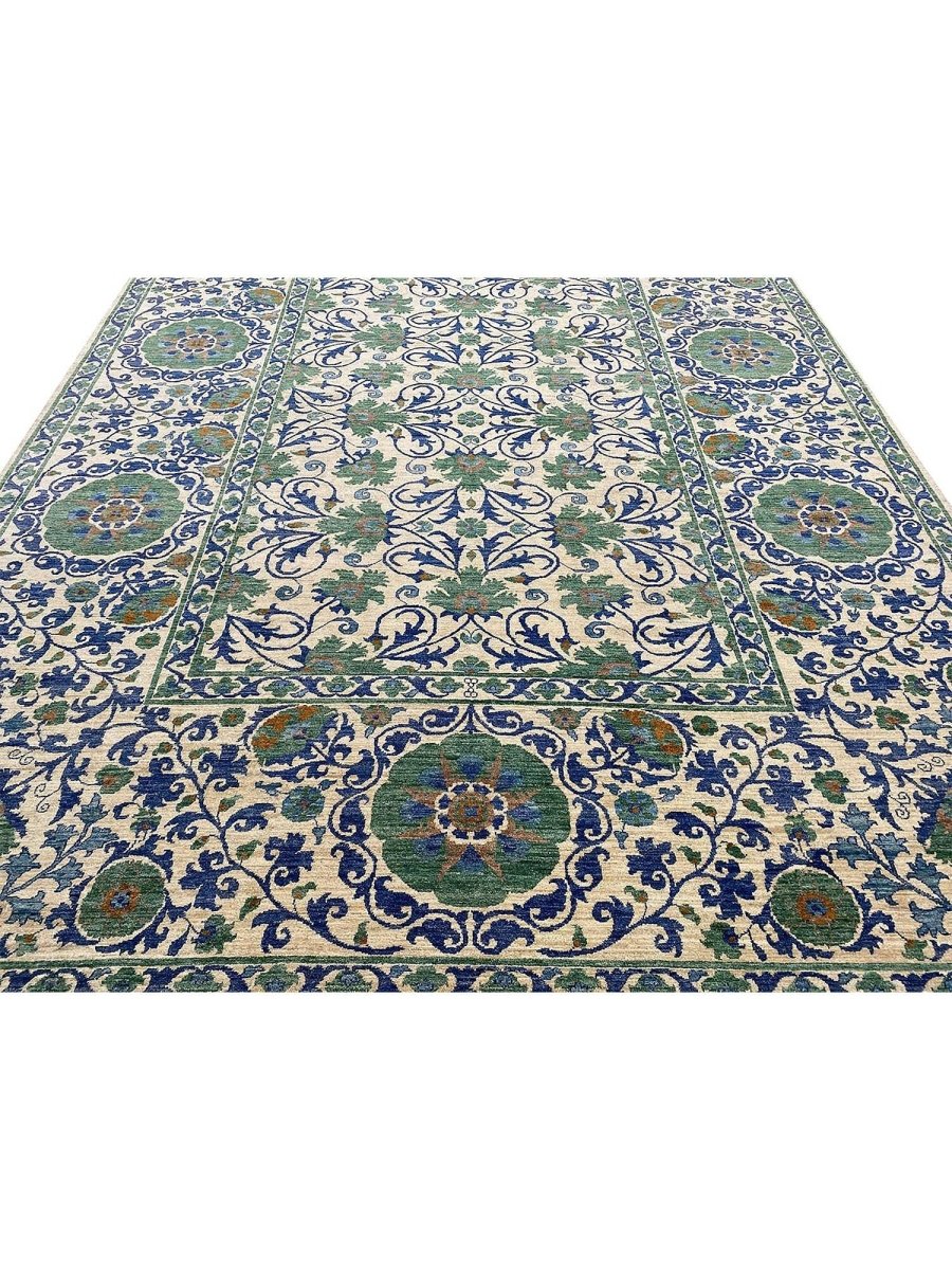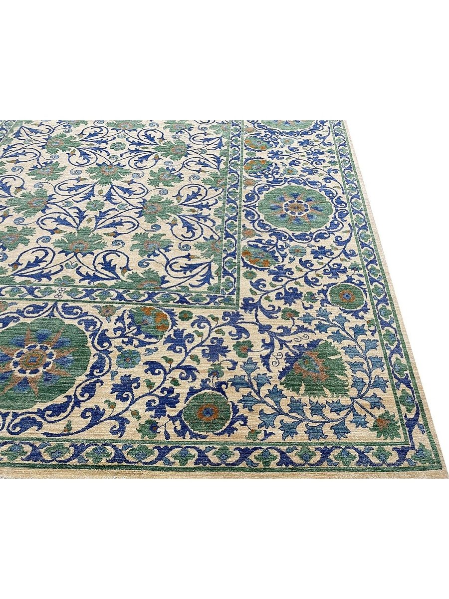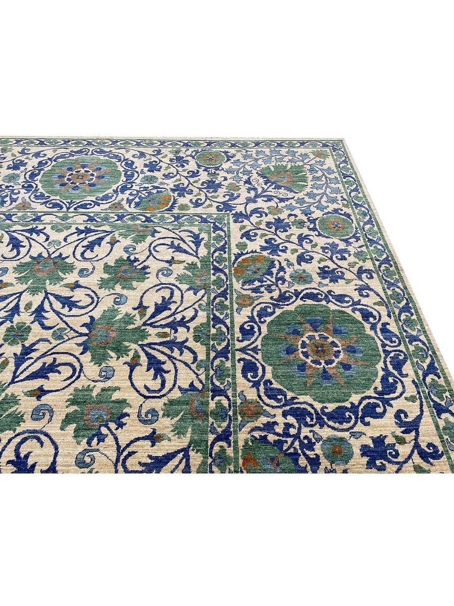 The 10x13 Transitional Suzani Area Rug is a timeless piece that brings warmth and refined elegance. Hand-knotted from premium-quality wool, this exquisite rug features a striking geometric design that adds depth, character, and visual interest. The harmonious blend of green, beige, brown, and blue tones creates a versatile palette that complements a wide range of interior styles. Crafted with exceptional attention to detail, this outstanding rug serves as both a functional foundation and a captivating work of art, sure to be admired for years to come. Enjoy the convenience of free shipping within the U.S., delivered directly to your home.