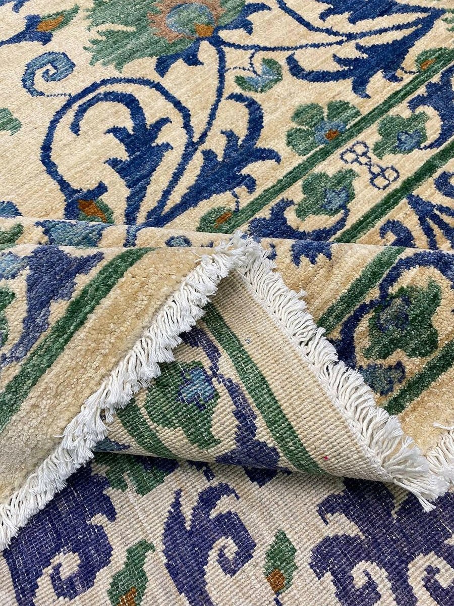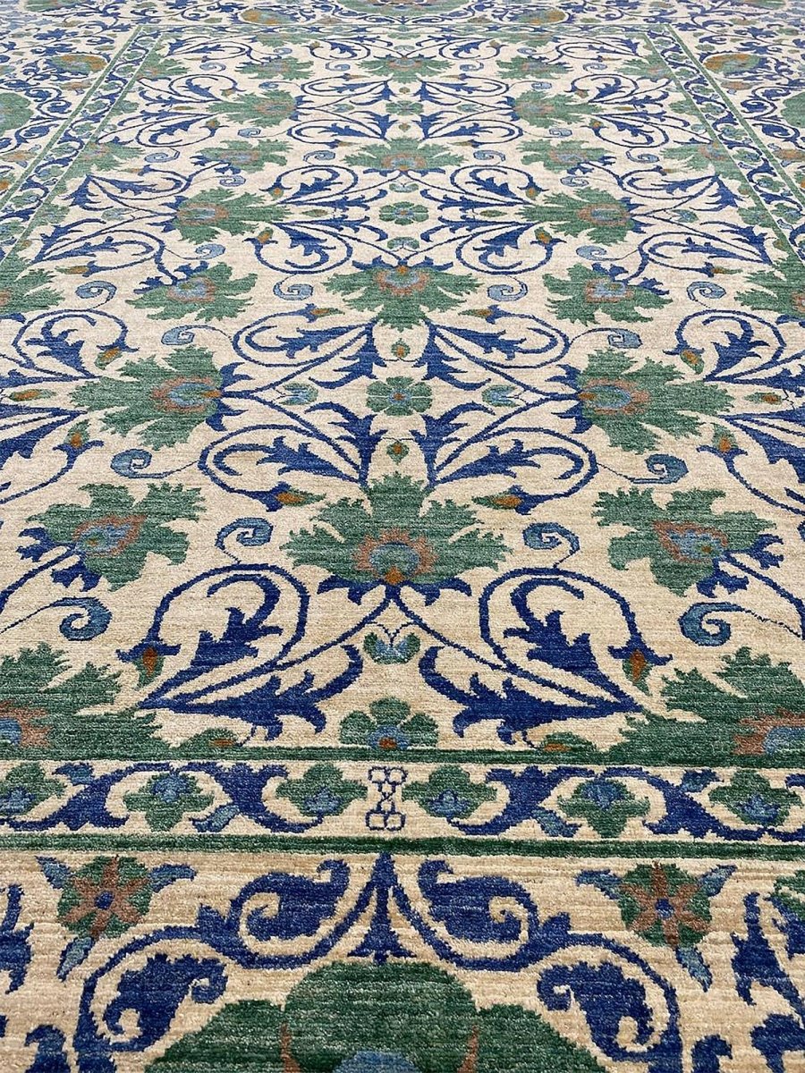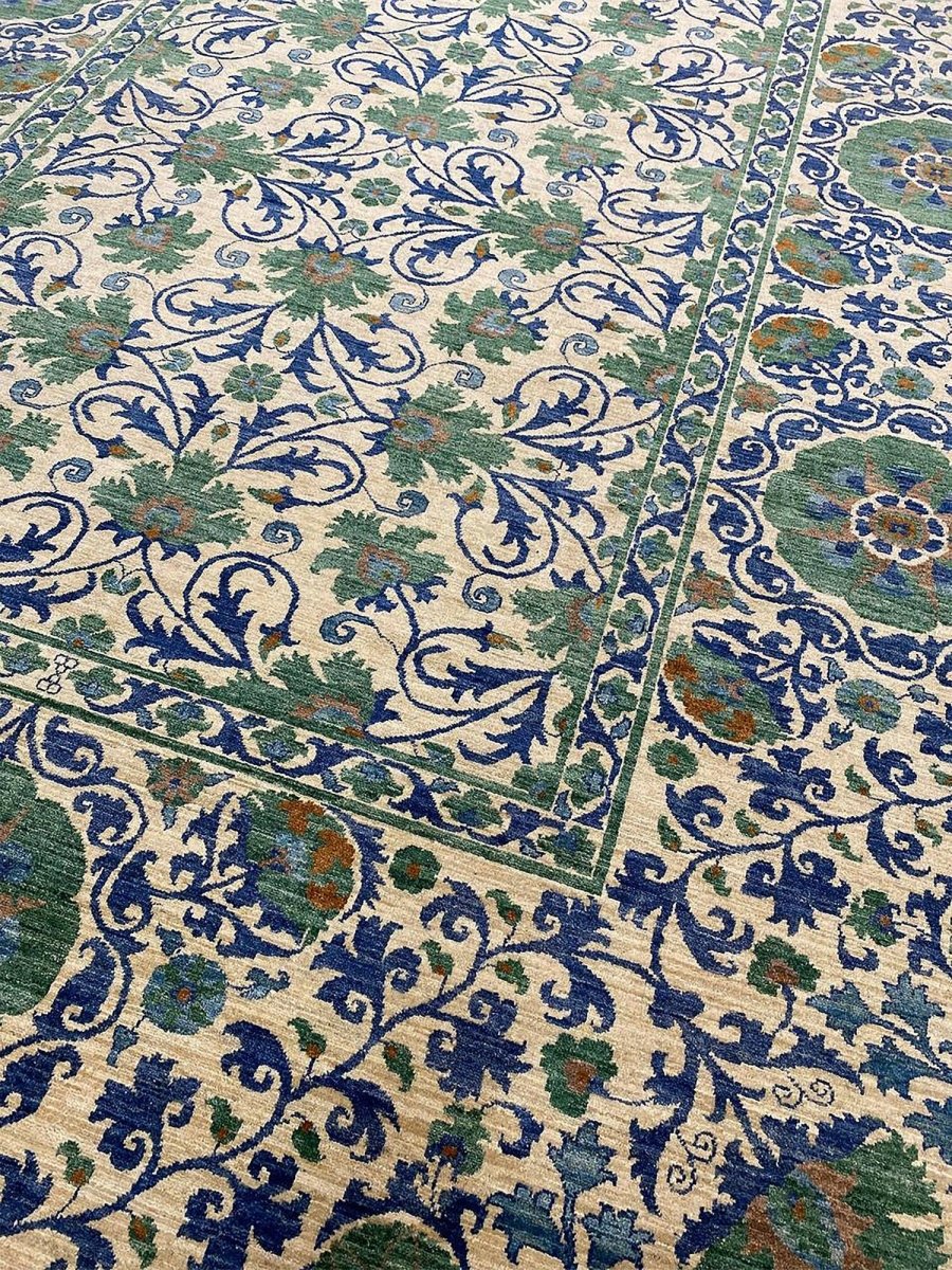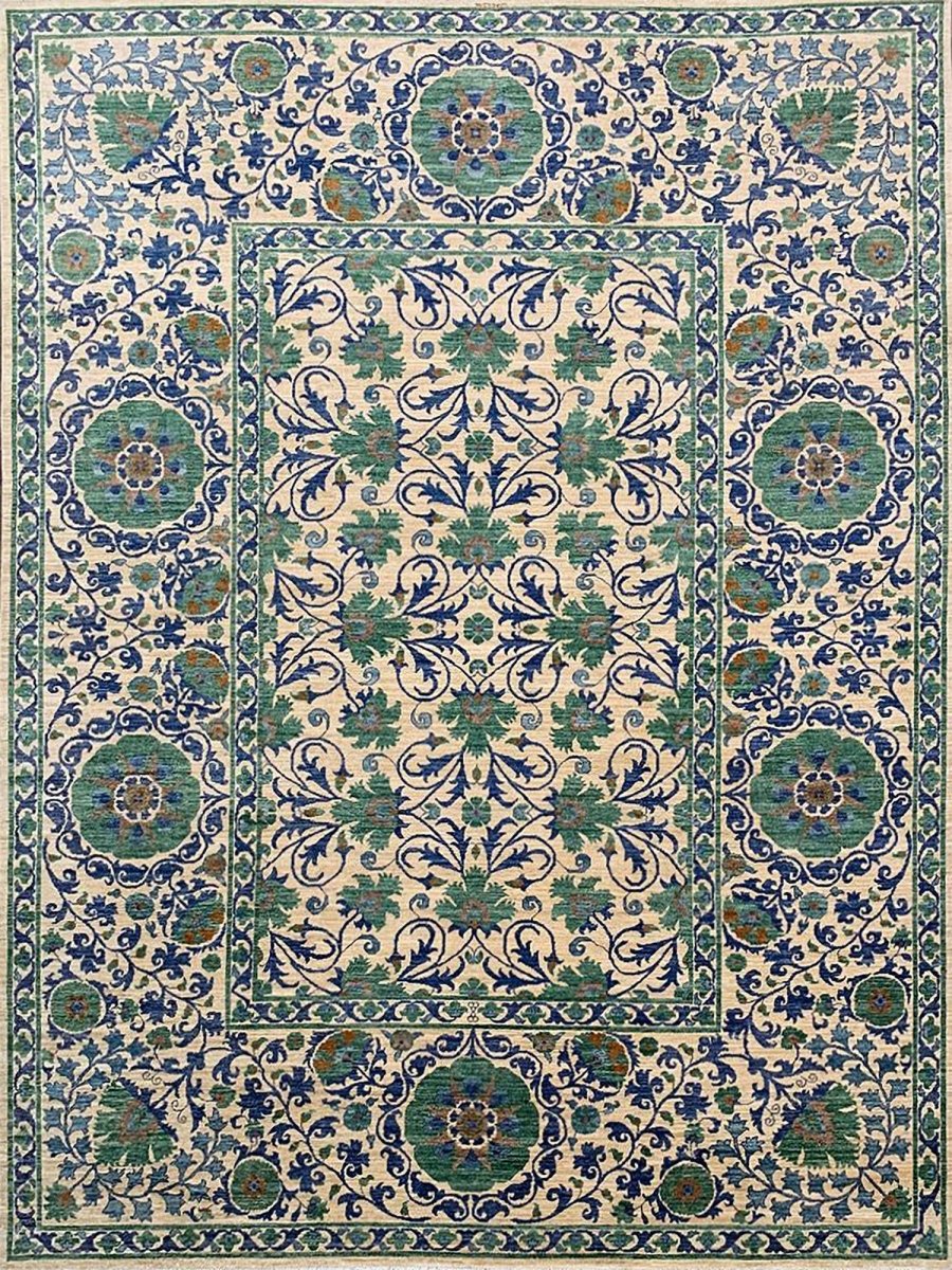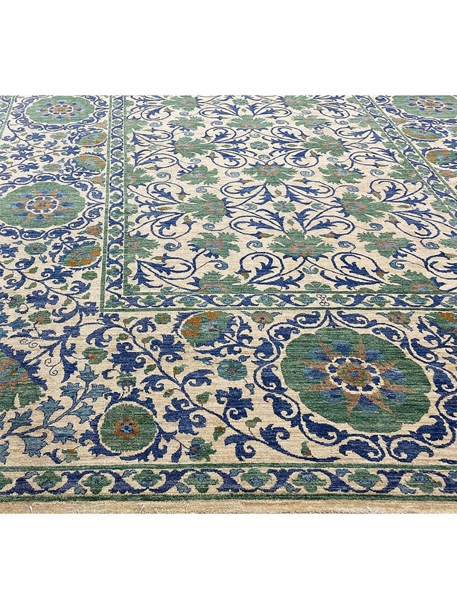 The 10x13 Transitional Suzani Area Rug is a timeless piece that brings warmth and refined elegance. Hand-knotted from premium-quality wool, this exquisite rug features a striking geometric design that adds depth, character, and visual interest. The harmonious blend of green, beige, brown, and blue tones creates a versatile palette that complements a wide range of interior styles. Crafted with exceptional attention to detail, this outstanding rug serves as both a functional foundation and a captivating work of art, sure to be admired for years to come. Enjoy the convenience of free shipping within the U.S., delivered directly to your home.